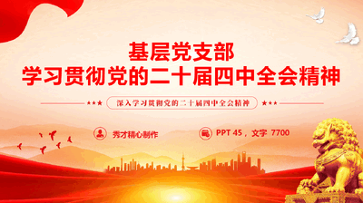 基层党支部学习贯彻党的二十届四中全会精神秀才精心制作 PPT 45,文字 7700前言党的二十届四中全会是在即将进入基本实现社会主义现代化夯实基础、全面发力的关键时期召开的一次十分重要的会议,全会通过的《中共中央关于制定国民经济和社会发展第十五个五年规划的建议》(以下简称《建议》)对未来五年发展作出顶层设计和战略擘画,是乘势而上、接续推进中国式现代化建设的又一次总动员、总部署,充分体现了以习近平同志为核心的党中央团结带领全党全国各族人民续写经济快速发展和社会长期稳定两大奇迹新篇章、奋力开创中国式现代化建设新局面的历史主动,必将对党和国家事业发展产生重大而深远的影响。1深刻领会十四五时期的辉煌成就2准确把握党中央对发展形势的科学判断 3全面领会十五五发展的宏伟方略4切实推动全会精神落地生根目录CONTENTS第一部分深刻领会十四五时期的辉煌成就一、深刻领会十四五时期的辉煌成就十五五的宏伟蓝图已经铺开,而这张蓝图的底气,源自我们刚刚走过的极不平凡的十四五时期。要想看清前方的路,首先要看懂脚下的路。这五年,面对风高浪急的国际环境和艰巨繁重的国内改革发展稳定任务,我们国家交出了一份足以载入史册的优异答卷。一、深刻领会十四五时期的辉煌成就(一)经济实力跃上新台阶,发展基本盘更稳在短短五年内,国家经济增量就超过了35万亿元。在全球经济复苏