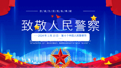 致敬人民警察···2024年1月10日·第4个中国人民警察节···经党中央批准、国务院批复,每年的1月10日为中国人民警察节。全国的人民警察终于有了自己的节日,这个一直以来负重前行、奉献牺牲的群体终于有了自己的高光时刻。忠/诚/为/民/无/私/奉/献节日简介01关于人民警察的元素02人民警察庆祝活动03致敬人民警察04目录··第一章··日介节简1月10日为中国人民警察节,长期以来,人民警察牢记使命、忠诚履职,不怕牺牲、无私奉献,用辛勤的汗水乃至宝贵的鲜血和生命,为捍卫政治安全、维护社会安定、保障人民安宁筑起了一道坚不可摧的铜墙铁壁。日介节简1月10日为中国人民警察节设立的背景人民警察队伍是一支有着光荣传统和优良作风的队伍,也是和平年代牺牲最多、奉献最大的队伍。长期以来,人民警察牢记使命、忠诚履职,不怕牺牲、无私奉献,用辛勤的汗水乃至宝贵的鲜血和生命,为捍卫政治安全、维护社会安定、保障人民安宁筑起了一道坚不可摧的铜墙铁壁。经党中央批准、国务院批复,每年的1月10日为中国人民警察节。全国的人民警察终于有了自己的节日,这个一直以来负重前行、奉献牺牲的群体终于有了自己的高光时刻。日介节简中国人民警察节设立的背景•新中国成立以来,全国仅公安机关人民警察队伍就有1.4万余名民警英勇牺牲,10余万名民警负伤,3700余名民警被评为烈士。在今年上半年疫情防控和维护安全稳定工作中,共有169名公安民警因公牺牲。•是在国家层面专门为人民警察队伍设立的节日,是对人民警察队伍为党和人民利益英勇奋斗的充分肯定。1.4万/余名民警英勇牺牲10万/余名民警负伤3700/余名民警被评为烈士169/名公安民警因公牺牲日介节简每年1月10日•2020年7月21日,《国务院关于同意设立中国人民警察节的批复》发布。•经党中央批准、国务院批复,自2021年起,将每年1月10日设立为中国人民警察节。日介节简为什么选用1月10日这一天?•将这一日期确立为中国人民警察节,体现了鲜明的政治性、广泛的人民性和警察职业的标志性。人民的保护神经过三十多年的实践与探索,110已经成为人民警察队伍的标志性品牌,被誉为人民的保护神。具有社会知晓度和群众认可度近年来,每年1月10日公安部及各地公安机关都组织开展多种形式的110宣传日活动,这一日期具有极高的社会知晓度和群众认可度。节日设立的意义日介节简健全完善人民警察荣誉制度和标志体系的重要举措。1增强广大民警职业荣誉感自豪感归属感。3对于推动人民警察队伍革命化正规化专业化职业化建设。2激励全警以强烈的担当精神履行好党和人民赋予的新时代使命任务。4··第二章··于人民警察的元素关1月10日为中国人民警察节,长期以来,人民警察牢记使命、忠诚履职,不怕牺牲、无私奉献,用辛勤的汗水乃至宝贵的鲜血和生命,为捍卫政治安全、维护社会安定、保障人民安宁筑起了一道坚不可摧的铜墙铁壁。于人民警察的元素关中国人民警察警徽国徽盾牌长城松枝飘带①国徽是国家的象征和标志;②长城和盾牌代表人民警察维护国家主权和领土完整、保护人民群众利益;③松枝代表人民警察坚韧不拔的革命意志。—— 01 ——中国人民警察警衔设五等十三级①总警监、副总警监②警监(一级、二级、三级)③警督(一级、二级、三级)④警司(一级、二级、三级)⑤警员(一级、二级)—— 02——于人民警察的元素关人民警察入警誓词我宣誓:我志愿成为中华人民共和国人民警察,献身于崇高的人民公安事业,坚决做到对党忠诚、服务人民、执法公正、纪律严明,矢志不渝做中国特色社会主义事业的建设者、捍卫者,为维护社会大局稳定、促进社会公平正义、保障人民安居乐业而努力奋斗!于人民警察的元素关人民警察十六字总要求服务人民对党忠诚纪律严明执法公正人民警察分类—— 01 ——巡逻警察是管理查处治安案件(事件)的警察,他们一般设置在派出所、及区县级(含)以上公安局治安队、处。主要任务是:预防、发现和制止违法犯罪;维护公共场所的治安秩序;管理特种行业;管理危险物品;处理一般违法案件等。—— 02 ——刑事警察广义的还包括经侦队、缉毒队等等。主要任务是:侦查刑事案件,日常听说的有盗窃、凶杀、诈骗、拐卖妇幼等犯罪案件。交通警察:交通管理警察大队工作的人民警察。交通警察是警察的一个警种。主要任务是:预防、发现和制止违法犯罪;维护公共场所的治安秩序;管理特种行业;管理危险物品;处理一般违法案件等。人民警察分类—— 03 ——交通警察人民警察分类—— 04 ——治安警察治安警察有人称巡逻警察为市民的保护神,因为他们总是在市民的身边,能给人更多的安全感。—— 05 ——特种警察特种警察是警方的一个担负某些特殊任务的警种,特警是警察中的特种精英。专门负责各种特别的危险任务。人民警察分类