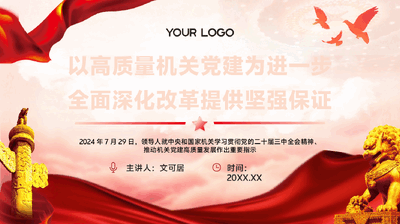 主讲人:文可居时间:20XX.XX以高质量机关党建为进一步全面深化改革提供坚强保证2024年7月29日,领导人就中央和国家机关学习贯彻党的二十届三中全会精神、推动机关党建高质量发展作出重要指示前言PREFACE党的二十届三中全会紧紧围绕推进中国式现代化这一主题,对进一步全面深化改革作出了系统部署。2024年7月29日,领导人就中央和国家机关学习贯彻党的二十届三中全会精神、推动机关党建高质量发展作出重要指示,为学习贯彻三中全会精神、推动机关党建高质量发展指明了前进方向。要一体学习贯彻全会精神和领导人重要指示精神,推动甘肃省直机关党组织和党员干部在以改革创新精神推动机关党建高质量发展中展现新担当新作为,为实现领导人擘画的甘肃现代化建设蓝图提供坚强保证。01把准改革政治方向,当好践行两个维护的排头兵02常态长效深学实干,着力锻造锐意改革的生力军03持续夯实基层基础,建强改革任务落实的火车头04坚持正风肃纪反腐,打好优化改革环境的主动仗目录CONTENTS01把准改革政治方向当好践行两个维护的排头兵第一部分:把准改革政治方向,当好践行两个维护的排头兵学习贯彻二十届三中全会精神01以更高站位强化政治引领总原则党的二十届三中全会通过的《中共中央关于进一步全面深化改革、推进中国式现代化的决定》,把坚持党的全面领导、坚定维护党中央权威和集中统一领导放在进一