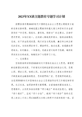 2023年XX镇主题教育专题学习计划按照县委开展XXX新时代中国特色社会主义思想主题教育方案的总体安排部署,准确把握主题教育的重大意义和目标任务全面落实好学思想、强党性、重实践、建新功的总要求,坚持学思用贯通、知信行统一,达到凝心铸魂筑牢根本、锤炼品格强化忠诚、实干担当促进发展、践行宗旨为民造福、廉洁奉公树立新风的目标,切实把理论学习、调查研究、推动发展、检视整改贯通起来,有机融合、一体推进,迅速全面兴起学习热潮,确保取得实实在在的成效,特制定如下专题学习计划。一、总体要求坚持持续学深悟透XXX新时代中国特色社会主义思想,掌握党的创新理论的深度,不断增进对党的创新理论的政治认同、思想认同、理论认同、情感认同,真正把马克思主义看家本领学到手不断提高政治敏感的程度、思维视野的广度、思想境界的高度,自觉用XXX新时代中国特色社会主义思想指导各项工作通过细学深思,求正求真,读原著学原文悟原理,全面准确把握真谛真义、思想精华,从而更加深刻领悟两个确立的决定性意义,增强四个意识、坚定四个自信、做到两个维护始终在思想上政治上行动上同以XXX同志为核心的党中央保持高度一致。坚持用XXX新时代中国特色社会主义思想凝心铸魂,把握中国化时代化马克思主义的世界观和方法论,坚持好、运用好其中的立场观点方法,做到知其言更知其义,知其然更知其所以然,完整、准确、全面贯彻新发展理念,努力在以学铸魂、以学增智、以学正风、以学促干方面取得实实在在的成效.二、重点学习内容(一)深刻领会XXX新时代中国特色社会主义思想的核心要义XXX新时代中国特色社会主义思想,运用马克思主义立场观点方法聚焦新的时代命题,凝结新的思想精华,总结开创性独创性的实践经验,以崭新的思想内容丰富和发展了马克思主义,形成了一个系统全面、逻辑严密、内涵丰富、内在统一的科学理论体系。要在学思践悟中深入领会XXX新时代中国特色社会主义思想的精髓要义,坚持好、运用好贯穿其中的立场观点方法,切实贯彻落实到党和国家工作各方面全过程。理解把握其世界观和方法论,并用于指导解决实际问题,不断回答中国之问、世界之问、人民之问、时代之问;认真学习领会六个坚持深刻把握其丰富内涵和精神实质,时刻站稳人民立场、把握人民愿望、尊重人民创造集中人民智慧;把坚定四个自信作为思想和行动自觉,以更加积极的历史担当和创造精神去成就新时代的伟业;善于从XXX新时代中国特色社会主义思想的精髓要义中找思路、找启迪、找答案,坚持知行合一,练就过硬本领,逢山开路遇水架桥,在破解难题中推进事业发展;要善于透过历史看现实、透过现象看本质,把握好全局和局部、当前和长远、宏观和微观、主要矛盾和次要矛盾、特殊和一般的关系,前瞻性思考、全局性谋划,整体性推进各项事业高质量发展。(二)深入领会和全面把握党的XX大精神。党的XX大深刻总结了党的十八大以来十年来所取得的巨大成就和伟大变革,科学谋划了今后五年乃至更长一段时期党和国家事业发展的目标任务和大政方针,并对实现目标任务作出了战略部署,充分体现了时代的新变化,符合新时代的实践要求,为我们全面建成社会主义现代化强国、全面推进中华民族伟大复兴指明了方向,为我国新时代经济社会发展提供了重要遵循、战略指引。深刻领会,大会主题明确宣示了我们党在新征程上带领人民举什么旗、走什么路以什么样的精神状态、朝着什么样的目标继续前进等事关全局、事关未来的重大问题;深刻领会过去五年和新时代十年的伟大变革,其根本就在于有XXXXXX作为党中央的核心、全党的核心掌舵领航,深刻领悟两个确立的决定性意义,切实在思想上政治上行动上同以XXX同志为核心的党中央保持高度一致。牢牢把握XXX新时代中国特色社会主义思想的世界观和方法论;深刻领会马克思主义中国化时代化新的飞跃。为新时代党和国家事业发展提供了根本遵循,这是当代中国共产党人观察时代、把握时代、引领时代的思想武器和行动指南;深刻领会新时代新征程中国共产党的使命任务。从理论和实践上讲清了什么,是中国式现代化,体现了以中国式现代化推进中华民族伟大复兴的坚定立场;深刻领会团结奋斗的时代号召,面对新的伟大征程只要全党、全国各族人民心往一处想、劲往一处使,团结奋斗的中国,就一定能在新的赶考之路上书写更美的时代篇章,创造新的令世界刮目相看的人间奇迹;深刻领会以伟大自我革命引领伟大社会革命的清醒执着,充分彰显了我们党一以贯之坚持自我革命的鲜明品格和政治决心,必将进一步提升党的执政能力和领导水平,更好助力党的历史使命胜利实现。(三)深入学习贯彻XXXXXX关于调查研究的重要论述精神。为深入学习贯彻XXX新时代中国特色社会主义思想,全面贯彻落实党的XX大精神,党中央决定,在全党大兴调查研究作为在全党开展主题教育的重要内容,推动全面建设社会主义现代化国家开好局起好步。要大力弘