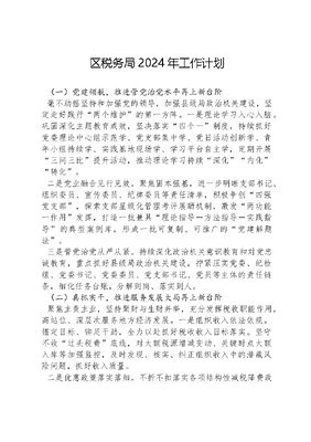 区税务局2024年工作计划(一)党建领航,推进管党治党水平再上新台阶毫不动摇坚持和加强党的领导,加强县级局政治机关建设,坚定走好践行两个维护的第一方阵。一是理论学习入心入脑。巩固深化主题教育成效,坚决落实四个一制度,持续抓好党委理论中心组示范学、党支部集中学、党日活动创新学、青年小组持续学、实践基地现场学、学习平台自主学,定期开展三问三比提升活动,推动理论学习持续深化内化转化。二是党业融合见行见效。聚焦固本强基,进一步明晰支部书记、组织委员、宣传委员、纪律委员等责任清单,积极争创四强党支部,探索支部星级化管理考评展晒机制,激发两功能一作用发挥,打造一批兼具理论指导-方法指导-实践指导的典型案例库,形成一批可复制、可推广的党建解题法。三是管党治党从严从紧。持续深化政治机关意识教育和对党忠诚教育,重点抓好县级局政治机关建设,拧紧压实党委、纪检组、党委书记、党委委员、党支部书记、党员等主体的责任链条,细化任务台账,分解到岗、落实到人。(二)真抓实干,推进服务发展大局再上新台阶聚焦主责主业,坚持聚财与生财并举,充分发挥税收职能作用,高站位、深层次服务地方经济发展。一是组织收入依法依规。锚定目标、铆足干劲,全力以赴抓好税收收入目标落实。坚守不收过头税费底线,对大额税源增减变动、关键时点大额入库等加强监控,及时发现、核实、纠正组织收入中的潜藏风险问题,抓好收入质量。二是优惠政策落实落细。不折不扣落实各项结构性减税降费政策,抓好政策的跟踪、提示、引导,持续为市场主体强信心、减负担、添活力。依托大数据靶向聚焦税费优惠政策,开展疑点核查,切实解决应享未享、应退未退等问题,进一步降低市场主体税费负担。三是税收分析做优做精。重点围绕宏观经济运行和经济税源发展态势,聚焦XX3+2产业集群、生产性服务业集群、10大主题楼宇、1+5数字经济等发展主题,关注经济运行、行业发展和减税降费等重点课题,持续开展常态化、专题化宏观税负分析、经济税源分析、区域比较分析、政策效应分析、数理统计分析,打造一批具有XX税务特色的分析拳头产品,为区委区政府优化产业布局、提高招商引资质量提供科学参考,不断擦亮税眼看XX以税资政智库品牌。(三)固本强基,推进税费风险防范再上新台阶今年是深化税收征管改革的巩固提升之年,坚持守正创新、数据赋能,切实提升风险防控能力和水平,打造高效统一的税费征管格局。一是改革试点走深走实。巩固现代化税收风险防控体系改革试点成效,稳步推进数电发票用户纯电率开票率提升;持续强化三大中心建设,探索任务池管理模式,通过疑点标签实现人员能力要素与任务需求精准匹配。二是税费治理真抓真管。货劳税方面,规范农产品、废旧物资收购发票归类使用,加大虚开、环开发票监管,规范成品油提级监管,提升终端消费品开票率,促进税收遵从。三是风险管理唯实唯干。通过数治手段前移风险防控关口,开展数电票、税收优惠政策落实、财政补贴等高风险领域专项税收监管,对在欠税管理、税务注销等关键环节风险新型避税实施精准阻断。(四)蓄能增效,推进税收营商环境再上新台阶坚持以人民为中心的发展理念,牢固树立和践行造福人民的政绩观,始终以纳税人缴费人满意度为前进目标,实现税收营商环境的提质增效。一是基础管理抓实抓长。围绕欠税管理、市场主体活跃度、已登记未办税清理、非正常户异地协作等基础管理事项,坚持问题导向、结果导向。二是纳税服务求精求准。加强税费服务运营中心建设,持续做好营商环境指标监测,加力拓宽征纳服务渠道,统筹抓好各类税费服务任务的实体化、集约化、智能化处理,以数据赋能提高精准推送效率,力争让政策找人找得更快、更准。三是税收执法公平公正。聚焦土地增值税清算、注销清算、优惠政策落实等重点事项回头看,确保三年全覆盖,推动实现执法责任三个转变。(五)扎实踏实,推进干部队伍建设再上新台阶加强干部队伍建设,以更加坚定的信心增强斗争本领,以更加丰富的举措提高干部素质,以更加坚实的保障激发队伍活力,锻造忠诚干净担当的税务铁军。一是干部培养同心同向。加强干部全生命周期培养和管理,建强专业化团队,抓实比武储备选手和岗位能手队伍建设。二是综合监督加力加效。继续探索纪检+监督模式,充分发挥纪检组、机关纪委和派出机构监督组等三种力量。规范监督建议书和纪律检查建议书的使用。三是凝聚合力向上向善。践行社会主义核心价值观,用好新时代学习实践中心阵地,举行青税扬帆岗位建功、薪火相传荣退入职仪式、文明有礼实践活动,发挥工团妇等群团组织的工作职能,厚植真诚文化理念,不断提升干部干事创业的精气神。