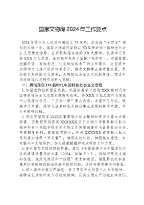国家文物局2024年工作要点2024年是中华人民共和国成立75周年,是实施十四五规划的关键一年。国家文物局将坚持以XXX新时代中国特色社会主义思想为指导,全面贯彻落实党的XX大精神,认真学习贯彻XXX文化思想,落实党中央关于坚持保护第一、加强管理、挖掘价值、有效利用、让文物活起来的工作要求,全面提升文物和文化遗产保护传承水平,推进文物事业高质量发展,更好担负起新的文化使命,为铸就社会主义文化新辉煌、建设中华民族现代文明作出更大贡献。一、贯彻落实XXX新时代中国特色社会主义思想1.加强党的创新理论武装。巩固拓展学习贯彻XXX新时代中国特色社会主义思想主题教育成果,将XXX文化思想作为党组中心组理论学习、三会一课重点内容,丰富学习形式,提高学习质量,将学习成果转化为推动事业发展的具体举措。举办专题研讨班。2.坚决贯彻落实XXXXXX重要指示批示精神和党中央重大决策部署。坚持把贯彻落实XXXXXX关于文物工作重要指示批示精神和党中央国务院关于文物工作决策部署作为首要政治任务,完善制度机制,提高落实能力,开展XXXXXX重要指示批示贯彻落实情况回头看,确保实效长效。加强城乡建设、乡村振兴中文物保护,加大援藏援疆和定点帮扶工作力度。3.提升基层党组织建设质量。落实《全面提高中央和国家机关党的建设质量行动方案(2024—2026年)》,持续开展党支部标准化、规范化建设和四强党支部建设,增强局机关和直属单位党组织的政治功能和组织功能。适时开展党建专项督查。4.深入推进全面从严治党。学习贯彻中央纪委三次全会精神。持续深化落实中央八项规定精神。压实全面从严治党主体责任,严格执行《国家文物局党组书记对机关司室和直属单位一把手开展监督谈话工作办法(试行)》。加强党风廉政建设,严肃查处违纪违法问题。扎实开展日常监督谈话,做深做实年轻干部廉洁教育。5.持续深化政治巡视。巩固中央巡视整改成效,全面梳理整改任务落实情况,优化完善整改机制。组织开展党组第二轮巡视。推动纪检监督、组织监督、巡视监督、审计监督贯通融合。二、坚持保护第一,提高文物保护管理水平6.加强文物法治建设。配合《中华人民共和国文物保护法》修订,推进历史文化遗产保护法立法进程,研究起草长城保护条例修订草案,推进大运河文化遗产、红色文化资源保护法规建设。加强中华司法研究会文物司法分会和专家委员会、文物立法普法联系点建设。加强文物立法统筹规划。7.加大改革统筹和规划落实力度。健全国家文物局全面深化改革领导小组工作机制,建立健全中长期规划实施协调机制,持续推进文物保护利用改革,统筹推进《国民经济和社会发展第十四个五年规划和2035年远景目标纲要》《十四五文物保护和科技创新规划》等重要任务和重大工程项目。推广第一批国家文物保护利用示范区创建经验,开展第二批示范区中期督导。推介国家文化地标。8.加大文物督察和执法检查力度。开展全国重点文物保护单位卫星遥感执法监测。督促省级文物部门落实督察职责,指导市、县文化市场综合执法队伍落实文物行政执法责任,抽查检查地方重大文物违法犯罪案件办理和重大文物安全事故处理工作。开展长城、石窟寺保护管理问题专项整治。开展全国文物行政处罚案卷评查和文物违法信息举报受理工作。9.加强文物安全管理。发挥全国文物安全工作部际联席会议和打击防范文物犯罪工作组作用,强化部门协作,落实《全国文物安全工作部际联席会议重点工作清单(2023—2025年)》,持续开展专项行动,联合发布打击文物犯罪典型案例。推进文物安全政府主体责任落实,推动文物安全考核机制向市、县等基层政府下沉。全面推进落实文物博物馆单位文物安全直接责任人公告公示制度。部署开展文物系统安全生产治本攻坚三年行动,开展重大文物火灾隐患督导检查。开展第六届最美文物安全守护人推介活动。10.全面推进第四次全国文物普查。印发普查方案、标准规范等文件,研发普查系统与采集软件。开展国家级普查试点和普查培训,指导各级普查培训工作。组织各地开展实地调查,以县域为基本单元对三普登录不可移动文物进行复查,对已掌握的线索、普查过程中新发现文物进行调查登记。开展实地调研督导和违法案件督察督办,加强技术指导与质量监管。11.推进文物资源管理。启动第九批全国重点文物保护单位申报遴选工作。推进不可移动文物空间利用专项规划体系建设。会同住房城乡建设部公布第八批中国历史文化名镇名村,报请国务院公布若干国家历史文化名城。加大首都功能核心区文物保护利用力度,完成《首都功能核心区文物保护利用总体工作方案》。12.提高文物建筑保护管理水平。扎实推进应县木塔重大专项,开展佛光寺、故宫、曲阜三孔、劝业场等文物建筑保护研究示范项目,启动营造中国计划。有序推进廊桥保护行动。出台《国家文物局应对自然灾害分级分类响应预案》《文物建筑预防性保护工作规