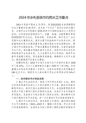2024年水利系统节约用水工作要点2024年是新中国成立75周年,是XXXXXX发表保障国家水安全重要讲话10周年,是完成十四五规划任务的关键之年。全国节水工作坚持以XXX新时代中国特色社会主义思想为指导,在部党组的坚强领导下,完整、准确、全面理解和贯彻XXXXXX节水优先、空间均衡、系统治理、两手发力治水思路和治水重要论述,落实全面节约战略和节水优先方针,紧紧围绕新阶段水利高质量发展主题和国家水安全保障目标,建立健全节水制度政策,严格总量强度双控管理,全面实施国家节水行动,推动重点领域区域节水优先、深度节水控水攻坚和精细精准节水走深走实,大力发展节水产业和科技,推进节水数字化智慧化建设,强化监督考核激励,持续提升全民节水意识,高质量推进节水型社会建设。预期目标是:2024年全国万元国内生产总值用水量比2020年下降13%,万元工业增加值用水量比2020年下降13%,农田灌溉水有效利用系数进一步提升,力争年非常规水利用量超过180亿立方米,地级及以上缺水城市再生水利用率达到24%以上。一、加快健全节水制度政策1.健全节水法规体系。推进《节约用水条例》立法,制定水利部贯彻落实条例分工方案和宣贯工作方案,做好条例宣传解读和培训。协同开展水法修改相关工作。各流域管理机构和省级水行政主管部门要扎实做好本流域、本地区节水条例宣传贯彻落实。各省级水行政主管部门要结合实际,推动制修订本行政区域地方性节水法规,进一步完善地方节水制度政策体系。2.健全节水规划体系。结合国家五年规划,组织制定国家节水中长期规划(2025—2035年)编制工作方案,牵头有关部门开展前期研究。各省级水行政主管部门要配合做好前期各项专题研究,适时启动下一轮省级规划编制工作。各流域管理机构要抓紧研究提出流域内节水中长期工作布局和战略安排。3.健全用水定额体系。研究制定用水定额和节水标准制修订工作计划(2025—2027年)。组织制修订5项以上工业服务业用水定额国家标准,指导地方制修订150项以上省级用水定额。各省级水行政主管部门要动态修订完善省级用水定额体系,在取水许可、节水评价等环节严格执行用水定额。4.探索用水预算管理试点。组织开展用水预算管理试点,选择5个左右省份开展以省级、地市级、县级为单元的国家用水预算管理试点,推进结构化用水管理。试点地区水行政主管部门要加强组织实施,科学编制试点实施方案,扎实推进试点工作,及时总结经验,形成可推广可复制的管理制度体系。各省级水行政主管部门可因地制宜组织开展本区域用水预算管理试点。积极探索开展用水审计工作。5.推进建立节水统计调查制度。结合用水统计调查制度,制定节水统计调查工作方案,完善用水单位名录库,科学设定节水统计指标,推动发布《中国节约用水报告》。各省级水行政主管部门要加快建立本区域节水统计调查制度,认真做好节水统计报表填报工作。各流域管理机构要结合实际,探索开展流域节水统计调查工作。二、严格总量强度双控管理6.严格总量强度指标管控。组织开展十四五用水总量强度指标执行情况阶段性调查,强化省市县三级总量强度控制指标刚性约束。推动全国年用水量1万立方米及以上的工业服务业单位计划用水管理实现全覆盖,严格超计划用水监管。各省级水行政主管部门要认真总结分析本区域内计划用水管理下达和超计划用水处罚落实等情况,推进问题整改。各流域管理机构要做好督促指导,规范和加强计划用水管理。7.严格用水定额执行。组织开展火电、钢铁、宾馆、高校等用水定额对标达标行动,公布水效领先和落后企业名单,促进相关行业用水单位提升水效。各省级水行政主管部门要组织做好本地区对标达标工作,重点抓好不达标企业单位节水改造提升工作。各流域管理机构要加强指导复核和监督检查,把好对标达标工作质量关。制定黄河流域实行强制性用水定额管理指导性文件,推进黄河流域高耗水工业服务业实行强制性用水定额管理。黄委和沿黄九省区水行政主管部门要加大黄河保护法宣传,积极引导高耗水工业服务业用水单位严格执行强制性用水定额,做好执法监督检查。8.严格节水评价审查。推动发布《节水评价技术导则》,强化双控指标在节水评价中的应用,坚决叫停供需水量预测、节水目标指标、节水措施方案等不符合要求的项目。各流域管理机构和省级水行政主管部门要严格所辖范围内规划和建设项目节水评价审查,指导项目编制单位规范编制节水评价,做好节水评价台账登记和日常监督管理。三、深入实施国家节水行动9.完善节水工作协调机制。制定节约用水工作部际协调机制工作规则,强化成员单位节水职责义务。组织召开2024年协调机制全体会议,不定期召开协调机制联络员会议,统筹研究和协调解决节水重大问题。各省区市要充分发挥本级协调机制作用,省级水行政主管部门要积极协调有关部门推进节水相关任务落实。10.统筹推进重点领域节水行动。持续将农业、工业、