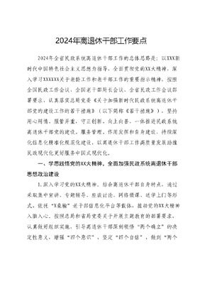 2024年离退休干部工作要点2024年全省民政系统离退休干部工作的总体思路是:以XXX新时代中国特色社会主义思想为指导,全面贯彻党的XX大精神,深入学习XXXXXX关于老龄工作和老干部工作的重要指示精神,按照全国民政工作会议、全国老干部局长会议、全省民政工作会议部署要求,认真落实总局党委《关于加强新时代民政系统离退休干部党的建设工作的若干措施》(以下简称《若干措施》),坚持用心用情、服管并重,守正创新、向上向善,一体推进民政系统离退休干部党的建设、服务管理、作用发挥和自身建设,持续深化信息化精准化规范化建设,以离退休干部工作高质量发展助推民政现代化更好服务中国式现代化。一、学思践悟党的XX大精神,全面加强民政系统离退休干部思想政治建设1.深入学习党的XX大精神。结合离退休干部自身特点,通过采取集中宣讲、专题辅导、座谈讨论、网络微课、送学上门等形式,依托X桑榆老干部信息化平台等载体,推动党的XX大精神入脑入心。按照总局和省局党委关于开展主题教育的部署要求,认真做好组织实施,引导离退休干部深刻领悟两个确立的决定性意义,增强四个意识、坚定四个自信、做到两个维护。2.进一步用党的创新理论凝心铸魂。把学习贯彻XXX新时代中国特色社会主义思想作为老干部学习教育的中心内容。组织学习《XXX谈治国理政》等原著原文,重点学习XXXXXX关于老干部工作的重要论述,及时跟进学习XXXXXX最新重要讲话和重要指示批示精神。把理论武装同党史学习教育常态化长效化制度机制结合起来,引导老干部在学、忆、讲、用党史的过程中不断明理、增信崇德、力行。创新学习方式方法,用好线上线下学习阵地。3.高度关注离退休干部思想动态。持续加强政治机关意识教育,严格落实意识形态工作责任制和网络意识形态工作责任制。深入开展离退休干部思想状况调研分析。经常性与离退休干部谈心谈话,了解掌握个人思想和家庭状况,关心关注离退休干部诉求,及时回应解决。二、扎实推进《若干措施》落实,持续提升民政系统离退休干部党建工作质量4.牢固树立服管并重理念。坚持把服管并重贯穿离退休干部工作全过程,推动服务与管理融合互促,在服务中规范管理,在管理中优化服务。落实全面从严治党要求,不断加强日常教育和管理监督,运用好《离退休干部遵规守纪》读本等,开展党性党风党纪教育,确保离退休干部始终听党话、跟党走。引导老同志模范遵守有关讲座、论坛、刊物出版、企业社团兼职任职、继续从业、出国(境)等方面的纪律规定。5.认真抓好离退休干部党组织建设。加强党支部班子建设,规范换届工作,选配党性强、威信高、经验丰富、乐于奉献、身体较好、相对年轻的离退休干部党员担任党组织书记和委员。抓好三会一课、组织生活会、民主评议党员等制度落实,不断提高组织生活质量;坚持和完善重温入党誓词等仪式,开展主题党日、过政治生日、七一前夕走访慰问老党员等活动,增强基层党组织的凝聚力向心力战斗力。6.积极开展党支部创建。按照组织设置好、班子建设好、党员队伍好、学习活动好、作用发挥好、制度坚持好标准,组织开展创建示范党支部活动。各地要结合党支部创建,围绕打基础、抓规范、创品牌,形成具有本单位特色、可复制可借鉴的党建创新案例,持续打造体现本单位离退休干部党建工作特色品牌区局将在各单位推荐报送基础上,择优推出一批民政系统示范党支部、一批党建创新案例并报送总局,进一步推动民政系统离退休干部党建工作高质量发展。三、夯实用心用情服务根基,不断拓宽民政系统离退休干部工作新路径8.精细精准做好离休干部服务保障。离休干部多处于双高期,要切实落实好离休干部三个机制和各项待遇等政策措施,健全完善一人一策制度机制,想方设法解决紧急救助等问题。结合重大节日送温暖等活动,定期上门走访看望离休干部,做到思想上关心、生活上照顾、精神上关怀。9.持续提升离退休干部服务保障水平。针对离退休干部基数大、增长快、服务管理难度大,要带着敬重、带着感情、带着责任,不断提升离退休干部服务保障水平。认真落实元旦春节、重阳节等重大节日走访慰问,在老同志生病住院、家庭出现重大变故时及时关心看望,对高龄、空巢、独居、失能和重病等有特殊困难的老同志给予更多关心照顾。持续做好离退休干部年度体检工作。10.巩固拓展我为老同志办实事活动成果。常态化开展为老同志送温暖、办实事活动。继续持续开展节日送温暖情暖桑榆贺寿耄耋敬老月等活动,为离退休干部党支部和老干部订阅或赠阅党报党刊、X报刊图书等。积极发挥离退休干部党组织的引领作用,发展爱心团队,不断增强老同志的获得感幸福感安全感。11.加强离退休干部活动阵地建设。持续建好用好老年大学、老干部活动中心(室)等活动阵地,为老干部开展支部活动、政治学习、文娱活动提供场所。探索健全单位、社会、家庭相结合的服
