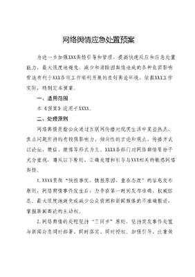 网络舆情应急处置预案为进一步加强XXX舆情引导和管理,提高快速反应和应急处置能力,最大限度地避免、减少和消除因舆情造成的各种负面影响营造有利于XXX各项工作顺利开展的良好舆论环境,依据XXX工作实际,特制定本预案。一、适用范围本《预案》适用于XXXX。二、处理原则网络舆情是指公众通过互联网传播对现实生活中某些热点、焦点问题所持的有较强影响力、倾向性的言论和观点,传播方式以论坛、微信、微博等形式为主。XXXX各部门对网络舆情要给予充分重视,遵从以下原则,正确处理和引导与XXX相关的敏感网络舆情。1.XXXX贯彻快报事实、慎报原因、重在态度的信息发布原则,网络舆情事件发生后,力争在第一时间发布准确、权威信息。最大限度地避免或减少公众猜测和新闻媒体的不准确报道,掌握新闻舆论的主动权。2.网络舆情的处理坚持三同步原则,坚持突发事件处置与新闻应急同时部署、同时落实、同时授权。加强引导、注重效果,提高正确引导舆论的意识和工作水平,依托主流媒体积极引导和应用好外媒。3.接受媒体采访、对外披露信息时,坚持四个统一,即统一事实、统一数据、统一口径、统一出口,避免口径不一、多头发布。处置舆情突发事件的各部门密切配合,确保以最短的时间、最快的速度,发布最新消息,正确引导舆论。三、舆情处理职责1.网络舆情的处理工作,以XXXX宣传工作分管院长为新闻发言人和第一责任人,XX办公室及舆情相关科室负责人为具体责任人。各XXX由XXX领导负责统筹协调,指导处置重要敏感网络舆情2.XXXX办公室具体负责网络舆情的监测、报告、研判、核实新闻应急和相关信息发布等应急工作,舆情相关科室主任负责带领科室医务人员,配合XXXX开展舆情处理工作。四、舆情的管理1.舆情分为:一般舆情和紧急舆情,一般舆情是指对XXX提出的批评、改进工作的意见和建议。紧急舆情是指对XXX产生严重负面影响的信息。2.XX舆情监测工作由XXXX办公室统一负责管理,各XXX主任负责本XXXX舆情的日常监管工作。3.XXX办公室收集、整理相关网络舆情信息,做好相关资料的登记。根据网络舆情的危急程度,上报和请示XXXX分管领导以及上级主管部门。五、舆情的处置1.舆情处置由XXXX办公室根据XX领导指示,遵照归口科室处理的原则,实施舆情处置。各科室负责人获知舆情后,要按照快速反应、调查落实、妥善处理的原则积极处置,并将处置办法及处置情况上报XXXX办公室。2.一般舆情处置经相关领导审核后以跟帖、发帖等方式积极释疑解惑、消除矛盾、控制影响,一般在3个工作日内完成。3.紧急舆情应在4小时内完成初步核实和处置情况,必要时由XXX办公室、XXX室到相关科室进行调查核实,迅速将结果报送院领导,必要时制定专项处置方案,根据领导审核意见处置。4.对于公众关心、社会反应强烈的紧急舆情,视具体情况形成新闻通稿。可适时通过XXXX官方网站、微博、微信公众平台进行信息发布,同时在纸质媒体和电视媒体等主流媒体发布,酌情召开新闻发布会,公开处理结果。5.XXXX办公室将对舆情发展情况进行判研,根据舆情动向做相应调整,避免发生次生灾害。六、工作要求1.XXXXX办公室实行24小时网络监测,及时掌握网络舆情。定期向XXXX领导汇报,及时接受和执行上级指令。2.加强XXXX及各科室的官方微信、微博、网站等新媒体的管理。不得在XXX官方微博和个人微博等自媒体上发表未经审核或不宜公开的与网络舆情相关的内容。3.各XXX科室的XXX人员若发现在网络发现关于XXXX的负面舆情,及时联系XXXX办公室,不得随意跟帖、转发。XXX人员未受XXX指派,不得私自接受媒体的采访。4.未按照本方案开展舆情监测和处置工作,未及时处置或处置不当、推诿扯皮的,引起严重不良影响的,XXX将追究相关科室负责人的相关责任。