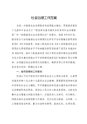 社会治理工作方案为进一步推进社会治理体系和治理能力建设,贯彻落实党的十九届四中全会关于坚持和完善共建共治共享的社会治理制度和加快推进社会治理现代化的要求,根据《中共中央、国务院关于加快推进社会治理现代化开创平安中国建设新局面的意见》《中共XX省委、XX省人民政府印发《关于加快推进社会治理现代化开创更高水平平安XX建设新局面的若干意见》的通知》和《XX市委、XX市人民政府印发《关于争创全国市域社会治理现代化示范市建设更高水平平安XX的实施意见》的通知》等文件精神,加快建设社会治理现代化新模式,确保各项工作有序推进,结合我市实际,特制定本方案。一、指导思想和工作原则坚持以习近平新时代中国特色社会主义思想为指导,认真贯彻落实党的十九大和十九届历次全会精神,紧紧围绕坚持和完善中国特色社会主义制度,牢牢把握坚持和完善共建共治共享的社会治理格局的总要求,坚持以人民为中心的发展思想,以防范化解社会治理重大风险为突破口,打造具有人文特色、时代特征、XX特点的社会治理创新工作体系。充分运用大数据、云计算、人工智能等前沿科技,着力打造特色鲜明、基础扎实、应用全面、成效显著、人民满意的七位一体XX模式,加快构建党委领导政府负责、民主协商、社会协同、公众参与、法治保障、科技支撑的社会治理体系和共建共治共享的社会治理格局,创新提升社会治理能力水平,塑造大数据背景下的社会治理现代化标杆,推动平安XX建设迈上新台阶。辖市内社会治理遵循以下原则——加强领导,总揽全局。以全面加强党委领导完善社会治理体系为前提和核心,把党的领导落实到社会治理各领域各方面各环节。不断完善体制机制,加速集聚各方资源,全面贯彻落实中央和省、市、市的决策部署,创新XX治理模式。——统筹协调,上下联动。坚持系统治理、依法治理、综合治理、源头治理,动员组织社会力量共同参与,不断优化社会治理六联,即矛盾联调、治安联防、问题联治、平安联创、服务联供、应急联动,形成共建共治共享治理格局。——以用带建,以建促用。以实现社会治理现代化为目标,以防范化解风险为着力点,加大社会治理信息化、智能化建设力度,深入探索智能化应用场景,加快补齐基础短板,配套优化工作机制,推进高质量发展,实现可持续发展。——智治驱动,数字赋能。坚持需求导向和问题导向,推进平台、中心、网格三大基础模块的整合建设,加速大数据运用赋能,横向实现全市政务信息无缝对接,纵向实现市、市、镇(街)、村(社市)各级平台大数据资源共享互用,强化智治基础。——统一指挥,流程重塑。坚持标准先行,完善市级平台基础数据采集标准、平台工作职能要求、中心运转部门协同流程、网格操作规范、任务权责清单等标准规范,向上充分对接市级各指挥平台,重塑辖市内指挥协同体系,健全考评监督机制,不断夯实辖市现代化社会治理基础。——分层分级,确保安全。按照分层授权、分级保护的原则建立信息安全管理责任与监督检查、数据管理运维等机制,充分利用现有的信息安全保护手段,形成信息产生、传输、交换、使用的全生命周期社会治理安全保障机制。二、总体架构以提升社会治理能力水平为目标,市级社会治理责任单位全数纳入体系,构建一统揽一平台一中心一网格一揽子方案一套机制一支队伍和N+应用的整体布局。(一)一统揽坚持党委领导,统揽全市社会治理各项工作,成立市社会治理工作委员会,加挂市城市综合管理委员会,全面推进社会治理现代化、市域社会治理现代化示范创建、城市综合管理等方面各项工作,研究相关领域的重要问题,协调推动有关政策措施的制定和实施,全力提升辖市社会治理能力现代化水平。(二)一平台坚持多平台合一,在现有公共安全管理平台基础上升级搭建市、镇(街)、村(社市)三级社会治理工作平台,构建数据中台,运用先进算法,实施数据治理,建设跨部门应用场景解决社会治理领域堵点、难点问题,解决现有平台未能统筹、信息统计重复填报、资源利用效率低下等问题。(三)一中心坚持一中心多用,按照平急结合的一体化工作思路,构建完善日常全域覆盖、重大活动加强和突发应急响应三级指挥体系。全面整合市公共安全管理指挥中心、分局情报指挥中心、分局反诈中心、110联动指挥中心、市网格化指挥中心、市12345平台指挥中心和市数字城管指挥中心、诉非联动中心、12309检察服务中心,形成市级指挥中枢——XX市社会治理指挥中心,负责平台业务统一指挥调度。(四)一网格坚持多网合一,构建社会治理综合网格,统筹网格内党的建设、综合治理、应急管理、城市综合管理、社会保障服务、矛盾纠纷多元化解、重点人群管控、群众来信来访等工作。合理确定网格监管任务和事项,科学配置网格员力量,实行定人、定岗、定责。推进网格化服务管理标准化建设,提高网格管理规范化精细化水平。(五)一揽子方案组织