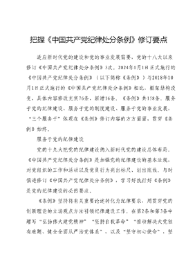 把握《中国共产党纪律处分条例》修订要点适应新时代党的建设和党的事业发展需要,党的十八大以来修订《中国共产党纪律处分条例》3次。2024年1月1日正式施行的《中国共产党纪律处分条例》(以下简称《条例》)与2018年10月1日正式施行的《中国共产党纪律处分条例》相比,框架结构没变,具体内容修改充实76条,新增16条。《条例》共158条。服务于党的纪律建设、服务于党的制度建设、服务于党的事业发展,三个服务于体现在《条例》修订内容的方方面面,贯穿《条例》始终。服务于党的纪律建设党的十九大把党的纪律建设纳入新时代党的建设总体布局。《中国共产党纪律处分条例》是加强党的纪律建设的基本法规,对党组织的工作和活动以及党员行为亮出标尺、划出底线。与时俱进修订《中国共产党纪律处分条例》,学习好执行好《条例》是党的纪律建设的必然要求。《条例》坚持将有关重要论述转化为纪律要求,用贯穿党的创新理论的立场观点方法引领纪律建设工作。在第2条和第3条中增写弘扬伟大建党精神坚持自我革命推动解决大党独有难题、健全全面从严治党体系,以及坚守初心使命,坚定四个自信,切实践行正确的权力观、政绩观、事业观等内容,作为《条例》总体要求。《条例》突出党的政治纪律在党的纪律建设中的地位,体现出把政治纪律严起来,带动其他各方面纪律严起来的新时代党的纪律建设思路。在党的各项纪律中政治纪律是最重要、最根本、最关键的纪律。在《条例》第56条中完善保障党中央政令畅通的纪律条款,新增对不顾党和国家大局,搞部门或者地方保护主义行为的处分规定,充分体现坚持党的全面领导,首先要坚决维护以同志为核心的党中央权威和集中统一领导。在第54条、第55条中,充实对党不忠诚不老实、破坏党的团结统一的处分规定,新增对搞政治攀附、结交政治骗子或者被政治骗子利用,或充当政治骗子行为的处分规定。在第57条中,将搞劳民伤财的形象工程政绩工程行为由违反群众纪律调整为违反政治纪律。服务于党的制度建设党的制度建设贯穿党的建设各方面、全过程。制度治党、依规治党是关于党的建设的重要思想的重要内容。在党内法规体系中,党章是根本,是制定其他党内法规的基础和依据。加强党的制度建设要维护党章权威,完善其他党内法规并不断提高其执行力。《条例》第1条就明确维护党章和其他党内法规。《条例》把党章新增要求具体化,更好维护党章的权威性。如党的XX大关于《中国共产党章程(修正案)》的决议,增写反对特权思想和特权现象,《条例》第94条相应新增对相关问题的处分规定。党的XX大把贯彻新发展理念、加快构建新发展格局、推动高质量发展写入党章,《条例》相应新增第57条,对党员领导干部政绩观错位,违背新发展理念、背离高质量发展要求作出处分规定。《条例》对其他党内法规落实不利作出处分规定。如落实党的XX大精神,实现全面建成社会主义现代化强国总的战略安排,领导干部是骨干力量、关键少数,必须建设堪当民族复兴重任的高素质干部队伍。这就要求更好落实《推进领导干部能上能下规定》,进一步激发干部队伍的活力、战斗力。但其执行中会遇到种种困难。《条例》坚持问题导向,在新增第85条中,对在推进领导干部能上能下工作中搞好人主义,存在以党纪政务等处分规避组织调整、以组织调整代替党纪政务等处分以及其他避重就轻作出处理行为等情况,对直接责任者和领导责任者作出处分规定此外,《条例》把一些不成文的规矩具体化为成文纪律要求。坚持勤俭节约、反对铺张浪费是党的优良传统,是新时代对党员干部的重要要求,《条例》新增第133条对餐饮浪费作出处分规定,在第150条中新增对铺张浪费行为的处分规定。服务于党的事业发展党的建设全部工作必须始终围绕和服务于党的中心工作。《条例》修订和执行都必须落实为以中国式现代化全面推进强国建设、民族复兴伟业提供坚强纪律保障的要求。《条例》第30条相应新增对有破坏社会主义市场经济秩序、违反治安管理、违反国家财经纪律等违法行为,虽不构成犯罪但须追究党纪责任的处分规定。《条例》及时回应现实中的突出问题,或修改完善、或新增多个条款。其中,第56条新增对贯彻党中央决策部署只表态不落实的处分规定;第126条完善对慢作为、假作为等处分规定;针对形式主义、官僚主义顽瘴痼疾,第132条新增随意决策、机械执行搞文山会海,层层加码、过度留痕,增加基层工作负担等行为的处分规定;第130条充实对新官不理旧账行为的处分规定,新增对党员领导干部对于到任前已经存在且属于其职责范围内的问题,消极回避、推卸责任的处分规定;新增第135条和第139条,对不履行或者不正确履行信访工作职责、统计造假行为作出处分规定。《条例》坚持对不作为、乱作为的惩处同时,新增第131条,对工作中不敢斗争、不愿担当,面对重大矛盾冲突、危机困难临阵退缩行为作出处分规定;落实三个