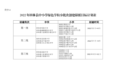 附件42022年田林县中小学绿色学校分批次创建最低目标计划表创建批次中学小学创建时间第一批田林县初级中学田林县潞城瑶族乡中学田林县八渡瑶族乡福达中学田林县第四小学田林县乐里镇中心校田林县潞城瑶族乡中心校田林县八渡瑶族乡福达中心校田林县旧州镇中心校田林县平塘乡中心校2022年3月—6月第二批田林县定安镇中学田林县浪平镇中学田林县百乐乡龙车中学田林县第一小学田林县利周瑶族乡中心校田林县浪平镇中心校田林县浪平镇平山中心校田林县定安镇中心校田林县百乐乡龙车中心校2022年5月—8月第三批田林县高级中学田林县八桂瑶族乡中学田林县六隆镇中学田林县第二小学田林县第三小学田林县六隆镇中心校田林县八桂瑶族中心校田林县高龙乡中心校田林县百乐乡中心校2022年9月—12月