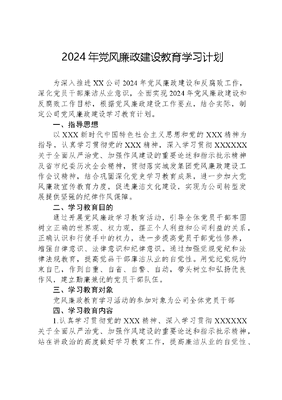 2024年党风廉政建设教育学习计划为深入推进XX公司2024年党风廉政建设和反腐败工作,深化党员干部廉洁从业意识,全面实现2024年党风廉政建设和反腐败工作目标,根据党风廉政建设工作要点,结合实际,制定公司党风廉政建设学习教育计划。一、指导思想以XXX新时代中国特色社会主义思想和党的XXX精神为指导,认真学习贯彻党的XXX精神,深入学习贯彻XXXXXX关于全面从严治党、加强作风建设的重要论述和指示批示精神及省市纪委历次全会精神,贯彻落实城发集团党风廉政建设工作会议精神,结合巩固深化党史学习教育成果,进一步加大党风廉政宣传教育力度,促进廉洁文化建设,实现为公司转型发展提供坚强的纪律作风保障。二、学习教育目的通过开展党风廉政学习教育活动,引导全体党员干部牢固树立正确的世界观、权力观,摆正个人利益和公司利益的关系,正确认识和行使手中的权力,进一步提高党员干部党性修养,增强自律意识、法律意识和纪律意识。通过加强觉规党纪和法律法规教育,提高觉品干部庫洁从业的自觉性。用觉纪觉规约束自己,作到自重、自省、自警、自动,带头树立和弘扬优良作风,建立勤廉兼优的党员干部队伍。三、学习教育对象党风廉政教育学习活动的参加对象为公司全体党员干部四、学习教育内容1.认真学习贯彻党的XXX精神、深入学习贯彻XXXXXX关于全面从严治党、加强作风建设的重要论述和指示批示精神,站在讲政治的高度做好学习教育工作,提高廉洁从业的自觉性、主动性。2.认真学习贯彻落实中央八项规定及其实施细则精神,贯彻落实省委实施意见及集团公司落实措施,结合本单位实际,将中央八项规定精神落实到日常工作中。3.认真学习领会二十届中纪委二次全会、省纪委十二届二次全会和市纪委十四届三次全会精神,学习李希同志在湖北调研讲话精神,贯彻落实城发集团纪委党风廉政建设工作会议各项部署,把思想和行动统一到中央、省市及集团公司的决策部署和具体要求上。4.认真学习党规党纪。包括新修改的《党章》《中国共产党党内监督条例》、《关于新形势下党内政治生活的若干准则》、《中国共产党廉洁自律准则》、《中国共产党纪律处分条例》、《中国共产党纪律检查委员会工作条例》、《监察法实施条例》、《党委(党组)落实全面从严治党主体责任规定》、《中华人民共和国公职人员政务处分法》、《武汉市市属企业纪检监察机构监督检查审查调查工作规范(试行)》、《城发集团领导干部应知应会手册》等相关党规党纪及上级下发的廉政文件。五、学习方式1.广泛性学习教育和针对性学习教育相结合。学习教育紧扣实际,强化廉洁从业学习教育,切实提高学习教育的针对性、时效性,推进党员干部议廉、述廉、诺廉,增强拒腐防变的免疫力,积极推进廉洁承诺提醒谈话、警示谈话、诫勉谈话等制度的落实。2.集中学习教育与日常学习教育相结合。集中组织党员干部重点学习有关廉政教育的理论政策,鼓励党员干部利用学习强国等网络平台以及所发放的廉政书籍认真开展自学,公司纪委将不定期检查个人学习情况。3.正面典型学习教育和反面典型学习教育相结合。发挥觉员干部表率和先进典型的辐射作用,增强党风廉政教育的感召力,用生动感人的事迹鼓舞人、教育人,引导党员干部遵章守纪、传导清正廉洁之风。组织全体人员观看警示教育片、案例视频,以案施教以案明纪以案说法、以亲释理,不断给党员干部敲警钟,强化拒腐防变的自律意识。六、学习要求1.提高思想认识。要充分认识学习教育的必要性,有力的推进廉政教育活动。从实际出发,加强学习教育内容的针对性和有效性,统筹安排好各项活动的时间、内容和步骤,确保廉政教育活动有序进行并取得预期效果。2.关注重要节点。在国庆、元旦、春节等传统节日和党员领导干部操办婚丧喜庆事宜等容易发生不廉洁行为的关键时期,提前预想,提前警示,通过召开节前廉洁教育工作会议,开展廉洁承诺等形式,加强廉政宣传教育及警示,重申关于领导干部廉洁自律的有关规定,引导党员干部牢固树立宗旨观念,法纪观念和廉洁自律意识,筑牢拒腐防变的思想道德防线。3.量化学习频率。集体学习反腐倡廉理论、党纪条规,每年不少于2次;每年不少于1次在党员干部中开展廉政知识测试或竞赛活动,每年组织1次廉政集中学习,支部书记上1堂廉政党课。4.建强廉政文化。加大廉政文化创建活动宣传教育力度,通过开展家风家教主题系列宣传教育活动、开展党风廉政建设宣传教育月活动等各类廉政活动,潜移默化推进党风廉政建设向更高层次发展,多层次、多角度营造浓厚廉政氛围。