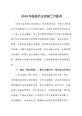 2024年县直机关党建工作要点2024年县直机关党的建设工作总体要求是:坚持以XXX新时代中国特色社会主义思想为指导,全面贯彻落实党的XXX和二十届二中全会精神,深入学习贯彻XXXXXX关于机关党建的重要论述和考察调研河南重要讲话重要指示精神,按照县委统一部署,以党的政治建设为统领,持续深化拓展县直机关党建工作思路,以提升党组织政治功能、组织功能为目标,以模范机关创建和四强党支部建设为重点,巩固拓展主题教育成果,推进机关党建全面提质增效,以高质量党建引领高质量发展。一、突出政治领航,把牢正确方向,强化政治引领力1.坚决做到两个维护。始终把讲政治作为第一要求,持续推动政治机关意识教育、对党忠诚教育、政治纪律和政治规矩教育向基层党组织延伸,通过专题培训、集中研讨、实地接受红色教育等形式,深化政治学习、加强政治历练、强化政治激励、严格政治监督,引导党员干部不断提高政治判断力、政治领悟力、政治执行力;推进政治监督具体化精准化常态化,把做到两个维护情况作为机关党建专项督查的重要内容,确保两个维护落实到工作中、体现在行动上。2.深化模范机关建设。坚持和完善贯彻XXXXXX重要讲话重要指示批示和党中央决策部署的清单化、闭环式工作机制,确保条条落实、件件落地。持续深入推进各级党组织开展模范机关创建活动,挖掘亮点、选树先进,加强宣传,营造氛围,发挥好先进典型的示范引领作用。强化调研指导,坚持抓两头带中间,深入机关基层党组织掌握情况,发现问题,总结经验,有针对性地加以指导帮助,深化创建成效。二、突出凝心铸魂,加强理论武装,提升思想感召力3.深化党的创新理论武装。突出抓好关键少数,压实党委(党组)理论学习中心组学习主体责任,认真做好党的XXX和二十届二中全会精神学习教育和宣传宣讲,用好集体研学、个人自学、调查研究等方式,及时跟进学习XXXXXX重要讲话重要指示批示精神。健全完善和落实第一议题制度,完善列席旁听机制,持续开展理论学习中心组学习示范点和基层文可居文库——海量学习资料,手机电脑均可下载www.wenkeju.com理论宣讲示范点培育。认真抓好《党史学习教育工作条例》的学习宣传和贯彻落实,推进党史学习教育常态化长效化。4.推动主题教育成果转化。牢牢把握学思想、强党性、重实践、建新功的总要求,持之以恒落实四下基层,聚焦新时代机关党建工作重点难点问题开展深入研究,围绕增强机关党组织政治功能和组织功能、推进机关党建品牌建设等开展调研督导,提高机关党建研究能力,攻克难点问题。引导机关系统各级党组织和党员干部着力推进改革创新、办好民生实事、优化为民服务,把好的经验做法、典型模式长效化、制度化,以机关党建高质量发展的生动实践和实际成果检验主题教育成效。5.精心组织系列庆祝活动。结合县直机关实际,开展XXXXXX7·9重要讲话发表5周年系列宣传教育活动。围绕庆祝新中国成立75周年,组织开展文艺汇演等系列庆祝活动及知识竞赛、主题征文等主题宣传活动,厚植党员干部爱党爱国情怀。文可居文库——海量学习资料,手机电脑均可下载www.wenkeju.com6.做好意识形态工作。坚持党管意识形态原则,全面落实党中央及省市县关于意识形态工作的部署要求,定期开展分析研判,加强督导考核。将意识形态暨网络意识形态教育纳入理论中心组必学内容和党员教育培训课程,充分利用倡议书、LED屏横(条)幅等载体进行主题宣传。严格网络阵地管理,持续巩固和发展意识形态领域向上向好的总体态势。三、突出大抓基层,持续强基固本,提升组织凝聚力7.严肃党内政治生活。严格贯彻落实《新形势下党内政治生活若干准则》及各项党内法规制度,认真落实三会一课、民主评议党员等组织生活制度,提高民主生活会、组织生活会质量,不断增强党内政治生活的政治性、时代性、原则性、战斗性。突出党性锻炼,结合党员思想工作实际,党组织书记、党员领导干部带头讲党课。8.夯实基层党组织基础。进一步强化基层党组织政治功能和组织功能,以问题为导向,促进机关党建工作中常见的重点难点问题和巡视巡察反馈的突出问题整改提升。持续开展基层党组织两大建设,巩固拓展党支部标准化规范化建设成文可居文库——海量学习资料,手机电脑均可下载www.wenkeju.com果。深化党建联盟机制,开展共建活动,推进机关党支部活动方式创新,提高三会一课和主题党日质量。严把党员入口关。严格执行基层党组织任期规定,拓展培训方式,分层分类组织好培训,建设高素质、专业化机关党务干部队伍。9.创建四强党支部。认真贯彻落实支部工作条例,规范政治功能强、支部班子强、党员队伍强、作用发挥强党支部创建管理工作,以评促创、以创促建,以点带面、整体推进。严格落实党支部建设基本制度,