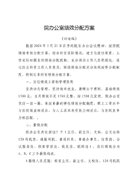 院办公室绩效分配方案(讨论稿)根据2024年3月21日召开的院长办公会议精神,按照院绩效考核分配方案,结合科室实际情况,建立与岗位职责、工作实际相联系的绩效分配机制,充分调动工作人员积极性,通过征求科室工作人员意见,围绕绩效分配充分体现按劳分配制度,特制定本科室绩效分配方案。一、岗位绩效工资制管理原则坚持动态管理,坚持效率优先、兼顾公平原则,基础绩效1500元,当月绩效不足1500元整,按1500元发放。院办公室实行一岗一薪、易岗易薪的弹性绩效分配制度,职工工资水平与医院效益相适应,与人工成本承受能力相适应,与医院竞争力相匹配,。二、薪级分配院办公室共设岗位?个(主任、副主任、文秘、公文运转120司机岗、通勤司机、普通科员、普通办事员、信息岗、会议服务岗、档案管理岗、收发岗、联络岗),岗位绩效分为A、B、C三个薪级构成。A薪级人员范围:科室主任、副主任、文秘岗、120司机队长。B薪级人员范围:普通科员、普通办事员、司机岗。C薪级人员范围:档案管理员、收发员。三、计算方法A薪级(院平均奖×1.15)、B薪级(院平均奖×0.95、 C薪级(院平均奖×0.9)。院办公室根据工作需要长期安排职工在法定标准工作时间以外工作的,结合实际提升薪级水平,B级、C级岗位因需要周末加班工作的给予奖励性薪金50元/天,A级岗位不安排额外加班费用,担任院总值班的岗位补助金已在薪级系数里不在额外算。 2024年3月22日文可居文库——海量学习资料,手机电脑均可下载www.wenkeju.com