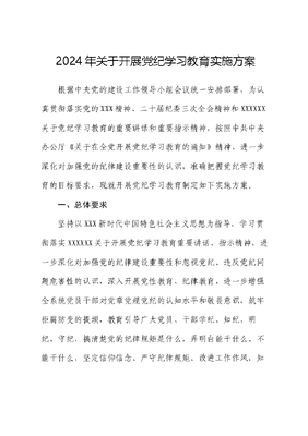 2024年关于开展党纪学习教育实施方案根据中央党的建设工作领导小组会议统一安排部署,为认真贯彻落实党的XXX精神、二十届纪委三次全会精神和XXXXXX关于党纪学习教育的重要讲话和重要指示精神,按照中共中央办公厅《关于在全党开展党纪学习教育的通知》精神,进一步深化对加强党的纪律建设重要性的认识,准确把握党纪学习教育的目标要求,现就开展党纪学习教育制定如下实施方案。一、总体要求坚持以XXX新时代中国特色社会主义思想为指导,学习贯彻落实XXXXXX关于开展党纪学习教育重要讲话、指示精神,进一步深化对加强党的纪律建设重要性和忽视党纪、违反党纪问题危害性的认识,深入开展党性教育、纪律教育,进一步增强全系统党员干部对党章党规党纪的认知水平和敬畏意识,筑牢拒腐防变的提坝,教育引导广大党员、干部学纪、知纪、明纪、守纪,搞清楚党的纪律规矩是什么,弄明白能干什么、不能干什么,坚定信仰信念、严守纪律规矩、改进工作作风,知敬畏、存戒惧、守底线,为经济社会高质量发展提供坚强的纪律作风保障。二、时间安排2024年4月至2024年7月。三、参加对象各级党委(组)、各支部、全体党员(含预备党员)四、学习内容(一)习贯彻落实XXXXXX关于开展党纪学习教育重要讲话、指示精神;XXXXXX在二十届中央纪委二次全会上的讲话精神、XXXXXX在二十届中央纪委三次全会上的讲话精神、XXX法治思想等,(二)党的XXX报告;二十届中央纪委二次全会工作报告;二十届中央纪委三次全会工作报告(三)《党章》《中国共产党纪律处分条例》《中国共产党廉洁自律准则》《中国共产党问责条例》,以及宪法、总体国家安全观和国家安全法、民法典等,还包括官方网站发布的文可居文库——海量学习资料,手机电脑均可下载www.wenkeju.com违法违纪反面典型案例。既要注重学习内容的丰富性,又要关注学习方式的多样化。(四)其他内容结合包括《永远吹冲锋号》《清风》《榜样》等廉洁教育宣传片也可作为补充资料纳入学习。五、学习教育具体安排(一)开展党纪学习教育宣传月活动(4-5月)1、组织开展全面动员部署活动。新修订的《中国共产党纪律处分条例》是本次集中党纪学习的重点,党组、各支部要把学习贯彻新修订纪律处分条例作为2024年党委理论学习中心组学习、党支部集体学习和党员自学的主要内容,及时制定专题学习计划。既要考虑人员的分层分类,又要考虑内容的精细分解。及时召开动员部署会,引导党员干部准确把握这次党纪学习教育的目标要求,通过学习教育,搞清楚党的纪律规矩是什么,弄明白能干什么、不能干什么,始终做到忠诚干净担当。2、组织学党纪集体学习教育活动。党组要召开一次专题会议,传达学习XXXXXX关于开展党纪学习教育重要讲话、指示精神,中央党的建设工作领导小组会议精神,中共中央办公厅文可居文库——海量学习资料,手机电脑均可下载www.wenkeju.com《关于在全党开展党纪学习教育的通知》精神,明确工作任务、要求,对总体工作开展进行安排部署。各党支部可采用召开支委会、主题党日等形式,聚焦发扬自我革命精神这一主题,把完善计划、征求意见、做足准备、完成规定动作等充分结合进来,引导党员干部充分认识纪律教育的重要意义。3、开展知党纪学法守纪交流活动。党组理论学习中心组、各支部要围绕党纪学习教育,在集中学习期间至少召开1次专题学习研讨,重点围绕《党章》《中国共产党纪律处分条例》《中华人民共和国公职人员政务处分法》等内容,结合具体工作,交流对党规党纪的认识,如何贯彻落实相关要求等,进一步加深理解,强化遵规守纪的政治自觉。4、开展明党纪警示教育活动。把党纪集中学习与全面从严治党和党风廉政建设工作结合起来,通过集中观看廉政警示教育片、廉政党课、党规党纪知识测试等形式,引导机关党员干部充分认识重要意义,自觉形成浓厚的学习氛围,促进党员干部真懂规矩、严明纪律,牢固树立规矩意识、底线意识和红线意识,从根本上纠正一些党员干部对党章党规党纪认识不够、文可居文库——海量学习资料,手机电脑均可下载www.wenkeju.com执行不严等问题,达到将党性原则和纪律规矩内化于心、外化为行、凝聚为魂的目的。5、开展守党纪主题党日活动。深化党章党纪学习教育,提升党员干部纪律规矩意识,各支部结合实际组织开展守党纪主题党日活动。逐字逐句学习《中国共产党纪律处分条例》《中国共产党章程》《党政领导干部选拔任用工作条例》《事业单位工作人员考核规定》原文,进一步增强党章意识、规矩意识,更好坚持和落实党管干部原则,调动全体人员工作积极性主动性创造性;开展交流研讨,各支部党员结合学习情况,围绕遵守党纪处分条例,谈体会、谈感悟、谈打算。(二)深化廉政机关建设系列活动(6-7月)1、开展党规党纪专题辅导。通过邀请党校专家、党总支书记授课等形式