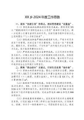 XX乡2024年度工作思路一、紧扣党建引领作用点,把好思想建设定星盘。(一)坚定政治站位狠抓理念信念见成效。持续党的XX大XXX新时代中国特色社会主义思想精神学习常态化,进一步发挥小左青年宣讲队伍的作用,创新传播手段和话语方式,让党的理论飞入寻常百姓家。(二)强化政治担当严格队伍建设扩人才。严格乡村党务政务干部管理,抓好后备干部力量培育,优选出一批肯挑重担、履职尽责、坚持原则、不怕吃苦的年轻化专业化干部人才队伍,提升基层党建内生动力。(三)严肃政治生态廉洁自律守底线。以正风肃纪专项检查为抓手,以群众身边不正之风和微腐败问题为线索,加强村级小微权力规范运行监督检查,从重点领域、重点时间节点出发,保持监管高压态势,严格执纪执法,严肃纪律处置,对破坏纯净政治生态环境行为零容忍。二、聚焦青山绿水关键点,打好生态发展组合拳。(一)守住山水资源护生态。强化小流域综合治理。2024年预计投入XX万元实施淳安县生态共富小流域水土流失综合治理项目(十八都源、龙源小流域),每年保土量XX万t,保水量19.36万m³。(二)抓好林下经济促发展。加强对标准地建设的管理,推动龙源庄、XX、方家三个村2024年3月底前完成标准地2126亩林下黄精种植任务,推动芳桥和方家二个村996亩规划落实林下经济种植地块发展;完成油茶造林400亩和低改800亩的任务。(三)推动康养项目增收入。依托道地中药材养生福地建设背景,计划在XX乡叶琪二桥桥头11.73亩的地块,打造集养生、保健、休闲于一体的康养中心,项目拟投资X亿元,建成后可带动周边就业30人,增加旅游收入。(四)打造文旅融合金品牌。完成330国道沿线旅游标识标牌建设,打造XX运动休闲乡镇品牌名片,加强与省市县体育主管等部门的赛事举办对接,引进具有较强影响力和综合带动力的自行车赛、马拉松、定向赛等大型品牌赛事,扩大XX影响力;引进杭州千岛湖悦湖竹涧酒店管理有限公司,租赁XX乡雌龙源村物业楼,计划投资2000万元,打造石岭后旅游综合体项目,打造光昌片精品文旅线路,带动光昌片3个村农产品销售,促进农民增收。三、筑牢民生福祉落脚点,锻造和谐保障金刚钻。(一)推动民生工程建设。提升改造农村饮用水供水站。预计投资XX余万元,改造升级14座供水站,通过水源改造、备用水源建设、消毒过滤设备改造升级及村内配水管网的建设,保障供水范围内的用水安全。回口茅坪山塘除险加固工程。预计投资70万元进行坝体重建、山塘内清淤、重建放水设施等工程,建设后将恢复回口茅坪山塘的灌溉能力并增加回口茅坪山塘的蓄水容积。(二)构筑和谐稳定防线。加强党建统领网格智治。完善网格值班、网格议事、网格事务报告制度,建立乡—村—网格、业务科室—四个平台—综合办纵横互通的紧急信息报告体系,发挥好村两委和老干部、党员志愿者的力量,利用好党员联系农户机制,提升平安防控、巡防服务、平急转换能力,做到微网格内一喊就到、随时报到。加强风险摸排治理常态化。持续开展安全生产、消防隐患、矛盾纠纷等风险隐患排查以及各重要时间节点期间的维稳安保工作,扎实做好信访件处理和矛盾纠纷调解,筑牢平安稳定的铜墙铁壁。