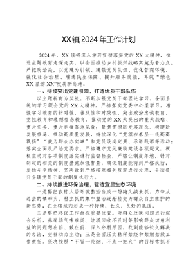 XX镇2024年工作计划 2024年,XX镇将深入学习贯彻落实党的XX大精神,推进主题教育走深走实,以全面推动乡村振兴战略实施为着力点,严把政治关,以党建为引领、建强党员队伍、优化营商环境、强化社会治理、增进民生保障、提升服务效能,再筑绿色XX 旅游XX发展新高地。一、持续突出党建引领,打造优质干部队伍以主题教育为契机,不断加强党员干部理论学习,全面系统的学习领会党的XX大精神,严格落实党委中心组学习,增强学习教育的针对性、普及性和时效性,突出政治忠诚教育、党性教育和理想信念教育,推动党的XX大提出的重大战略、重大任务、重大举措落地见效;聚焦贯彻新发展理念、构建新发展格局、推动高质量发展,持续深化党旗在基层一线高高飘扬我为群众办实事和党员设岗定责、承诺践诺等活动;落实全面从严治党要求,严格遵守党风廉政建设各项规定,积极主动对各项制度落实进行监督检查,严格让制度落地,针对制定的相关的制度措施加强督查,确保制度能得到严格执行,发扬斗争精神,坚决做到严格按照相关规定进行处理,全面提升全镇党员干部的制度执行力。二、持续推进环保治理,营造宜居生态环境一是要把农村人居环境整治当成一场持久战来抓。力争从过去的镇牵头、村主抓的集中整治逐渐转变为群众自主维护的新态势,在全辖域内形成一种持续、长久、良好的氛围;二是要把环保工作放在重要位置。对群众反映问题进行综合分析,养殖场气味难闻、垃圾回收不及时等影响群众切身利益的问题想在前、做在前,深入分析原因,找到能够长久解决的办法,变被动为主动;三是全面压实秸秆禁烧和禁燃禁放工作责任。坚决按照不冒一处烟、不点一把火的目标常抓不懈,同步推进秸秆乱堆乱放、河道沿岸杂乱无序的问题整治,营造共同保卫蓝天净土的大环境。三、持续优化营商环境,推动产业结构提升一是推进全省通办事项及县级下放事项的办理,进一步完善网格化系统的维护和更新,打造营商软实力;二是锚定旅游发展路线,延伸旅游产业链条,以刘老桥村和美乡村建设为圆点,形成环抱全镇的闭环旅游圈;三是加大招商引资力度,围绕本镇留守群众多、购销行业成规模的特点引入加工型企业,搞活本地经济,带动群众致富;四是以双兴村智慧渔场、陈寨村农机购置和韩张村养牛场共3个到村产业项目为蓝本,推动其余各村寻找合适的村集体产业项目,增加村集体经济收入。四、持续优化社会服务,多举措促进和谐稳定一是继续牢固树立稳定和谐的发展理念,加快推进创新基层社会治理,着力解决好群众反映的热点、难点问题,积极化解矛盾纠纷,维护群众利益;二是继续加强基础性、兜底性保障,提高基本养老保险参保率,实现基本医疗保险应保尽保;三是进一步健全社会治安防控体系建设,稳固道路交通安全、生产安全等工作,加大对重点人员、重点区域的有效管控,严厉打击各类违法犯罪活动;四是开展形式多样的新时代文明实践工作,推进移风易俗,尤其是在婚俗改革和殡改工作中,下大力气,力争实效;五是整合各单位力量重点关注弱势群体,关爱留守儿童和留守老人,抓好特殊群体、特困群众的社会救济、救助工作,切实提高群众的幸福感、获得感。