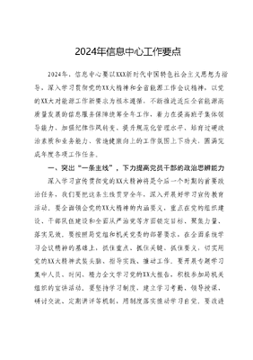 2024年信息中心工作要点2024年,信息中心要以XXX新时代中国特色社会主义思想为指导,深入学习贯彻党的XX大精神和全省能源工作会议精神,以党的XX大对能源工作新要求为根本遵循,不断推进适应全省能源高质量发展的信息服务保障统筹全年工作,着力在提高班子集体领导能力、加强纪律作风转变、提升规范化管理水平、培育过硬政治素质和业务能力、营造健康向上的工作氛围上下功夫,圆满完成年度各项工作任务。一、突出一条主线,下力提高党员干部的政治思辨能力深入学习宣传贯彻党的XX大精神将是今后一个时期的首要政治任务,我们要把这条主线贯穿全年,深入开展好学习宣传教育活动。要全面领会党的XX大精神的内涵要义,重点在党的组织建设、干部队伍建设和全面从严治党等方面锁定目标、聚集力量、落实见效。要按照局党组和机关党委的部署要求,在全面系统学习会议精神的基础上,抓住重点、抓住关键、抓住要义,切实用党的XX大精神武装头脑、指导实践、推动工作。要开展专题学习集中人员、时间、精力全文学习党的XX大报告,积极参加局机关组织的宣讲活动。要坚持学习制度,建立学习考勤、领导授课、研讨交流、定期讲评等机制,用制度落实推动学习自觉。要改进学习方式,充分利用新时代e支部、学习强国、理论读书班、周学习日、网苑培训、专家辅导、参观见学等方式增进学习效果坚持把党的XX大专题学习与政治理论学习、政治思想教育结合起来,引导党员干部用政治视角观察分析判断时势,不断提高政治判断力、政治领悟力、政治执行力。二、抓好两支队伍,充分发挥班子和党员的能动作用抓好班子队伍和党员队伍建设,发挥好党支部的战斗堡垒作用和党员的先锋模范作用是单位全面建设的核心和关键。去年支部进行了改选,产生了新一届支部委员会,新班子就要有新起色新干劲、新标准,因此新的一年要下力抓好两支队伍建设。一要抓好党建知识学习。要把新《党章》、《中国共产党组织工作条例》、《中国共产党党支部工作条例》作为基本教材,组织班子成员和全体党员反复深入学习,逐条逐句学深悟透,熟练掌握和运用应知应会的基本知识。要组织支部书记和党务工作者参加上级机关组织的业务培训,潜心研究新时期基层党建工作方式方法,组织班子成员办好实训班,搞好传帮带,使其成为热爱党建、熟悉党建、善抓党建的明白人和实干家。二要抓好组织制度落实。坚持党支部对各项工作的全面领导运用组织制度提升班子统领单位全面建设的能力。要落实好以三会一课为主要内容的各项组织制度。每月至少召开一次支委会,每季度召开一次支部大会,落实每季度报告一次工作、上一次党课规定,开好专题组织生活会和民主评议党员活动。要加强班子团结,强化民主作风,落实民主集中制原则,集体研究决定重大问题。要充分调动班子成员的工作积极性,搞好工作分工落实一岗双责,组织好领导班子年度考核。三要抓好党员教育管理。要动态掌握党员干部的思想状况,落实好讲政治、讲担当、讲服务、讲效率、讲学习、讲团结、讲勤廉7项要求,锻造守初心抓落实两种能力,开展好理想信念、党性修养、形势任务、职业道德等思想教育,做到教育制度化、经常化。要结合单位工作实际细化分解工作任务落实到每个人,建立岗位责任制,进行阶段性工作讲评,借助事业单位工作人员年度考核敦促提升工作业绩。要强化纪律观念和规矩意识,时刻对照提醒,高悬规矩戒尺,上紧制度发条,把遵规守纪作为立身之本。要做好先进典型培树工作,发挥好典型的引领作用。要做好入党积极分子的培养考察工作,加强对进步青年的思想教育,为党组织充实新鲜力量。三、盯住三个重点,通过治弱补短实现均衡发展一要进一步提升管理标准。要强化制度约束力,依据已制定的24项制度规定经常进行对照检查,全面规范各项工作,提高制度落实质量。要抓好作风养成,从日常细微小事抓起,全面规范办公秩序、管控好干部行为。在行政管理上重点抓行为规范;在人员管理上重点抓工作纪律;在财务管理上重点管好用好各类经费。要自觉融入到机关的管理之中,切实形成用制度管事、用制度管人的工作局面,保证各项工作规范有序。二是进一步落实从严治党。要抓好《中国共产党廉洁自律准则》《中国共产党纪律处分条例》和《中国共产党问责条例》等党内法规的学习贯彻,落实好执纪监督四种形态,开展好警示教育,落实党风廉政建设责任制。要巩固以案促改教育整顿成果,深刻汲取经验教训,坚持用身边事教育身边人,完善各项制度,增强法纪观念。要落实党风廉政建设主体责任和监督责任,注重发挥组织监督、群众监督、舆论监督作用,对重要岗位的人员经常提醒,对敏感问题按规定程序办理,坚决杜绝违规违纪问题发生。三要进一步提高素质能力。坚持把干部素质能力培养的责任担在肩上、落在实处,建立可行管用的工作机制,敢于交任务、压担子,努力为干部创造锻炼的机会和平台。要增强工作积极性和主动性,眼睛向下,精