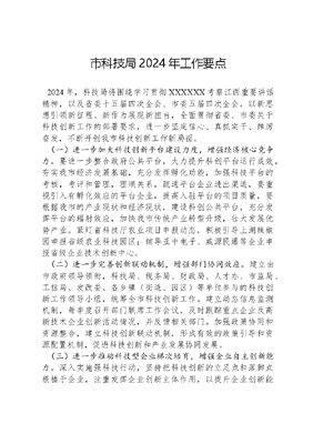 市科技局2024年工作要点2024年,科技局将围绕学习贯彻XXXXXX考察江西重要讲话精神,以及省委十五届四次全会、市委五届四次全会,以新思想引领新征程、新作为展现新担当,全面贯彻省委、市委关于科技创新工作的部署要求,进一步坚定信心、真抓实干、踔厉奋发,不断开创我市科技创新工作新局面。(一)进一步加大科技创新平台建设力度,增强经济核心竞争力。要进一步整合政府公共平台,大力提升科创平台运行成效,夯实我市经济发展基础,充分发挥孵化功能,加强科技平台的考核,考评和管理,理顺关系,疏通平台企业进出渠道,要重视引入有孵化效应的平台企业,提高入驻平台的项目质量,要根据我市的产业现状和经济现状,建设科创公共平台,充分发挥平台的辐射效应,加快我市传统产业转型升级,壮大发展优势产业。紧盯省科技厅农业项目申报动态,积极引导上湖辣椒园申报省级农业科技园区;辅导亚中电子、威源民爆等企业申报省级企业技术创新中心。(二)进一步完善创新联动机制,增强部门协同效应。建立由市政府领导领衔,科技局、税务局、财政局、人才办、市监局、工信局、发改委、各乡镇(街道、园区)等单位参与的科技创新工作领导小组,统筹全市科技创新工作。建立动态信息监测机制,每季度召开部门联席工作会议,及时跟踪重点企业及高新技术企业创新活动情况,并反馈相关部门。加强政策协同和资源整合,建立科技创新联动机制,形成有效的政策引导和资源配置机制,促进科技创新和产业发展协同发展。(三)进一步推动科技型企业梯次培育,增强企业自主创新能力。深入实施强科技行动,坚持把科技创新的立足点和落脚点根植于企业,注重发挥企业创新主体作用,以提升企业创新能力为突破口,着力优化企业创新环境,激发创新活力,释放创新动能,使全市科技型企业数量和质量明显提升。力争高新技术企业数实现正增长,科技型中小企业数在全省站稳第一方阵。(四)进一步加大引进培养科技人才,为经济发展提供人才支撑。大力实施国家、省高层次人才计划,鼓励企业引进高端人才,在积极引进行业领军人才的同时,也要重视骨干人才的引育工作,要重视本土实用型人才的培养工作,建立人才梯队,打造人才团队,要进一步完善人才政策,为人才的生活、工作、住房、子女就学提供更好的服务保障。要完善人才职称评定评审方式,不定期组织开展人才各种科技文化交流活动。同时要鼓励企业在大中城市建立、设立人才和平台基地,树立为我所用的人才观、平台观,进一步营造重才、爱才、育才的良好环境。