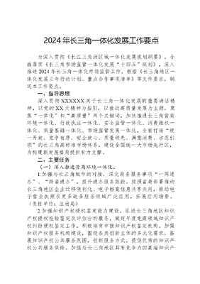 2024年长三角一体化发展工作要点为深入贯彻《长江三角洲区域一体化发展规划纲要》,全面落实《长三角市场监管一体化发展十四五规划》,深入推进2024年长三角一体化市场监管工作,根据《长三角地区一体化发展三年行动计划、重点合作事项清单》等文件要求,制定本工作要点。一、指导思想深入贯彻XXXXXX关于长三角一体化发展的重要讲话精神,以党的XX大精神为指引,以推动高质量发展为主题,聚焦一体化和高质量两个关键词,加快推进长三角营商环境一体化、行政执法一体化、安全监管一体化、消费维权一体化、质量基础一体化、市场监管发展一体化,全面打造统一开放、竞争有序、安全放心、质量领先、满意消费、示范引领的长三角高标准市场体系,建设全国统一大市场先行区,为构建新发展格局提供有力支撑。二、主要任务(一)深入推进营商环境一体化。1.加强与长三角城市的对接,深化政务服务事项一网通办、跨省通办,提升通办服务效能。按照省局部署推动长三角地区企业迁移便利化、电子档案信息共享共用,推动电子营业执照在更多政务服务领域广泛应用,拓展应用场景。(责任单位:注册局)2.加强知识产权侵权鉴定能力建设,引进长三角地区知识产权侵权检验鉴定及评估分析服务,做好年度电商领域知识产权纠纷侵权鉴定工作,积极培育申报知识产权鉴定机构。加强知识产权服务机构建设,围绕各类创新主体的多元化需求,拓展知识产权公共服务范围,创新服务方式,提供优质的知识产权公共服务供给。加强与长三角地区具有竞争力的高端知识产权服务机构协作。引导知识产权服务机构开展中小企业微导航服务。(责任单位:知识产权保护科、知识产权运用科、市知识产权事业发展中心)3.加强、食品药品和产品质量等重点领域信用信息归集共享,深入开展严重违法失信行为专项治理,对区域严重违法失信主体实施联合惩戒。提供长三角市场监管领域严重违法失信典型案例;开展长三角双随机跨区域联动抽查;全面落实长三角统一不实承诺信息修复机制。(责任单位:信用科)(二)深入推进行政执法一体化。4.加强长三角市场监管竞争执法暨执法稽查协作,融入长三角地区竞争监管方式一体化建设,推进公平竞争政策实施。建立公平竞争审查专家库,充分发挥智库作用,加强公平竞争环境评估与合作,推动评估成果运用。加强长三角市场监管反垄断和反不正当竞争执法协作,强化区域联动,推进违法案件线索移送、执法协助等工作。(责任单位:执法支队)5.深入开展严重违法失信行为专项治理,提供长三角市场监管领域严重违法失信典型案例,增强经营主体诚信经营意识;开展长三角双随机跨区域联动抽查,建立双随机联动抽查工作机制;全面落实长三角统一不实承诺信息修复机制,进一步优化信用修复服务。(责任单位:信用科)(三)深入推进安全监管一体化。6.主动对接融入长三角食品安全监管一体化,推进长三角食品和食用农产品安全信息追溯工作,协同推进食品安全两个责任的落实。加强长三角地区食品生产风险隐患防控交流,促进食品产业高质量协同发展。按照省局要求及时参加长三角区域食品安全风险会商交流,推荐长三角食品抽检核查处置双十佳案例。(责任单位:综合协调科、食品生产科)7.加强信息互通、资源共享和工作联动,在联动监督抽查、信息共享平台建设、生产许可证证后监管、产品质量风险监控等方面持续发力,不断拓宽拓深合作领域。继续开展产品质量联动抽查。通过监督抽查数据汇集,避免对合规企业的重复抽查。深化证后监管交叉互查。根据省局安排参与长三角工业产品生产许可证获证企业证后监管交叉互查,交流经验,取长补短,推动证后监管工作再上新台阶。加强风险监控工作交流。根据省局安排,参与风险监测评估专家跨区域交流,探索建立风险监测项目立项、结果通报等协作交流机制。(责任单位:产品质量科)8.积极参加长三角地区先进特检技术机构开展交流,参与特种设备检验能力比对提升行动。(责任单位:市特检中心、特设科)(四)深入推进消费维权一体化。9.争创全国放心消费示范城市。承办满意消费长三角工作组轮值会议。开展五大类放心消费创建活动,力争申报省级示范单位15家,市级20家。继续开展线下实体店无理由退货承诺活动,新增1000家承诺单位。开展优秀消费维权服务站评选活动。(责任单位:12315中心)10.推动消费投诉纠纷化解。消费者在上海市长宁区、XX市区域内购买商品或接受服务,合法权益受到损害的,可选择就近投诉维权,两地消保委将为消费者提供与本地消费者无差别化的保障性维权服务。(责任单位:消保委秘书处)(五)深入推进质量基础一体化。11.持续推进长三角养老服务行业质量提升示范项目建设,开展养老服务标准与长三角城市对标达标活动,促进市内养老服务产业健康发展。组织优质茶叶生产加工企业参与长三角茶叶生产加工行业质量提升示范项目,推进茶叶生产加工企业质量管理水平全面提升。组织质量