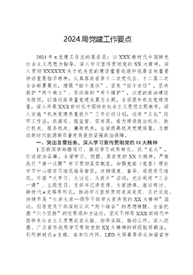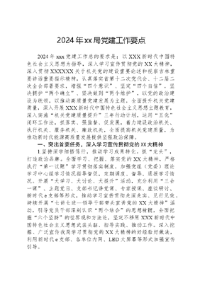 2024年xx局党建工作要点2024年xxx党建工作总的要求是:以XXX新时代中国特色社会主义思想为指导,深入学习宣传贯彻党的XX大精神,深入贯彻XXXXXX关于机关党的建设重要论述和视察吉林重要讲话重要指示精神,认真落实省第十二次党代会、十二届二次全会部署要求,增强四个意识、坚定四个自信,坚决拥护两个确立、坚决做到两个维护,以党的政治建设为统领,以推动高质量党建发展为主题,全面提升机关党建质量,深入开展XXX新时代中国特色社会主义思想主题教育,深入实施机关党建质量提升三年行动计划,运用五化闭环工作法,抓落实、强监督、促发展,着力建设政治机关、执行机关、服务机关、廉政机关,全面提高机关党建质量,为推动新时代能源高质量发展提供坚强政治保障。一、突出首要任务,深入学习宣传贯彻党的XX大精神1.坚持深学细悟笃行,推动学习成果转化。抓龙头,打造政治品牌。全面学习、把握、落实党的XX大精神,严格执行第一议题学习贯彻落实制度,加强党组(党委)理论学习中心组学习情况指导督促,定期调度、督导、通报学习情况。开展大学习、大讨论、大提升活动,充分利用三会一课、主题党日、支部书记讲党课、专家授课、座谈研讨、新时代e支部等形式,推动学习宣传贯彻走深走实、见行见效。持续开展七讲七进—领导干部带头宣讲党的XX大精神活动,引导党员干部深刻认识两个结合的思想精髓,全面把握六个坚持的世界观和方法论,坚定不移用XXX新时代中国特色社会主义思想武装头脑、指导实践、推动工作。深入挖掘、广泛宣传我局学习贯彻党的XX大精神的好经验好做法,利用新时代e支部、各单位内网、LED大屏幕等形式加强宣传引导。2.着力深化两确保一率先大调研大谋划活动。聚焦学习贯彻党的XX大精神、高质量党建服务高质量发展、两确保一率先目标完成等,立足本省能源资源禀赋,充分发挥部门职能作用,通过做优做精传统能源和做大做强新能源产业,不断深化能源供给侧结构性改革,深入实施11125新能源发展重点任务,重点建设陆上风光三峡、吉电南送特高压通道、新能源装备制造产业链、绿电园区,以及生物质能源利用、氢能开发利用、电能替代、抽水蓄能电站建设、新能源乡村振兴五大示范工程。按照省直机关工委大调研大谋划要求,我局班子成员和各支部书记年内至少拿出1个月时间到基层调研,至少形成1篇有情况、有分析、有对策的调研报告。积极参加省直机关工委优秀调研成果评比活动,抓好理论成果向实践转化运用。二、突出统领地位,着力加强机关党的政治建设3.坚决做到两个维护。强化政治机关意识,聚焦和平时期四个能不能标准要求,以对党忠诚,从我做起为主题,持续开展多种形式的对党忠诚教育,切实把对党忠诚体现到对党的信仰、党的组织、党的理论和路线方针政策上。开展对各支部贯彻落实党的XX大和省第十二次党代会精神监督检查,推动XXXXXX重要指示批示精神、党中央重大决策部署和省委工作要求落地落实,引导党员干部深刻领悟两个确立的决定性意义,增强四个意识、坚定四个自信、做到两个维护。4.深化政治机关和模范机关创建。紧扣三个表率和讲政治、守纪律、负责任、有效率模范机关建设要求,进一步细化创建标准、明确创建目标、夯实工作举措,持续推动政治机关和模范机关创建工作走深走实。年内,党组(党委)书记围绕学精神、悟思想建设政治、执行、服务、廉政四型模范机关进行一次专题党课。5.严肃党内政治生活。认真落实三会一课、主题党日、民主生活会和组织生活会等制度,坚持和完善重温入党誓词、党员过政治生日等政治仪式。开展党的组织生活制度落实情况排查整治活动,着力解决组织生活不严肃、不规范、不及时、不经常等问题,不断增强党内政治生活的政治性、时代性、原则性、战斗性。6.全面提升政治能力。把政治能力建设纳入各级党员干部教育培训计划,组织开展党务干部培训班、党性教育专题培训班,不断提高政治判断力、政治领悟力、政治执行力。引导党员干部积极投身乡村振兴、重大项目建设等工作第一线,在艰苦复杂环境中磨炼政治品格、提高政治能力,加强斗争精神和斗争本领养成。着眼于解决干部党务工作方面相关问题,在传统专题培训、支部学习的基础上,探索我局培训新途径,分批次组织党员干部到通化市杨靖宇干部学院轮训。7.履行管党治党政治责任。认真落实《党委(党组)落实全面从严治党主体责任规定》,进一步压实党组(党委)书记领导责任、机关党委书记直接责任、党支部书记主体责任,推动党组(党委)领导班子成员履行一岗双责。加强对各级党委、支部工作指导,促进工作联动。三、突出凝心铸魂,不断深化党的创新理论武装8.开展党员教育活动。通过主题党日等形式,有序开展党建活动,按照分级分类和全员培训的原则,在加强经常性教育的基础上,根据
