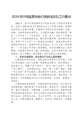 2024年市场监管综合行政执法支队工作要点2024年,X市市场监管综合行政执法支队工作的总体要求是:坚持以XXX新时代中国特色社会主义思想为指导,按照市局党组X工作重点部署,坚持稳中求进的工作总基调,完整、准确、全面贯彻新发展理念,主动服务和融入新发展格局,锚定一个总目标——全省前列、全国一流;突出三项重点任务——实施高效能执法、服务高质量发展、推动高品质生活;统筹四个关系——统筹执法和服务,统筹发展和安全,统筹秩序和活力,统筹区市和条线执法;在六个方面提质增效——在全面从严治党上提质增效,在民生领域执法上提质增效,在统筹区市执法力量上提质增效,在优化营商环境上提质增效,在工作模式上提质增效,在队伍建设上提质增效。一、坚持党建统领,在全面从严治党上提质增效1.建设政治型党组织。用政治眼光观察和分析问题,不折不扣贯彻落实上级工作部署,提高政治判断力、政治领悟力、政治执行力,增强四个意识,坚定四个自信,做到两个维护。深化理论武装,落实第一议题制度,设置书记讲堂等平台载体,调动理论学习热情。落实意识形态网络意识形态.工作责任制,以正确的政治方向、舆论导向、价值取向,牢牢掌握意识形态工作的领导权、主动权、管理权、话语权。2.建设规范型党组织。加强党建标准化建设,建立健全各项规章制度,确保党建工作有章可循、规范有序。加强党员教育,通过开展党课、专题讲座、交流研讨等活动,提高党员的思想觉悟和政治素质,提升自身的专业能力和实践本领。严肃党内生活,以组织生活会、民主评议党员、谈心谈话等活动为切入点,开展对照检查,照镜子、正衣冠,革新净化、完善提高。3.建设创新型党组织。创新组织生活方式,丰富组织生活的内容和形式,提高组织生活的质量和效果。推进党建与X、综合执法等工作融合,聚焦一抓两转,研究与区市.局执法部门党建共建模式,定期与共建单位互动,深入交流,学习借鉴,推动条线党建共建,实现业务协同。4.建设廉洁型党组织。开展全过程廉洁执法监督,事前警示教育,讲廉政故事、看廉政影视、观红色基地,充分运用第一种形态,用身边人、身边事、身边教训提醒告诫,咬耳扯袖,红脸出汗,让党员干部人人知敬畏、事事存戒惧。事中深入开展廉政风险防控,把住立案、案审等关键环节,严防选择性执法、有案不立、滥用自由裁量权;事后组织廉政回访,加强执法行为监督,推进严格规范公平公正文明执法,确保党员干部心态纯净、灵魂洁净、执法干净。二、坚持人民至上,在民生领域执法上提质增效5.深入开展民生领域案件查办铁拳行动。聚焦重点风险领域、消费者投诉举报集中的领域、行业潜规则较多的领域,严厉打击侵害群众利益、扰乱市场秩序、危害公共安全的违法行为,着力防范化解市场隐患,全力守护人民群众切身利益,查办并曝光一批应民需、解民忧、暖民心的大案要案,争创一批国家级、省级典型案例,达到查办一案、警示一片、规范一方的整治效果,以可感可及的扎实成效守护好人民群众的获得感、幸福感、安全感。6.守牢一排底线。守牢食品、药品、特种设备、工业产品安全,聚焦校园周边、旅游景区、农村消费市场等重点区域,聚焦婴幼儿食品、农资化肥等重点商品,聚焦一老一小等重点人群,精准打击各类违法行为,坚决防范区域性、系统性安全风险。加强与相关部门协作,始终保持对违法犯罪行为的高压态势。7.突出专项执法。突出违法行为多发频发群发的重要节点、重点区域、重点产品、重点业态,密切关注舆情燃点较低的节令性产品和群众生活必需品,组织节日市场专项检查、商品过度包装治理、综合治理加油机作弊等专项行动,从严从快查处哄抬物价、违规收费、计量作弊、霸王条款、违法广告、虚假宣传等违法行为,营造安全放心的消费环境。三、坚持全市一体,在统筹区市执法力量上提质增效8.创新督查督办机制。健全重大案件、重大事件的督查督办、应急指挥、舆情处置办法。加强对重点地区、重点问题和重大违法案件跟踪督办,形成行动组织、业务指导、数据通报、案例分析、工作总结的完整工作闭环。9.创新数据分析机制。依托案源管理平台,定期发布案源分析报告,及时发现苗头性、风险性、趋势性问题。每月通报全市案件查办情况,每季度发布全市案件分析报告,发挥全系统综合执法的中枢指挥部作用。10.创新执法服务联系点机制。分管领导常态化深入10个执法服务联系点开展工作,执法大队分9个条线对区市局进行业务指导。强化对区市局的类案指导、专案督办、大案攻坚,实行市局部署、区市同步、专家指导、技术补充、组团作战的工作模式,推动执法力量下沉,提升案件查办效能。11.创新执法协同机制。加强与执法单位、行业协会、社会团体协作互动,开辟执法协作快车道,协调落实跨部门联合执法工作,建立信息共享、情况通报、集中会商等工作制度。强化行政执法与刑事司法衔接,始终保持打击违法犯罪行为的高压