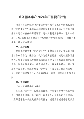 政务服务中心2024年工作提升计划为贯彻落实镇党委《关于在深化党史学习教育中开展党员干部作风建设年主题活动的实施方案》工作要求,补齐政务服务中心运行中存在的薄弱环节,进一步打通服务群众最后一公里,XXX根据《政务服务中心现场运行和管理规范》,结合本镇实际,特制定本计划。一、工作目标贯彻落实镇党委作风建设年主题活动精神,整治政务服务工作中不作为、慢作为、乱作为的突出问题,通过软硬件双重提升、服务评价量化考核提振政务服务中心干部精神面貌和工作水平,以群众需求第一、群众诉求第一、群众体验第一、群众满意第一为目标,用政务服务小小窗口为企业、群众提供暖、快、优的满满服务,打造XXX暖心、高效、规范的政务服务品牌。二、实施计划(一)政务服务能力提升1.实施三个一队伍建设行动。一是每月开展一次集中培训,围绕服务礼仪、业务流程、政策文件、专业知识开展培训;二是每月开展一次政风行风作风教育,通过集中观看警示纪录片表彰当月先进个人并介绍经验等对服务队伍加强教育督导;三是每月组织一次交流学习及业务考核,提升干部综合能力,强化一站式服务,推动一次性告知、首问负责制、容缺受理帮办服务等落实到位,让群众最多跑一次。2.完善服务事项分类处理机制。一是针对重点问题,政务服务中心业务实施分组管理,重点事项实施至少双人审核制,确保准确无误。二是针对难点问题或涉及接诉即办等影响较大的事项由科室负责人、主管领导、主要领导逐级提级协调办理。三是设置办不成事窗口,实施标签化、清单化管理,在15日内督办落实到位。以上事项在有必要时充分利用吹哨报到工作机制,协调相关部门共同办理。3.走实便民服务流程。定期由主管领导或其他班子成员到政务服务中心,以普通群众的身份申请办理有关事项,换位体验群众感受,把流程走深、走实,发现真问题,听到真声音,找到事项办理服务中的堵点、漏点,精准提升服务能力。(二)政府服务规范提升1.制定政务事项便民手册。梳理96项政务服务事项清单一次性告知内容,形成工作手册,明确政策依据、办理流程、工作周期、咨询电话等,为办事群众全面了解政务事项提供指南。2.建立政务服务月报机制。每月梳理政务服务事项办理数据情况、工作亮点举措、检查整改情况、问题建议及先进个人事迹形成月报报班子成员及区相关部门,寻找典型案例在全景XXX公众号予以宣传。(三)政务服务环境提升1.提升外部环境。配套中英文标识、无障碍车位,优化卫生间设施环境;每周开展政务服务中心卫生日活动,为办事群众提供干净、舒心办事环境。2.完善内部设施。升级叫号器、自助查询设备、服务评价器配套网络和办公电脑,强化便民服务保障;增设监控设备及录音电话等硬件设施,确保政务服务流程可追溯,服务事项规范有序结合疫情防控要求,完善一米线、消杀防护设施用品等。三、保障机制1.制定考核细则。围绕政风行风作风、业务技能与工作实绩出勤值勤情况等方面制定考核细则,每月进行一次汇总评分,评分结果公示后报主管领导、主要领导审阅,并作为月度考核的主要评价依据(见附件)。2.建立多层次监督评价体系。一是以群众满意度为核心,结合服务评价器满意度情况、群众投诉或表扬情况、办件数量及质量情况进行评价。二是设置政务服务监督小组,由便民服务中心三名以上同志进行日常监督。三是聘请对政务服务工作有过不满意或提出过意见建议(如拨打过12345提出相关诉求)的群众作为日常监督员,根据提出的问题进行扣分。四是由作风建设年主题活动领导小组、纪委、主管领导对工作情况进行抽查予以评价。3.建立奖惩机制。根据考核评价结果,每月在政务服务中心工作人员中评出一名窗口之星,发放流动红旗,给予一定的奖金或奖品奖励,并通过政风行风作风教育会、微信公众号、作风建设年主题活动等途径表彰先进事迹。综合每月考核情况,年度考核情况作为评优评先、职务晋升重要依据。对于考核不合格或长期排名靠后人员,根据实际情况采取批评教育、书面检查、约谈、调岗或辞退等措施。附件:XXX政务服务考核评分细则附件XXX政务服务考核评分细则一、评分细则(一)政风行风作风(30分)思想作风正,大局观念强,服务态度优,遵纪守法好,得30分。在工作时间有下列情形者,给予扣分:1.着装不规范,每次扣3分。2.无故串岗、溜岗,每次扣5分。3.在办公场地嬉笑、打闹、大声喧哗、搭肩挽臂、吹口哨,每人每次扣3分。4.在办公场地睡觉、抽烟、进行上网游戏、聊天、下棋、打牌、观看电视剧等娱乐活动的,每次扣5分,被上级检查组通报的每次扣10分。5.服务评价器反馈显示不满意的,每次扣3分;因服务态度不热情或恶劣,引起服务对象反感的,每次扣5分;与服务对象争吵或导致服务对象投诉、上访,经查属实的,每次扣10分。6.不服从工作安排,协调办理事项不积极主动,每次扣10分7.应即时办