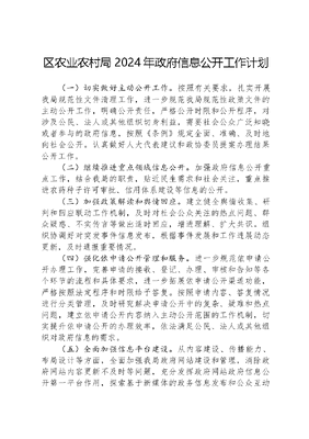 区农业农村局2024年政府信息公开工作计划(一)切实做好主动公开工作。按照有关要求,扎实开展我局规范性文件清理工作,进一步规范我局规范性政策文件的主动公开工作,明确公开责任,严格公开时限和公开程序,对涉及公民、法人或其他组织切身利益,需要社会公众广泛知晓或者参与的政府信息,按照《条例》规定全面、准确、及时地向社会公开。认真做好人大代表建议和政协委员提案办理结果公开工作。(二)继续推进重点领域信息公开。加强政府信息公开重点工作,结合我局的职责,贴近民生需求和社会关注,重点推进农药种子许可审批、信用体系建设等信息的公开。(三)加强政策解读和舆情回应。建立健全舆情收集、研判和回应联动工作机制,及时对社会公众关注的热点问题、群众疑惑、不实传言等做出适时回应,增进理解、扩大共识。组织协调好对突发事件信息发布,根据事件发展和工作进展动态更新,及时通报重要情况。(四)强化依申请公开管理和服务。进一步规范依申请公开办理工作,完善申请的接收、登记、办理、审核和告知等各个环节的流程和具体要求,进一步拓展依申请公开渠道功能,严格按照法定程序和时限给予答复。按照申请内容、答复情况进行分类管理,及时研究解决申请公开中的复杂、疑难和热点问题,建立依申请公开内容纳入主动公开范围的工作机制,切实提升依申请公开的办理效率,依法满足公民、法人或其他组织对政府信息的需求。(五)全面加强信息平台建设。从内容建设、传播能力、布局设计等方面,全面加强我局政府网站建设和管理,消除政府网站内容更新不及时等问题,充分发挥政府网站政府信息公开第一平台作用,探索基于新媒体的政务信息发布和公众互动交流新渠道。
