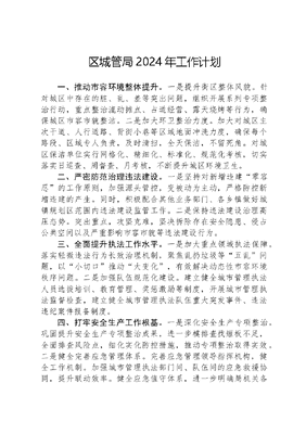 区城管局2024年工作计划一、推动市容环境整体提升。一是提升街区整体风貌。针对城区中存在的脏、乱、差等突出问题,组织开展系列专项整治行动,重点整治流动摊点、占道经营、露天烧烤等行为,确保城区市容市貌整洁。二是加大环卫整治力度。加大对城区主次干道、人行道路、背街小巷等区域地面冲洗力度,确保每个路段、区域专人负责,及时清扫,全天保洁,不留死角。对城区保洁单位实行网格化、精细化、标准化、规范化考核,切实落实日巡查、周督查、月考核,不断提升城区环境卫生。二、严密防范治理违法建设。一是坚持对新增违建零容忍的工作原则,加强源头管控,变被动为主动,严格防控新增违建的产生。同时,积极配合其他业务部门、各乡镇做好城镇规划区范围内违法建设监管工作。二是保持违法建设治理高压态势。突出重点,攻坚克难,坚决拆除存在安全隐患、侵占公共空间以及严重影响市容市貌等违法建设行为。三、全面提升执法工作水平。一是加大重点领域执法保障。落实轻微违法行为长效治理机制,聚焦乱扔垃圾等五乱问题,以小切口推动大变化,有效解决动态性市容环境秩序问题。二是加强队伍规范化建设。建立健全城市管理执法人员选拔培训、教育管理、奖惩激励等制度,开展城市管理执法监督检查,建立健全城市管理执法队伍重大突发事件、违法违纪案件报备制度。四、打牢安全生产工作根基。一是深化安全生产专项整治。巩固提升安全生产专项整治成果,进一步模排查找短板不足,全面排查风险点,细化实化防控措施,推动专项整治取得实效。二是健全完善应急管理体系。完善应急管理领导指挥机构,健全工作机制。加强城市管理执法部门间、队伍间的应急救援协同,提升联动效率。健全应急值守体系,进一步明确局机关各类值班人员职责,细化值班流程,提高突发事件处置能力。五、统筹推进其他工作。根据区委、区政府统一部署,结合城管工作实际,统筹推进安全生产、文明创建、卫生城市创建、环境保护、落实营商环境等其他工作。