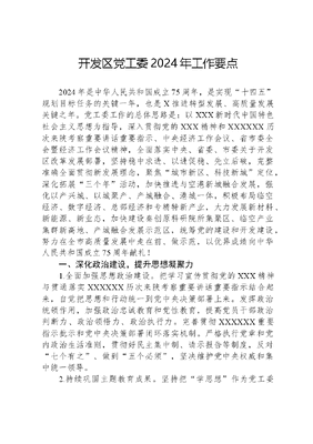 开发区党工委2024年工作要点2024年是中华人民共和国成立75周年,是实现十四五规划目标任务的关键一年,也是X推进转型发展、高质量发展关键之年。党工委工作的总体思路是:以XXX新时代中国特色社会主义思想为指导,深入贯彻党的XXX精神和XXXXXX历次来陕考察重要讲话重要指示、中央经济工作会议、省市委全会暨经济工作会议精神,全面落实中央、省委、市委关于开发区改革发展部署,坚持稳中求进、以进促稳、先立后破,完整准确全面贯彻新发展理念,聚焦城市新区、科技新城定位,深化拓展三个年活动,加快推进与空港新城融合发展,强化以产兴城、以城聚产、产城融合、港城一体,积极布局临空经济、数字经济、总部经济和专精特新产业,大力发展新材料、新能源、新业态,加快建设秦创原科研院所集聚区、临空产业集群新高地、产城融合发展示范区,统筹党的建设和开发建设,努力在全市高质量发展中走在前、做示范,以优异成绩向中华人民共和国成立75周年献礼!一、深化政治建设,提升思想凝聚力1.全面加强思想政治建设。把学习宣传贯彻党的XXX精神与贯通落实XXXXXX历次来陕考察重要讲话重要指示结合起来,自觉把思想和行动统一到党中央决策部署上来。发挥政治统领作用,加强政治忠诚教育和党性教育,提高党员干部政治判断力、政治领悟力、政治执行力。完善贯彻XXXXXX重要指示批示和党中央决策部署闭环落实机制。严格执行党章和党内政治生活准则,贯彻好民主集中制、请示报告等制度,反对七个有之、做到五个必须,坚决维护党中央权威和集中统一领导。2.持续巩固主题教育成果。坚持把学思想作为党工委会议第一议题、集体学习第一主题、干部培训第一主课,自觉用新思想凝心铸魂。在深化上聚力用劲,坚持读原著学原文悟原理,全面把握重要思想的世界观、方法论和贯穿其中的立场观点方法,真正掌握马克思主义看家本领。在内化上聚力用劲,深化党史学习教育,不断筑牢信仰之基、补足精神之钙、把稳思想之舵,教育引导党员干部坚定拥护两个确立,坚决做到两个维护。在转化上聚力用劲,发扬理论联系实际的马克思主义学风,从中找方向、找方法、找思路、找遵循,把学习成效转化为推动经开区高质量发展的生动实践。3.加强学习教育培训力度。制定年度培训计划,深入实施干部专业化能力提升培训工程,采取走出去、请进来等方式加强培训教育,健全干部常态化实践锻炼机制,着力提升干部推动高质量发展、防范化解风险、服务群众的能力。加大走出去培训、交流力度,开阔视野,提升干部的全球思维、开放观念、经营意识、素养能力。制定党工委理论学习中心组专题学习计划,开展理论学习提质增效行动,深化拓展列席旁听工作。持续用好学习强国、干部网络学院、大讲堂等平台载体,提升学习质效。4.落实意识形态工作责任制。深入学习贯彻XXX文化思想,讲好开发区故事,唱响主旋律,弘扬正能量。继续把意识形态工作纳入党建、目标责任制考核、民主生活会和述职述廉报告等重要内容。建强意识形态工作机构,完善统筹协调机制,加强意识形态领域形势研判和舆情分析,监测苗头性、倾向性、煽动性信息,及时发布预警风险提示。加强舆论宣传引导,稳妥处置热点敏感舆情,做好群众思想政治工作和心理疏导。加强官媒官网、微信公众号管理,推进三审三校制度落地落实。二、紧盯重点工作,提升党建引领力5.聚力党建+产业培育。依托X等,着力打造百亿元以上临空产业集群。围绕X打造30亿元产值新材料产业基地和50亿元产值新能源产业基地。着力发展数字经济,加快数字应用场景建设,推进园区数字产业化、治理数字化。把招商引资作为高质量发展的重要抓手,用好投行思维、链式思维、闭环思维,强化产业链招商、资本招商、以商招商、全员招商,招大引强、招强引优,吸引更多头部企业、重大项目落户开发区。6.聚力党建+城市品质。坚持高水平建设,精细化管理,全功能配套,让城市更聚人气、更添活力、更富魅力。着眼产城融合发展,优化城市布局,完善城市功能,推进高品质住宅开发、城中村拆迁安置,抓好商业、酒店、学校、医院等功能配套。强化与陕西师范大学的合作,提升学校品质,打造基础教育质量新的增长极。开工建设三级医院,以更加优质完善的公共服务提升开发区吸引力、竞争力。扎实开展环境大整治管理大提升形象大改善攻坚行动,优化人居环境。7.聚力党建+项目建设。深化拓展高质量项目推进年活动,全面落实五个一线工作法,下沉项目一线,紧盯项目建设制约因素,现场办公,逐一破解,对X个重点项目,顺排工序、倒排工期、挂图作战,做到月月开工新项目,季季有观摩新项目。强化要素保障,保障各项目按时间节点开工建设、顺利竣工验收、按期建成投产,确保一季度项目开工率达到50%、二季度达到90%。重点推进X等重大项目建设。8.聚力党建+风险化解。统筹发展和安全,加强重大风险隐患防范化