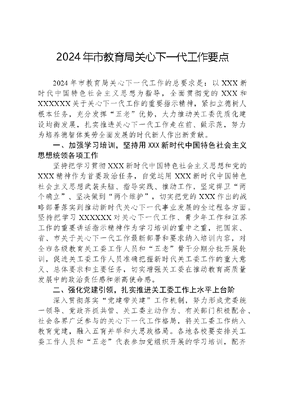 2024年市教育局关心下一代工作要点2024年市教育局关心下一代工作的总要求是:以XXX新时代中国特色社会主义思想为指导,全面贯彻党的XXX和XXXXXX关于关心下一代工作的重要指示精神,紧扣立德树人根本任务,充分发挥五老优势,大力推动关工委优质化建设均衡发展,扎实推进关心下一代工作走在前、做示范,努力为培养德智体美劳全面发展的时代新人作出新贡献。一、加强学习培训,坚持用XXX新时代中国特色社会主义思想统领各项工作坚持把学习贯彻XXX新时代中国特色社会主义思想和党的XXX精神作为首要政治任务,自觉运用XXX新时代中国特色社会主义思想武装头脑、指导实践、推动工作,坚定捍卫两个确立、坚决做到两个维护,切实把党的XXX作出的战略部署落实到推动新时代关心下一代事业发展的全过程各方面。坚持把学习XXXXXX对关心下一代工作、青少年工作和江苏工作的重要讲话指示精神作为学习培训的重中之重,把国家、省、市关于关心下一代工作最新部署和要求纳入培训内容,对全市各级教育关工委工作人员和五老骨干分期分批开展轮训,促进关工委工作人员准确把握新时代关工委工作的重大意义、总体要求和主要任务,切实增强关工委在推动教育高质量发展中的政治责任感和崇高使命感。二、强化党建引领,扎实推进关工委工作上水平上台阶深入贯彻落实党建带关建工作机制,努力形成党委统一领导、党政齐抓共管、关工委主动作为、有关部门积极配合、社会各界广泛参与的关心下一代工作格局,将关工委工作纳入教育党建,融入五育并举和大思政格局。各地各校要安排关工委工作人员和五老代表参加党组织开展的学习培训,配齐配强关工委领导班子,落实好单位党政主要负责人担任关工委主任、分管领导和老同志担任常务副主任、常务副主任和秘书长双配置的要求。执行好党组织定期听取关工委工作汇报、关工委在职领导年度述职、关工委成员部门议事制度。保证关工委工作经费纳入各级教育行政部门和学校的年度预算,做到关工委有专门办公场所,配备相应办公条件,保障驻会老同志有工作补贴。加强五老队伍建设,着力在五老接续机制建设、优质资源共享、先进典型宣传上下功夫,鼓励和支持更多五老特别是退休党员干部、优秀教师积极参与关心下一代工作,全面打造各级教育关工委坚强有力的带头人队伍、奋发有为的骨干者队伍、热心参与的志愿者队伍。三、坚持立德树人,持续深化青少年理想信念教育坚持把党的创新理论武装作为铸魂之本,建好建强以五老为主体的讲师团,创新宣讲形式,深入开展面向青少年的学习宣传工作,增强青少年与党同心、跟党奋斗的坚定意志,自觉担负请党放心、强国有我的时代使命。坚持把理想信念教育作为青少年思想建设的战略任务,以庆祝中华人民共和国成立75周年为契机,广泛发动、扎实开展老少同声爱国情同心奋进新征程和读懂中国等系列教育活动。抓好科技强国,担当有我我以祖国为荣文化塑造未来,读书点亮人生和祖国在我心中爱国从我做起等主题读书征文活动。全面实施文化塑造未来铸魂工程,充分挖掘*本地优秀历史文化资源,用好《红色云溪》《逐梦云溪》《菁华云溪》等青少年修身读本,持续开展*三杰作引领,红色基因入我心主题教育,全力打造教育关工委行走的思政课工作新品牌。四、夯实工作基础,积极推进关工委建设优质均衡发展根据省教育系统关工委的统一部署,进一步优化完善优质化建设均衡发展实施方案,切实加强对学校关工委优质化建设的指导和督查。列入第三批关工委优质化建设创建的学校,要文可居文库——海量学习资料,手机电脑均可下载www.wenkeju.com对照全省关工委优质化建设均衡发展基本要求,找差距、补缺口,年内力争全市近60%的中小学、幼儿园基本达到关工委优质化建设标准。积极开展关工委优质化建设均衡发展调查研究,重点围绕党建带关建基层关工委优质化建设长效机制的建立等主题撰写优秀工作论文和调研报告。五、拓展平台载体,不断提高青少年精准关爱工作实效各级教育关工委根据青少年学生的实际需求,搭建好能为青少年提供精准服务的关爱工作平台,引导青少年学生形成自尊自信、理性平和、积极向上的人生态度。重点关注青少年心理健康,协同相关职能部门,加强生命教育、挫折教育,及时做好情感关怀、心理疏导、情绪引导、危机干预。进一步做优做强各地各校关工委多年来形成的结对帮教爱心助学家教讲坛四点钟课堂青蓝工程等工作品牌。围绕双减后中小学生的新需求和增长点,运用多种方式,协同多方力量,发挥教育系统关工委五老师资力量丰富等优势,助力课后服务。拓展代理家长制爱心结对等工作品牌新内涵,用心用情帮助困难学生,关爱留守儿童,坚持不懈地为青少年做好事、办实事、解难事。六、深化协同共育,助力创设优良育人环境深入落实《中华人民共和国