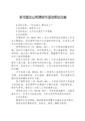某市国企公司清明节活动策划方案1.活动主题:怀古追今 悼念先人2.活动时间:清明节当日3.活动地点:公司会议室及户外场地4.活动流程:开幕致辞(9:00-9:30):由公司领导或活动策划人员发表主题演讲,讲述清明节的文化内涵和传统价值,引导员工思考生命的意义和对先人的缅怀之情。清明祭祀仪式(9:30-10:30):在户外场地设置祭祀区域,组织员工整齐列队,共同祭拜先人。可以准备鲜花、香烛等祭品,由主持人带领大家进行默哀、敬献鲜花等仪式,表达对先人的深切敬意。传统文化体验(10:30-12:00):在会议室或特定区域设置多个展示桌,展示清明节的传统习俗,如包粽子、制作清明团子等。安排专业人员现场指导,让员工亲身体验传统手工艺的乐趣。文艺表演(14:00-15:30):邀请员工自愿报名参与文艺表演,包括诗歌朗诵、音乐演奏、舞蹈表演等。可以设置奖项,增加活动的趣味性和参与度。亲子DIY活动(15:30-17:00):为有孩子的员工准备亲子活动区域,提供清明节主题的手工制作材料,如绘制彩蛋、制作风筝等。增进员工与家人之间的情感交流。清明茶话会(17:00-18:00):在轻松的氛围中,设置茶座和点心,让员工们自由交流,分享对清明节的感受和思考。5.活动准备:提前预订活动场地,确保场地的布置和设施符合活动需求。准备活动所需的物资,如祭品、鲜花、DIY材料等。邀请专业的表演人员或志愿者,确保文艺表演的质量。安排工作人员负责活动的组织和协调,确保活动的顺利进行。6.活动宣传:在公司内部发布活动通知,包括活动时间、地点、流程和亮点等。制作宣传海报或电子屏幕展示,吸引员工的关注和参与。鼓励员工邀请家人和朋友一起参加活动,扩大活动的影响力。7.活动评估:活动结束后,收集员工的反馈意见和建议,对活动效果进行评估。分析活动的优点和不足之处,为今后的活动改进提供参考。文可居文库——海量学习资料,手机电脑均可下载www.wenkeju.com