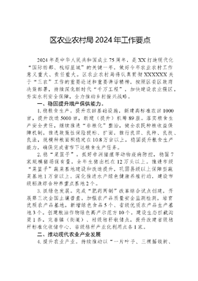 区农业农村局2024年工作要点2024 年是中华人民共和国成立75周年,是XX打造现代化国际纺都、杭绍星城的关键一年,做好今年农业农村工作意义重大、责任重大。区农业农村局将认真贯彻XXXXXX关于三农工作的重要论述和重要讲话精神,按照区委区政府决策部署,持续深化新时代千万工程,加快建设农业强区,夯实水利安全保障,全力推动乡村振兴战略。一、稳固提升增产保供能力。1.稳粮食生产。提升农田基础设施,新建高标准农田1000亩,提升改造5000亩,新建(提升)机埠89座。落实粮食生产安全责任,继续推进非粮化整治,健全农民种粮收益保障机制,推进政策性保险提标、扩面,推行良田、良种、良技、良法,规模种粮面积稳定在10.8万亩以上,稳固提升粮食生产能力,确保完成省市下达粮食生产任务。2.稳菜篮子。抓好非洲猪瘟等动物疫病防控,稳固7家规模猪场保有量,全年生猪出栏在12万头以上。推进市级菜篮子蔬菜基地建设和改造提升,巩固县级以上保障型蔬菜基地1万亩以上。深化推进水产绿色健康养殖行动,建设市级稻渔综合种养重点基地2个。3.抓绿色发展。完成肥药两制改革综合试点创建,开展第三次全国土壤普查。加强农产品质量安全监测检测,培育优质农产品基地,新增绿色食品5个、省级优质农产品生产基地3个。创建粮油作物绿色高产示范方10个。建设生态拦截沟渠1条,完善镇(街道)、村级秸秆收储点,提升改建省级秸秆标准化收储中心、省级秸秆产业化利用点各1家。二、推动现代农业产业发展4.提升农业产业。持续推动以一片叶子、三棵摇钱树、五朵金花为代表的135产业集群发展,举办兰花节开茶仪式等农事节会,提升区域公用品牌。积极开展招商引资,加快农业农村重大项目建设,计划完成农业农村重大项目投资2亿元以上。支持农业企业做大做强,争取新增区级以上农业龙头企业3家、国家重点农业龙头企业 1 家。5.推进 机械强农。持续开展农业机器换人高质量发展一县三基地创建,建设1个农机创新试验基地、4家农机服务中心、10个全程机械化应用基地。加快推进滨海省级现代农事服务中心建设。6.推进科技强农。加强基层农技推广体系建设,创建高品质绿色科技示范展示基地和低碳农场3家。实施现代新农人培育行动,培训农村实用人才1500人、高素质农民200人,农创客培育达300名。培育发展数字工厂(未来农场)2个。加快完成东湖农场提升项目建设,打造红色农场、双强农场。三、加快推进和美乡村建设。7.和美乡村建设。坚持和深化新时代千万工程,加快建设宜居宜业和美乡村,推动美丽乡村示范带内涵式生长,打造省市级未来乡村4个,区级未来乡村46个,创建和美乡村43个,和美乡村覆盖率达到40%。创建1个市级和美越乡精品片区、2个省级和美乡村示范乡镇。8.推进城乡融合。大力开展城乡提升工程,紧扣公共服务七优享,突出一老一小标配和选配,结合区共富星村创建,推进城乡基础设施一体化和基本公共服务均等化,全面提升乡村优质公共服务的饱和度。实施打破要素错配壁垒促进强村富民试点,探索形成以集体经济为核心的强村富民新机制,积极探索城乡融合路径和特色做法。9.提升农村人居环境。巩固提升一分两清三化整治成果,实施农房改造、管线序化、村道提升三大行动,塑造乡村风貌,持续开展城乡环境整治月度抽考工作,确保农村人文可居文库——海量学习资料,手机电脑均可下载www.wenkeju.com居环境整治保持全市领先。四、持续巩固强村富民。10.巩固集体经济。制定出台新一轮强村三年行动方案,巩固强村消薄基金规模,打造8个乡村共富联合体,提升飞地抱团项目,加强村公司管理,巩固年经营性收入120万元以上行政村全覆盖,村均集体经济增长8%以上。11.提升农民收入。全面落实强农惠农富农各项政策措施,打造多种农房+产业链,持续开展闲置农房激活,做强农村电商、乡村旅游、民宿经济等业态。加强农民素质培训,落实低收入农户精准帮扶,推进低收入农户公益性岗位建设,巩固低收入农户医疗补充政策性保险全覆盖,低收入农户收入增长12%以上。农民人均可支配收入全省领先。 12.深化农村改革。深化农村宅基地两项试点工作,推动2-3个宅改项目落地,规范宅基地审批管理,全面完成部级宅基地制度改革评估,平稳有序开展农村乱占耕地建房住宅类房屋专项整治。利用全国农村改革试验区平台,扎实推进全国强村富民集成改革体系试点建设,做好经验总结推广。规范做好被征地农民社会保障工作。推进国家典型地区再生水利用配置试点改革、王坛镇蒋相村标准地县级试点,完成全国乡村振兴示范区创建。五、建设安全幸福新河湖。13.江河安澜达标提质。加快补齐防洪排涝短板,统筹推进全区水网建设,重点推进海塘安澜、小舜江北溪王坛段综合治理等重点水利工程