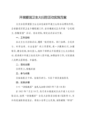 开展爱国卫生大扫除活动实施方案为充分发挥爱国卫生运动在城市环境卫生综合治理的作用,全面推进国家卫生乡镇创建工作,在本镇建成区内开展全民创卫,扮靓家园活动。结合实际,制定此次活动方案。一、工作目标本次卫生大扫除活动,遵循政府组织、部门协调、全民参与、科学治理、社会监督的工作原则,进一步提高认识,加强领导,健全机制,加大投入,组织干部群众开展爱国卫生大扫除运动,改善城乡环境卫生状况和人居环境,加强宣传引导,切实提高人民群众获得感、幸福感。二、活动主题全民创卫,扮靓家园三、参与对象全体镇机关干部、驻镇各单位、社区干部及集镇居民四、实施步骤(一)洁镇靓家全民大扫除(2023年7月-10月)自2023年7月至10月,每月在本镇建成区内开展1次大扫除活动,按照洁镇靓家全民大扫除活动标准(见附件1),室外彻底清除房前屋后、背街小巷等卫生死角,清除病媒四害孳生地,室内要按照翻箱倒柜的原则对各处卫生死角进行彻底冲洗与打扫,机关、建成区内村(所)和驻镇各单位要对本单位内部环境卫生开展大清扫。(二)卫生巩固提升(2023年11月-12月)在开展全民大扫除活动的基础上,针对督查指导发现一些卫生薄弱环节或需要长期整改推进的点位,以问题为导向,制定长效管理方案,落实全面改、长效整、彻底治,配足人员力量,做好经费保障,完善工作制度,持续推动卫生保洁工作任务有力有效落实。五、工作要求(一)加强组织领导。各部门单位、各村(所、社区)要加强对此次环境卫生整治工作的组织领导,坚持谁主管、谁负责的原则,各司其职,各担其责,严禁推诿扯皮,确保此次环境卫生整治工作落到实处。本次活动实行相关领导挂点包片责任制(见附件2),点对点开展卫生督导,指导、帮助解决此次活动中的实际问题,高位推动任务落实。(二)广泛宣传发动。各部门各单位、各村(所、社区)要开展市容环境卫生整治宣传,进一步扩大市民群众的知晓度、参与度,在集镇营造创卫保卫、人人有责的浓厚氛围。文可居文库——海量学习资料,手机电脑均可下载www.wenkeju.com(三)压实工作责任。各部门各单位、各村(所、社区)要高度重视,严格按照活动方案的要求,确保本单位负责的范围内环境卫生达到高标准。(四)强化时间观念。本次大扫除活动,必须每月规定时间前及时完成。(五)强化督促指导。每月大扫除活动由镇纪委联合镇创卫办负责对活动开展情况进行督导,对发现的问题要现场反馈并及时跟进整改情况,对于屡次不改的责任单位予以通报。附件:1.洁镇靓家全民大扫除活动标准附件1洁镇靓家全民大扫除活动标准为深入推进我镇创建国家卫生乡镇工作,根据工作安排,集中开展以清除卫生死角和四害(老鼠、苍蝇、蚊子、蟑螂)孳生地为重点的洁镇靓家全民大扫除活动。现就活动要点明确如下:—、活动目的(一)室内外环境卫生整洁,物品摆放整齐有序,清除四害尸体、鼠粪璋迹、鼠咬鼠洞所有痕迹。(二)清除集镇建区环境垃圾及卫生死角、积水等各类四害孳生地。文可居文库——海量学习资料,手机电脑均可下载www.wenkeju.com二、室外场所打扫要点(一)房前屋后进行清扫,对乱堆乱放、裸露堆放、背街后巷和房前屋后隐蔽死角处的垃圾进行彻底清理;公共卫生设施完好、无缺损,单位责任区范围干净、整洁、有序;地面无坑洼、污水横流,无乱堆乱放、乱披乱挂;楼房外墙清洁,无乱涂乱画乱贴现象。(二)清除街道、住宅小区、城中村、城乡结合部、院落、道路两旁和绿化带内杂草、各类垃圾、烟头等杂物;清除利用公用绿化地带或自家门前绿地的种菜现象和散养家禽家畜现象。(三)做好封堵鼠洞、填抹墙缝、平整洼地、疏通沟渠、清理小区广场等处景观池内污水死水、清除室外盆罐、废旧轮胎等积水容器内积水。对不能清除的景观积水采用投放安倍等化学方法或放养鱼类等生物方法清除蚊蝴。(四)及时清运垃圾,管好厨余食品。三、室内场所打扫要点对各类室内场所进行搬家式、翻箱倒柜式的大扫除,重点清理卫生死角,除常规拖地、擦窗外,更要做好各类隐蔽拐角处的卫生。(一)办公场所文可居文库——海量学习资料,手机电脑均可下载www.wenkeju.com1.室内、走廊、过道地面、会议室干净、整洁,桌椅摆放整齐、干净、无灰尘,各类资料摆放规范不零乱,窗户透明无积尘,墙体无乱贴乱挂,无蜘蛛网,墙面清洁。2.将室内空调机、文件柜(顶、底、背面)先移位后清扫,对办公桌抽屉、门窗框等容易忽视的地方,彻底清理鼠粪、蟑螂等痕迹。3.卫生间干净、无积水、无异味、无垢,洗手、冲洗设施完好,上下水通畅,保洁及时,定期消毒。垃圾篓内塑料袋及时更换,垃圾篓经常清洗,清洗工具摆放整齐不零乱。4.会议室等公共场所有禁烟标志,无烟具,无烟头,公用茶具及时清洗消毒。5.用橡皮泥、水泥等封堵
