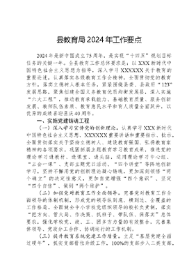县教育局2024年工作要点2024年是新中国成立75周年,是实现十四五规划目标任务的关键一年。全县教育工作总体要求是:以XXX新时代中国特色社会主义思想为指导,深入学习XXXXXX关于教育的重要论述,认真落实各级教育工作会精神,全面贯彻党的教育方针,落实立德树人根本任务,紧紧围绕县委、县政府123发展思路,聚焦创建全国义务教育优质均衡发展县,深入实施六大工程,推动教育承载能力、基础教育质量、服务创新发展、教师队伍素质、教育惠民水平和育人质量全面跃升,以优异的成绩喜迎县庆40周年。一、实施党建铸魂工程(一)深入学习宣传党的创新理论。认真学习XXX新时代中国特色社会主义思想、XXXXXX重要讲话和重要指示、批示,全面贯彻落实关于坚持立德树人、建设教育强国、弘扬教育家精神的各项要求。巩固拓展主题教育学习教育成果,推进党的理论学习进教材、进课堂、进头脑,运用理论学习中心组、三会一课、支部主题党日活动、四个讲堂等阵地创新学习,坚持不懈用党的创新理论凝心铸魂,更加深刻领悟两个确立的决定性意义,更加自觉增强四个意识、坚定四个自信、做到两个维护。(二)加强党对教育工作全面领导。完善党对教育工作全面领导的体制机制,形成党的领导纵到底、横到边、全覆盖的工作格局。全面健全中小学校党组织领导的校长负责制,落实把方向、管大局、作决策、抓班子、带队伍、保落实总体要求,强化学校党、政、工、团多方力量的有效整合,完善集体领导、党政分工合作、协调运行的工作机制。(三)提升教育系统党建工作质量。立足基层党建全面过硬年,抓实支部晋位升级工作,100%的支部步入二类支部,75%的支部步入一类支部。深入推进党建品牌创建工作,加强红旗支部建设,促进党建品牌与学校管理、校园文化、学校发展深度融合,引导学校凝炼出与教育教学相融合的党建工作品牌和党建文化。扎实开展书记口袋书党员承诺践诺党员示范岗党员责任区等工作,深入落实四下基层制度,积极参与基层社会治理。(四)规范干部选任培养机制。严格落实领导干部选拔任用管理条例,构建年龄结构合理、知识层次和专业水平匹配的学校领导班子团队,开展第五期教育后备干部的选拔与培养,举办教育干部履职能力培训班,选送30名中小学教育管理干部参加高级研修培训、能力提升培训。中小学新任校长100%参加资格培训,骨干校长100%参加高级研修培训,不断提升教育管理干部的素质与能力,培养一支爱学习、肯研究、善作为的干部队伍。(五)纵深推进党风廉政建设。严明党的政治纪律和政治规矩,突出政治忠诚教育、理想信念教育和纪律规矩教育,深学笃行XXXXXX关于党的自我革命的重要思想、全面从严治党战略部署。始终保持纠四风的高压态势,集中组织四风问题和财经纪律专项监督检查,对检查发现的四风问题和财务管理问题予以通报,对违规违纪责任单位和个人将依规依纪给予严肃处理。广泛开展普纪教育,把党章党规党纪纳入思想政治工作和教育培训内容,扎实开展党风廉政教育宣传教育月活动,筑牢思想防线。深入践行四种形态,敢抓敢管、真抓真管,严格执纪,对社会关注度高、群众反映强烈的问题,坚持有责必问、问责必严,严格依法依规治教。(六)提升教育系统意识形态工作水平。认真落实各基层党组织意识形态工作领导责任,坚持专题研究意识形态的工作机制,加强教育舆情引导,落实应对处置机制,严格执行意识形态风险排查月报告制度。加强教育宣传队伍建设,提升新闻宣传工作能力。重视传播手段建设和创新,完善《X教育》微文可居文库——海量学习资料,手机电脑均可下载www.wenkeju.com信公众号发布功能,加强政策解读、热点回应、亮点工作宣传。加强与主流媒体和新闻机构合作,借助主流媒体,讲好X教育故事。(七)加强群团统战、老干部以及关工委工作。坚持党建带团建、队建,加强学校团组织和少工委建设,建好用好智慧团建。开展中学生青年节主题团日活动,开展精品微团课比赛和少先队辅导员技能大赛,持续做好中学团校和少先队红领巾奖章工作。加强统战、工会、妇联组织建设,广泛开展岗位练兵、巾帼建功活动。加强离退休干部思想政治建设,提高离退休干部党建工作标准化规范化水平。推进新时代关工委建设。二、实施立德树人工程(八)提升学校思政工作质量。坚持一校一案落实《中小学德育工作指南》,推进XXX新时代中国特色社会主义思想进教材、进课堂、进头脑,落实中小幼大思政一体化建设。开展青少年读书行动,学校每学期至少举办一次学生演讲比赛,春季学期全县举办爱国主义读书活动演讲比赛,秋季学期举办我为县庆争光彩学生演讲比赛。做好各类专题教育活动,开展生态文明、法治建设、防性侵、防欺凌、防溺水、禁毒、国防等专题教育,加强未成年人保护工作,铸牢中华民族共同体意识。持
