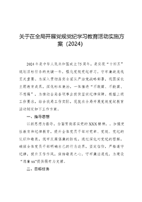 关于在全局开展党规党纪学习教育活动实施方案(2024)2024年是中华人民共和国成立75周年,是实现十四五规划目标任务的关键一年,强化党规党纪学习,守牢廉政底线至关重要。为深入贯彻落实全面从严治党战略部署,巩固深化主题教育成果,深化标本兼治,一体推进不敢腐、不能腐、不想腐,为推动全局各项事业提供坚实纪律保障。根据上级工作要求,结合我局工作实际,现就在全局开展党规党纪教育活动制定如下工作方案。一、指导思想以新思想为指导,全面贯彻落实党的XXX精神,。加强党性教育和纪律教育,提升全体党员干部对党章、党规、党纪的认识和敬畏,筑牢反腐倡廉的防线。通过深化对党纪的理解,确保全体党员干部明确自己的行为边界,坚定信仰,严格遵守纪律,提升工作作风,保持敬畏之心,守牢廉洁底线,为建设清廉xx提供强有力支撑。二、目标任务深入领会学习关于全面从严治党、党风廉政建设和反腐败斗争工作重要论述和最新指示批示精神,组织党员特别是党员领导干部认真学习《条例》,做到学纪、知纪、明纪、守纪,搞清楚党的纪律规矩是什么,弄明白能干什么、不能干什么,把遵规守纪刻印在心,内化为言行准则,进一步强化纪律意识、加强自我约束、提高免疫能力,增强政治定力、纪律定力、道德定力、抵腐定力,始终做到忠诚干净担当。三、工作安排本次党规党纪学习教育活动于4月至7月在全体党员干部中开展,重点在处级以上领导干部。具体安排如下:(一)进行工作动员部署1.深入学习关于全面从严治党、党风廉政建设和反腐败斗争工作重要论述和最新指示批示精神以及省委、市委要求。局党组召开专题会议,研究我局贯彻落实措施。2.制发工作方案。局党组制定印发《关于在全局开展党规党纪学习教育活动实施方案》,对全局开展党规党纪学习教育活动作出总体安排。成立局主题教育领导小组及办公室,明确内设机构和职责分工。3.召开工作会议。召开全局党员干部会议,由局党组书记和市委第x巡回指导组组长分别讲话,对贯彻落实中央和省委、文可居文库——海量学习资料,手机电脑均可下载www.wenkeju.com市委要求,扎实开展学习教育活动进行动员部署。(二)强化党规党纪学习1.突出学习重点。组织全体党员利用主题党日、集中学习、个人自学等方式深入抓好《中国共产党党章》《中国共产党纪律处分条例》《中国共产党问责条例》《中国共产党党内重要法规汇编》和《中华人民共和国监察法》《中华人民共和国刑法》等内容的集中学习教育,引导全体党员干部存戒惧、知敬畏、守底线 。用好学习强国干部网络学院等网络平台,开展好线上学随身学。2.举办专题读书班。分为四个专题举办读书班,每个专题安排 2 天时间进行集中学习,副处级以上干部参加。4月下旬、5月上旬,围绕重点学习内容,举办第一、第二专题读书班;5月下旬,举办第三专题读书班,6月中旬举办第四专题读书班。3.开展局党组理论学习中心组学习。把全面从严治党思想、党风廉政建设相关理论、党章党规党纪和《中华人民共和国监察法》等法律法规作为重要学习内容纳入理论学习中心组学习计划,中心组成员联系思想和工作实际深入交流研讨,重点交流运用党的创新理论解决实际问题的具体案例和体会,提出改进工作的思路措施。4.举办专题辅导培训。举办党纪党规专题辅导讲座,邀请文可居文库——海量学习资料,手机电脑均可下载www.wenkeju.com上级纪委监委领导或者市委党校教授到我局进行专题授课,教育引导党员干部增强党性观念、纪律规矩意识,自觉遵守党纪党规。5.讲好专题党课。局党组书记结合学习体会和实际工作带头讲专题党课,副局级以上领导干部到分管处室(单位)或所在党支部讲专题党课。各党支部书记在学习调研的基础上为支部党员干部讲专题党课。6.分类开展学习研讨。各党支部每月开展1次高质量主题党日,采取三会一课等方式,用好晨读学习平台,通过交流研讨、专题辅导等组织党员学习。组织党员到红色教育资源和党性教育基地开展学习,砥砺理想信念和初心使命。各群团组织采取座谈交流、青年学堂、主题征文、微课堂等形式,组织干部职工畅谈学习体会。采取上门送学、结对联学等方式,组织离退休干部职工党员和年老体弱党员学习。7.加强警示教育。在全局开展一次警示教育大会,组织全体党员干部参加,通报上年度查处的系统内党员干部严重违纪违法案件,使党员领导干部受警示、明纪法、促整改,进一步筑牢廉洁从政底线。要求每一位党员干部认真撰写心得体会,引导党员领导干部从典型案例中汲取深刻教训,深入开展交流讨论,引以为戒,严守党纪国法。文可居文库——海量学习资料,手机电脑均可下载www.wenkeju.com8. 召开案例剖析会。结合警示教育活动,联系思想和工作实际,综合近年来本单位发生的违纪违法典型案例,深入剖析案件发生的根源和危害,以案为鉴、以案促