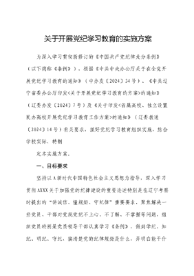 关于开展党纪学习教育的实施方案为深入学习贯彻新修订的《中国共产党纪律处分条例》(以下简称《条例》),根据《中共中央办公厅关于在全党开展党纪学习教育的通知》(中办发〔2024〕34号)、《中共辽宁省委办公厅印发<关于开展党纪学习教育的方案>的通知》(辽委办发〔2024〕7号)及《关于印发<省属高校、独立设置民办高校开展党纪学习教育工作方案>的通知》(辽委教通〔2024〕14号)有关要求,抓好党纪学习教育组织实施,结合学校实际,特制定本实施方案。一、目标要求坚持以A新时代中国特色社会主义思想为指导,深入学习贯彻AXXX关于加强党的纪律建设的重要论述特别是在辽宁考察时提出的讲诚信、懂规矩、守纪律重要要求,聚焦解决一些党员、干部对党规党纪不上心、不了解、不掌握等问题,组织党员特别是党员领导干部认真学习《条例》,做到学纪、知纪、明纪、守纪,搞清楚党的纪律规矩是什么,弄明白能干什么、不能干什么,把遵规守纪刻印在心,内化为日用而不觉的言行准则,进一步强化纪律意识、加强自我约束、提高免疫能力,增强政治定力、纪律定力、道德定力、抵腐定力,始终做到忠诚干净担当,在打好打赢学校迎评促建攻坚战之战,助力全面振兴新突破三年行动攻坚之年中勇挑重担、再创佳绩。二、工作安排学校党纪学习教育从2024年4月开始、7月结束,注重融入日常、抓在经常。(一)抓好处级以上领导班子和党员领导干部党纪学习教育1.做好个人自学。党员领导干部要认真学习AXXX关于加强党的纪律建设的重要论述,重温讲诚信、懂规矩、守纪律重要要求,坚持原原本本、逐章逐条学习《条例》,全面熟悉各项纪律要求,真正做到学懂弄通、熟练掌握,切实把《条例》学深学透学到位。2.集中学习研讨。处级以上领导班子要结合党委(党总支)理论学习中心组学习,紧扣党的政治纪律、组织纪律、廉洁纪律、群众纪律、工作纪律、生活纪律,分专题举办读书班,组织党员领导干部开展学习研讨,紧密联系思想和工作实际,讲认识感悟、讲收获体会、讲工作打算,实现学学相长、共同提高,推动《条例》入脑入心入行。3.开展警示教育。学习贯彻落实全省警示教育会议精神及2024年全省教育系统全面从严治党工作视频会议精神,召开全校警示教育会,深刻剖析近年来辽宁教育系统查处的典型案例,开展以案说德、以案说纪、以案说法、以案说责。全校各级党组织要结合实际,深度挖掘警示教育资源,运用违纪违法警示录、忏悔录、警示教育片、警示教育基地等,强化警示震慑,让党员、干部受警醒、明底线、知敬畏,推动以案促学促改促治。4.加强解读培训。认真学习中央媒体和共产党员网、中国干部网络学院等平台发布的解读文章和网络课程,依托辽宁省干部在线学习网开设专区,对《条例》进行解读。坚持贯通党纪教育和党性教育、廉洁文化教育,推动党员、干部把他律要求内化为自觉行动。把学习《条例》作为党员干部教育培训的必修课,纳入学校党校教学内容,突出抓好新提拔干部、年轻干部、关键岗位干部等重点对象的纪律培训,推动以训助学,筑牢思想防线。(二)抓实基层党组织和党员党纪学习教育1.组织全体党员学习。各党支部要在督促党员认真做好个人自学的基础上,采取三会一课、主题党日等形式,有计划地组织全体党员进行集中学习,围绕专题开展学习讨论,交流学习体会和感悟,深入学习把握《条例》的重要意义、重点内容和具体要求,切实增强贯彻落实的自觉性。2.讲好纪律党课。各基层党组织书记要在深入学习思考的基础上,结合实际讲1次纪律党课,重点讲学习《条例》的收获和感悟,讲运用《条例》的工作打算。用好党课开讲啦等载体,推出基层党组织示范微党课系列展播,进一步强化纪律意识,教育引导党员提升党性觉悟、严守纪法规矩。3.加强基层警示教育。各基层党组织要认真学习全省警示教育会精神,结合实际组织党员观看警示教育片、参观警示教育基地等,引导党员引以为戒、自觉自律。警示教育要紧贴党员工作和生活实际,精准选用高校等领域违纪违法典型案例,注重用身边事教育身边人,让警示教育更接地气、更有实效,切实推动师德师风、教风学风建设。4.注重丰富学习形式。运用学习强国学习平台、辽沈智慧党建云平台、辽宁高校党建公众号等多种载体开展在线学习。结合实际,充分发挥校级理论宣讲团作用,以通俗易懂的语言、生动具体的案例,把《条例》讲深讲透讲活。充分发挥高校智库优势,组织专家学者开展AXXX关于加强党的纪律建设的重要论述研究阐释,推出一批高质量研究成果。(三)全面总结运用学习教育成果把学习贯彻《条例》情况作为2024年度处级以上领导干部民主生活会和基层党组织组织生活会对照检查重要内容,推动党员特别是党员领导干部把自己摆进去、把职责摆进去、把工作摆进去,实事求是查摆自身不足,深入进行自我剖析,认真开展批评与自我批评,抓好整改落实。四、组织领导1.压紧压实责任。学校成立党委
