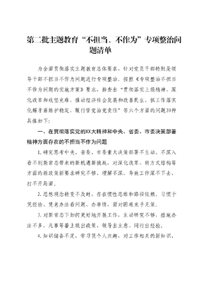 第二批主题教育不担当、不作为专项整治问题清单为全面贯彻落实主题教育总体要求,针对党员干部特别是领导干部不担当不作为问题进行专项整治。按照《专项整治不担当不作为问题的实施方案》要求,排查出贯彻落实上级精神、深化改革和攻坚克难、推动经济社会发展和改善民生、抓工作落实化解矛盾维护稳定、履行管党治党责任等六个方面的问题39种具体如下:一、在贯彻落实党的XX大精神和中央、省委、市委决策部署精神方面存在的不担当不作为问题1.研究思考中央、省委、市委重大决策部署不主动、不深入看不到新常态带来的新机遇新挑战,对深化改革、转方式结构等方面的新政策新要求研究不够、理解不深,导致工作深不下去、打不开局面。2.思想观念转变不及时,存在惯性思维和路径依赖。习惯于凭经验、凭老办法看问题、办事情,面对困难束手无策。3.对新常态下如何更好地开展工作,主动研究不够,措施办法不多,凡事等着上级出政策、领导出主意、同行出经验。4.知识储备不足,学习凭个人兴趣,对工作相关的新知识、新业务学习上没有积极性,指导工作时出现了本领恐慌、能力危机。5.对上级安排的任务敷衍了事、得过且过;对承担的工作能拖则拖,不推不动,甚至推而不动。6.执行重大问题、突发性重大事件请示报告制度不严格、不及时,报告内容不准确、不真实。二、在深化改革和攻坚克难方面存在的不担当不作为问题7.面对改革发展任务,不敢啃硬骨头,缺乏攻坚克难的志气、敢闯敢试的锐气、大胆负责的勇气,工作畏首畏尾,缺少大刀阔斧、奋力开拓的精气神。8.面对困难和矛盾,瞻前顾后、患得患失,凡事先想退路,只求自身安全,不想事业推进。9.在面对涉及改革发展稳定的重大难题时,该决策的不决策该拍板的不拍板,过度谨慎,工作效率低。10.在推动防范化解重大风险、精准脱贫、污染防治三大攻坚战方面,不敢啃硬骨头,不愿触及矛盾,工作长期没有实质性进展。11.不敢主动干事,怕干得多出错多,奉行多一事不如少事、为了不出事、宁可不干事。12.怕得罪人,不敢坚持原则,担心动了别人的奶酪,损害个别人的利益,将来会丢选票。13.怕承担责任,有些窗口单位和服务行业的干部,以没有明文规定为借口,该办的事不办或慢办,该落实的打折扣。办理项目审批时,害怕承担第一个盖章的责任,凡事都要领导出面协调14.面对可能发生的各种改革风险,没有责任感和自觉性,不把自己职责范围内的风险防控好,把风险的责任都推给上面,留给后面。15.不敢抛头露面,担心炒作曝光,不习惯在媒体关注和公众监督下开展工作,单位工作受到媒体聚焦、舆论监督时,不能积极应对。三、在推动经济社会发展和改善民生方面存在的不担当不作为问题16.不注重协调发展、均衡发展,唯GDP,重经济发展轻社会建设,缺乏统筹推进五位一体发展的自觉性。17.不深入基层、深入群众、深入困难艰苦地区调研,对群众的所思所想、困难问题了解得不多、不透、不深、不广,对群众的疾苦、心声反应迟缓。18.不树立正确的群众观念,在服务管理方面,讲方便执法多讲方便群众少,处罚制裁多、提供服务少,硬性管理多、柔性疏导少。19.对重点工程、重大项目抓得不紧、监管不严,工作推进缓慢或者问题频发。20.对专项资金使用监管不力,导致资金流失或侵吞、挪用专项资金的情况发生。21.不把对上负责和对下负责有机统一起来,重视对上负责,轻视或忽略对下负责,对领导安排的有关工作认认真真完成,对群众的合理呼声不认真研究。22.不重视培育发展的内生动力,只注重争取上级支持和借助外部力量。23.不认真执行限时办结、首问负责、一次告知制度,遇事相互踢皮球,让办事群众来回跑、转圈圈。四、在抓工作落实方面存在的不担当不作为问题24.不注重抓工作的主要矛盾和关键环节,不能做到全程指导跟踪问效,只重视做好上篇文章,不注重做好下篇文章。25.新官不理旧账,在落实地方或单位长远发展规划方面,该办的事情拖着不办,不能一张蓝图绘到底。26.创先争优意识不强,工作标准不高,不主动对标对表先进看不到与先进地区、先进单位的差距,看不到工作中存在的问题自我感觉良好,裹足不前。27.不愿做打基础利长远的事情,对易出政绩的工程项目研究多、投入大;对见效慢、打基础、矛盾多、难化解的工作研究少投入少。28.习惯当二传手、甩手掌柜,不愿亲力亲为,层层批办转办,导致工作被动落后。29.心思不在工作上,出工不出力,人在心不在,追求安逸舒适,做事打不起精气神,进取精神消退。30.落实工作阳奉阴违或者表态多调门高、行动少落实差,只做表面文章没有实际行动和措施。31.不从实际出发谋划工作,习惯将上级要求照抄照转,不结合基层的实际情况,不深入了解情况,不研究具体落实措施,上下一般粗,没有实效。32.大局观念、合作意识不强,对职责边界上的事推诿扯皮、互踢皮球,对全局性、整