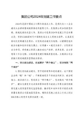 集团公司2024年党建工作要点2024年是新中国成立75周年的喜庆之年,是现代化××企业建设从全面部署到纵深推进的重要之年,是集团公司加快转型升级、跨越发展的攻坚之年。集团公司党委2024年党建工作总体要求是:坚持以XXX新时代中国特色社会主义思想为指导,认真落实新时代党的建设总要求,以党的政治建设为统领,以增强党组织政治功能和组织功能为重点,以清廉××建设为抓手,以创新活动为牵引,将党建工作深入融合到生产经营、改革发展、企业管理等工作全过程,以高质量党建引领高质量发展,为集团公司全面振兴新突破提供坚强政治保证。一、突出政治建设,忠诚拥护两个确立、坚决做到两个维护1.强化党的政治建设。坚守党的领导和党的建设,这个国有企业的根和魂,不断提高党员干部政治判断力、政治领悟力、政治执行力,坚定捍卫两个确立,坚决做到两个维护。健全完善党中央决策部署和市委市政府工作要求落实机制强化重大政策落实情况监督检查,推动党中央和市委市政府决策部署在集团公司落地落实落细,确保在思想上政治上行动上同以XXX为核心的党中央保持高度一致。2.强化党的创新理论武装。制定下发集团公司党委理论学习中心组学习重点安排,认真落实集团公司党委会第一议题、理论学习中心组学习制度,及时跟进学习XXXXXX最新重要讲话和重要指示批示精神、党中央最新重大决策部署,以及市委市政府新的工作要求等,坚持做到党的理论创新每前进一步,理论武装就要跟进一步。创新完善××制度,督促落实××制度要求,加大基层单位理论学习情况全覆盖检查力度,加强对基层党组织理论学习中心组学习的指导和监督,持续推动集团公司各级党组织在理论学习深化内化转化上下功夫。用好学习强国理论宣讲家园等学习平台,丰富宣教形式,增强政治理论学习的吸引力和感染力。3.强化意识形态工作。全面落实意识形态工作责任制,加大意识形态领域问题监测分析研判,定期研究意识形态工作,做好关键时期意识形态工作管理。严格管理集团公司所属各公司刊物网站、公众号等意识形态阵地,做好预见预警、分析研判、舆论引导,及时消除风险隐患,坚决守住安全底线。加大谈心谈话的力度,掌握了解干部职工思想动态,摸清思想底线,及时消除问题隐患。加强与市级以上主流媒体沟通协调,加大对集团公司贯彻落实市委市政府决策部署的重大活动,保障××、服务百姓的典型事迹的宣传力度,讲好××故事、传播××声音,掌握舆论宣传主动权话语权。二、夯实三基建设,增强党组织政治功能和组织功能4.全面加强基层党组织建设。始终坚持大抓基层的鲜明导向聚焦把基层党组织建设成为有效实现党的领导的坚强战斗堡垒要求,着眼增强党组织政治功能和组织功能目标,实施基层党建强基赋能××××工程,高标准谋划××××等党建工程,落实推进基层党建赋能高质量发展××条措施,着力解决党建与业务两张皮,党建工作上热、中温、下冷等问题。积极探索推进党支部评星定级管理工作,按照区分类别、试点先行、全面推广思路,着力锻造一批具有代表性示范性的先进党支部,以点带面,把各类基层党组织建设成为宣传党的主张、贯彻党的决定、领导基层治理、团结动员群众、推动改革发展的前沿阵地,全面推动集团公司基层党支部规范化、标准化建设。5.持续加强党务干部队伍建设。选优配强集团公司各级专兼职党务干部,积极落实定期轮训、任职培训制度,4月上旬,分层分类举办基层党组织书记、党务工作者专业培训班,打造一支政治过硬、党建内行、服务贴心党务干部队伍。积极推进各级机关党务干部与行政、业务干部的双向交流,保持党务干部队伍生机与活力。6.全面加强党员队伍管理。把重心放到加强教育管理、提高质量、发挥作用上来,严肃党内政治生活,规范党费收缴、使用管理,落实三会一课、组织生活会、民主评议党员等制度,着力增强党员意识、党规意识、党性意识。创新推行入党积极分子和发展对象群众双重推优、入党和转正双重政审制度,深入考察入党动机和政治素质,坚决把好党员发展入口关。三、聚焦中心大局,推动党建工作与企业发展深度融合7.积极发挥党建引领保障作用。坚持讲政治看忠诚、讲作风看担当、讲发展看成效,组织我为集团建设发展献一策大讨论、党员技能大比武,带动各级党组织和广大党员干事创业、建功立业。充分尊重党员主体地位,积极搭建党员先锋岗、责任区等有效平台,持续深化党员设岗定责、承诺践诺等活动,动员广大党员在党内事务、企业发展、志愿服务中挑重担、作先锋,进一步发挥先锋模范作用。8.持续擦亮党建服务品牌。围绕深入贯彻落实《集团公司党建工作与生产经营深度融合指导意见》,突出强化品牌效应积极发挥××创新工作室示范引领作用,注重系统思维、顶层设计,按照系统化、特色化抓建标准,指导各公司围绕生产经营、营商服务、安全管理、改革攻坚、风险防控