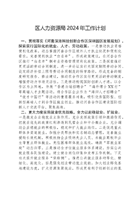 区人力资源局2024年工作计划一、贯彻落实《河套深港科技创新合作区深圳园区发展规划》,探索实行国际化的就业、人才、劳动政策。一是推动执业资格便利化改革。动态掌握河套合作区境外人才执业状况和便利化需求,完善便利执业白名单,形成政策建议,在河套合作区推行白名单制专业资格管理便利化政策。二是探索推行更灵活的劳动合同制度。进一步论证实行无固定期限劳动合同、设定经济补偿上限等劳动合同制度的科学路径,形成完备的制度研究报告、修法建议,推动在合作区实行更灵活的劳动制度,增强劳动力市场灵活性。三是推动构筑国际创新人才港。以合作区为主阵地,开展香港云端招聘会海外博士XX行等高端人才主题活动,将合作区企业作为海归人才招聘会优才中国行等活动的重要服务对象,吸引优秀国际型、创新型高端人才到合作区就业创业,推动河套合作区建设国际创新人才交流平台、聚集高地。二、更大力度实施就业优先战略,全力以赴稳就业、扩就业。一是激发企业稳就业主体作用。充分发挥政策引领和激励作用,把就业优先的政策红利渗透到民营企业和中小微企业,充分调动企业稳就业的积极性,稳定和扩大就业岗位。二是促进重点群体多渠道就业。加强分类帮扶和实名制动态管理,完善就业援助长效机制,积极扶持企业吸纳失业人员、未就业高校毕业生等重点群体就业,兜住困难群体就业底线,确保零就业家庭动态归零。三是推动全方位就业服务体系建设。夯实公共就业服务队伍建设,建立健全岗位归集和发布工作机制,下足功夫提升就业服务供给侧,推进公共就业服务均等化、精细化、高效化。四是强化创业带动就业效能。加大创业孵化基地建设力度,扩大资源集聚效应,形成更有利于创新创业的氛围,为各类创业人员在深发展提供优质条件,提高创业带动就业成效。三、聚焦产业发展,进一步优化人才结构、服务水平。一是塑造系列人才活动品牌。组织好优才中国行百博行海归人才招聘会等活动,扩大影响力,为XX人才队伍建设注入新鲜血液、增添新生活力。二是落实XX英才荟3.0政策。做好高层次人才、高技能人才奖励等政策落实。广泛铺开新政宣传,推动人才十三条新政落实落细,进一步增强XX人才政策磁吸力。三是培养未来湾区城市工匠队伍。积极向上争取市一类大赛承办权,掀起学技术、比技能的热潮,弘扬劳模精神、工匠精神。扎实推进粤菜师傅广东技工南粤家政三项工程,精心筹办深圳工匠节活动周,加快推广企业新型学徒制培训,为XX经济社会发展挖掘培养更多工匠型技术人才。四是推动人力资源服务产业园做大做强。充分利用毗邻香港、河套合作区的区位优势,引导园区机构加大国际交流力度,向高端业务、科创服务转型,实现规模化、智能化、国际化产业升级,推动产业园纳入国家级人力资源服务产业园。四、积极探索劳动关系治理发展新路径,提高智能化、精准化水平。一是全市率先落实无纸化办案改革。创新构建劳动人事仲裁全流程无纸化办案模式,显著缩短案件审理时间,为劳动者和企业提供优质仲裁服务。二是建立劳动争议案件在线调解、审理新机制。创新工作模式,加大互联网调解、审理和在线书面审理推行力度,充分发挥互联网+调解仲裁服务优势,提升办案质效。三是加强新业态劳动者权益保障。充分发挥社会调解组织劳资纠纷调解作用,培训200名劳动争议调解员,壮大新业态调解员队伍,推动劳资纠纷早发现、早处置。四是牵头做好保障农民工工资支付工作。加强联合执法,督促在建工程项目严格落实《保障农民工工资支付条例》,确保在国家、省、市对XX区保障农民工工资支付工作考核中,持续保持A等次。