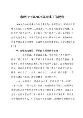 市局办公室2024年党建工作要点2024年办公室党建工作的总要求是:全面贯彻XXX新时代中国特色社会主义思想和XXXXXX对办公厅工作系列重要指示精神,坚定拥护两个确立、坚决做到两个维护,深入落实新时代党的建设总要求,以学习贯彻党的XX大精神为主线,围绕X战略,以党的政治建设为统领,全面提高机关党建质量,为建设X现贡献X力量。一、加强政治建设,不断夯实理想信念基础(一)筑牢忠诚,夯实政治根基。坚决捍卫两个确立,做到两个维护,深入开展对党忠诚教育、理想信念教育、党性教育、党章党规党纪教育,创新政治学习载体,组织政治理论测试,推动机关党员干部深刻领悟两个确立的决定性意义,增强四个意识,坚定四个自信,做到两个维护,不断提高政治判断力、政治领悟力、政治执行力。(二)加强学习,提高政治素养。严格落实第一议题第一主题第一专题制度,及时跟进学习XXXXXX重要讲话和指示批示精神特别是对办公室工作的重要论述精神,通过开展党组(党委)理论学习中心组学习、党组织书记讲党课、组织党员讲微党课等方式,引导党员干部自觉做XXX新时代中国特色社会主义思想的坚定信仰者和忠实实践者。按照党中央和省委、市委部署安排,深入拓展主题教育工作成果,抓好党的XX大和省市县最新会议精神学习宣传贯彻工作,坚决把思想和行动统一到党中央和省委、市委的决策部署上来,把智慧和力量凝聚到会议精神的贯彻落实上来。坚持理论武装同常态化长效化党史学习教育相结合,深入开展党员教育培训,引导党员干部常学常新、学以致用,切实把学习成果转化为打牢理想信念的政治自觉、思想自觉和行动自觉。(三)坚定信仰,守好阵地。认真落实X工作责任制和X工作责任制,加强思想政治工作分析研判,做好重大突发事件和热点敏感问题的思想引导,防范各种错误思想和腐朽文化的侵蚀。加强文化建设,统筹做好全民阅读、法治、国家安全、国防教育等活动。结合主题党日活动等契机,深入学习宣传伟大建党精神和红船精神,引导党员干部发扬斗争精神,增强斗争本领,守牢守好X防线。加强机关舆论阵地的建设管理,发挥好X微信公众号的作用,积极开展网上舆论引导工作,维护好意识形态安全。二、加强组织建设,不断巩固基层党建堡垒(一)强化政治责任,严格管党治党。全面落实《前面从严治党责任清单》要求,持续深化办公室主体责任、党委书记直接责任、党支部书记具体责任的机关党建三级责任制体系,层层压实机关党建责任,推动党建重点任务落实落地。坚持一把手亲自抓,加强对班子成员履行一岗双责情况的监督检查,全力支持配合机关党委高质量开展各项工作,推动党建工作落实见效。严格落实机关党委书记双向述职工作,抓好机关党支部书记年度述职工作并强化结果运用,推动机关党支部书记履职尽责,真正发挥好支部书记领头羊作用,更好建强支部堡垒。(二)强化组织建设,提升组织效能。认真贯彻落实《组织工作条例(试行)》,进一步优化机关党委配备设置,高标准配齐配强机关专职党务干部队伍。不断完善党委委员联系党支部制度,确保三会一课、主题党日活动、组织生活会和民主评议党员等党内政治生活规范落实。规范开展党员发展工作,持续优化党员队伍结构。以一线创优年活动为契机,围绕学习型、服务型、高效型、创新型、廉洁型机关建设,持续开展党建品牌创建活动,加强总结提炼和交流推广,扩大县委办机关党建影响力和示范带动效应,全面提升机关党建质量水平。(三)严格党员教育管理,提升党员先锋模范作用发挥。严格执行《组织工作条例》和《党员管理工作方案》,依托学习强国等APP,组织党员干部深入学习领会XXX新时代中国特色社会主义思想,认真落实政治理论教育、党章党规党纪教育、知识技能教育等七个方面基本任务。建立健全内部监督管理机制,严格落实党员领导干部双重组织生活、讲党课等制度,加强对党员领导干部和机关干部职工遵守党章党规党纪、贯彻执行党的路线方针政策情况的监督检查,强化年度述责述廉工作。三、强化责任担当,不断提升各项工作质效(一)建强干部队伍。严格落实领导班子理论学习中心组学习制度,采取集中深学、报告研学、党课讲学等形式,着力增强学习质效,全面提升班子理论素养。坚持以平时考核为抓手,深化X制度,全方位多角度总结工作、评判失误,确保机关各项工作有计划、高效率、零差错、落实处。组织开展干部作风整顿专项活动,着力解决办公室全体党员干部各项工作措施落实中存在的突出问题,教育引导督促全体干部职工作示范、勇争先,切实锻造委办过硬队伍。(二)办好党建活动。创新开展X活动,探索建立党员提、党支部议、党委定工作制度,鼓励党员干部对党建工作提意见、出点子、谋方法,为党组织创造性开展工作建强思想库。严格落实X等制度,组织年轻干部开展学习分享交流会推动理论学习由软知识变成硬本