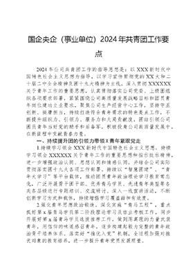 国企央企(事业单位)2024年共青团工作要点2024年公司共青团工作的指导思想是:以XXX新时代中国特色社会主义思想为指导,以学习宣传贯彻党的XX大和二十届二中全会精神及团十九大精神为主线,深入贯彻XXXXXX关于青年工作的重要思想,认真贯彻落实公司党委、上级团组织各项要求部署,紧紧围绕公司高质量发展战略目标和团员青年岗位建功立业要求,聚焦公司生产经营中心工作,坚持守正创新、挺膺担当,持续打造符合青年需求的特色亮点工作,不断提升组织力、引领力、服务力和大局贡献度,团结引领公司团员青年当好党的助手和后备军,积极投身公司高质量发展中,在新征程中贡献青春力量。一、持续提升团的引领力带领X青年紧跟党走1.持续学习领会XXX新时代中国特色社会主义思想。持续学习领会XXXXXX关于青年工作的重要思想和指示批示精神,进一步增强政治认同、思想认同和情感认同,并结合公司实际贯彻落实团十九大各项工作部署。持续以智慧团建、青年大学习等平台载体,推动团员青年政治理论学习教育常态化,广泛开展骨干团干部、优秀青马学员、先进青年典型等各类各层级进行专题培训、交流研讨、深入一线宣讲活动,不断创新学习方式和载体,持续增强学习覆盖面和有效度。2.强化青年思想政治锻造。深化实施青马工程,重点抓好第x届青马学员第二阶段理论学习及结业考核工作,同步开展好第x届青马学员选拔推荐工作,做到用真理的力量武装青年,用信仰的味道感召青年,逐步构建起较为完整的青年政治骨干培养体系。落实好推优入党机制,全过程加强对推优对象的教育培养,进一步提升青年党员发展质量。3.持续深化青年形势任务教育。围绕学习贯彻公司x职代会精神,引导青年正确认识当前企业面临的新问题和新挑战,明确青年肩负的责任和使命,团结和带领团员青年拼搏奉献,为企业持续稳定发展做贡献。通过座谈会、形势任务宣讲、专题团课、红色主题教育等形式,切实将公司工作思路传递到每一位青年职工,进一步统一思想、凝聚力量,切实将思想和行动统一为实现公司高质量发展强大的青春合力。4.扎实推进青年精神素养提升工程。按照《青精神素养提升工程实施方案》工作安排,紧扣岗位建功这一关键环节,聚焦公司第二十届一次职代会重点工作目标,团结动员广大X青年听党话、跟党走,在推动公司高质量发展的赛道上踔厉奋发、勇毅前行,不断推进青年精神素养提升工程走深、走细、走实。二、提升团的大局贡献度带动X青年助力中心1.持续推进青字品牌建设。聚焦集团公司坚持三商发展定位、构建三个系统产业布局、实施三步走工作安排,紧紧围绕公司重难点项目,组织基层团组织精准组建开展青年青年突击队、青年文明号、青年安全生产示范岗和青年岗位能手等活动,为青年职工岗位建功划分赛道,将育人与建功有机结合,做到关键环节有团员青年盯、关键时刻有团员青年顶,动员团员青年在急难险重新任务中打头阵、当先锋,在公司上下广泛营造奋斗是青春最亮丽的底色浓厚氛围。2.深入推进青年创新创效。进一步细化落实《集团团委关于组建青年创新创效联盟指导意见》,组织和引导广大青年职工立足岗位特点和企业发展实际,攻克生产难题、突破技术瓶颈,广泛开展技术创新、管理创新、营销创新、服务创新,为加快企业技术创新步伐,提高企业创新能力。通过扎扎实实开展青年创新创效活动,充分挖掘青年的创新潜力,激发青年的创新热情,培育青年的创新素质,促进青年成长成才,帮助青年实现自身价值。3.持续推进青年志愿服务。认真学习贯彻XXXXXX关于弘扬雷锋精神的重要论述精神,持续深化弘扬雷锋精神争做青年先锋、我为青年办实事实践活动。进一步动员青年职工积极参与到集团青年之家志愿服务队相关活动中,为服务队建设发展贡献力量。结合集团公司定点帮扶工作,持续开展献爱微公益·圆梦微心愿等活动。找准志愿服务定位、载体和路径,开展岗位学雷锋、普法宣传、生态保护、社区服务、社会关爱、助学助老等主题志愿服务活动,搭建青年职工展现国企担当的窗口,推动志愿服务工作实现常态化。三、持续提升团的服务力当好X青年的服务员1.逐步完善青年成才机制。按照集团公司团委要求,持续完善青年人才培养机制,持续强化青年工作体系,重点抓好青马工程青春建功推优荐才典型选树等工作,对青年人才培养实行全过程跟踪管控,广泛开展基层一线调研、面对面座谈会、问卷调查等活动,充分了解青年职工思想动态、工作实绩和发展潜力,统筹协调各方资源,回应解决青年职工合理诉求,确保青年职工真融入、人心稳、作风硬。着力筑牢新时代青年爱国统一战线,做好党外青年知识分子等工作,持续加强外埠团员青年管理工作。2.大力培养打造优秀青年人才。持续深化名师带高徒活动机制,做到一对一跟踪培养贯穿青年职业规划、业务技能和思想教育全过程,最大限度发挥优秀青年骨干传、帮、带作