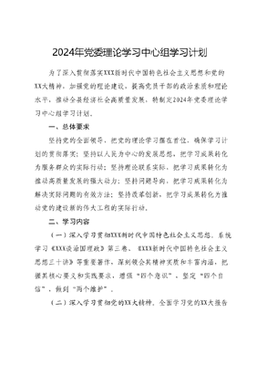 2024年党委理论学习中心组学习计划为了深入贯彻落实XXX新时代中国特色社会主义思想和党的XX大精神,加强党的理论建设,提高党员干部的政治素质和理论水平,推动全县经济社会高质量发展,特制定2024年党委理论学习中心组学习计划。一、总体要求坚持党的全面领导,把党的理论学习摆在首位,确保学习计划的贯彻落实;坚持以人民为中心的发展思想,把学习成果转化为服务群众的实际行动;坚持理论联系实际,把学习成果转化为推动高质量发展的强大动力;坚持问题导向,把学习成果转化为解决实际问题的有效方法;坚持改革创新,把学习成果转化为推动党的建设新的伟大工程的实际行动。二、学习内容(一)深入学习贯彻XXX新时代中国特色社会主义思想。系统学习《XXX谈治国理政》第三卷、《XXX新时代中国特色社会主义思想三十讲》等重要著作,深刻领会其精神实质和丰富内涵,把握其核心要义和实践要求,增强四个意识,坚定四个自信,做到两个维护。(二)深入学习贯彻党的XX大精神。全面学习党的XX大报告和党章修正案,深刻领会党的XX大的主题和主要成果,准确把握新时代新征程中国共产党的使命任务、战略部署和重大举措,为推进我县经济社会高质量发展提供坚强政治保障。(三)深入学习贯彻中央经济工作会议精神。深入学习中央经济工作会议精神,准确把握国内外经济形势和发展趋势,深入研究和解决我县经济发展中的突出问题,为制定和实施科学的发展战略提供有力支撑。(四)深入学习贯彻XXXXXX关于加强党的建设的重要论述。全面学习XXXXXX关于党的建设的重要论述,深刻领会新时代党的建设总要求和重点任务,加强党风廉政建设和反腐败斗争,不断提高党的建设质量和效果,推动全面从严治党向基层延伸、向纵深发展。(五)深入学习贯彻XXXXXX对人力资源和社会保障事业的重要指示批示精神。深入学习XXXXXX对人力资源和社会保障事业的重要指示批示精神,准确把握新时代人社工作的历史方位和使命任务,加强政策研究和宣传引导力度,推动各项决策部署落地落实落细,为我县经济社会发展提供有力保障。(六)深入学习贯彻全国组织工作会议精神。全面学习全国组织工作会议精神,准确把握新时代组织工作的新形势和新任务加强干部队伍建设和管理体制机制创新力度,为实现人才强县战略提供有力保障。(七)深入学习贯彻全国安全生产工作会议精神。全面学习全国安全生产工作会议精神,深入领会安全生产是民生大事的思想理念和责任担当,加强安全管理和应急处置能力建设,确保人民群众生命财产安全和社会稳定和谐。(八)拓展学习内容,关注时事热点。结合国内外时事热点和形势变化,适时安排学习相关内容,如国际形势分析、国内政策解读等,提高党员干部对国内外形势的敏锐性和洞察力。三、学习方法与时间安排(一)学习方法。采取集中学习、专题研讨、交流发言、个人自学等多种形式进行学习。集中学习由党委理论学习中心组组织,专题研讨围绕学习内容进行深入讨论,交流发言鼓励党员干部发表学习心得和体会,个人自学要求党员干部利用业余时间进行自学并做好笔记记录。(二)时间安排。全年共安排集中学习时间不少于12天,每次集中学习时间不少于3小时。具体时间安排可根据实际情况进行调整,确保学习计划的有序推进。四、保障措施(一)加强组织领导。成立由党委书记任组长的党委理论学习中心组领导小组,负责学习计划的制定、组织实施和监督检查各级党组织要切实加强对学习计划的组织实施和督促检查,确保学习计划落到实处。(二)加强学习管理。建立健全学习管理制度,完善学习考勤、学习笔记、学习交流等制度,确保学习活动的规范性和有效性。同时,加强对学习成果的评估和反馈,及时发现问题并采取措施加以改进。(三)加强宣传引导。充分利用各种媒体和渠道加强对学习计划的宣传引导力度,提高党员干部对学习计划的认识和重视程度。同时,通过举办学习成果展示、经验交流等活动激发党员干部的学习热情和积极性。(四)加强资源整合。充分利用现有资源,整合各方力量为学习计划提供有力支持。加强与党校、行政学院等培训机构的合作联系,邀请专家学者进行辅导授课或开展专题讲座等活动;加强与先进地区和单位的交流合作力度,借鉴先进经验和做法推动我县经济社会高质量发展。五、总结与评估在学习计划实施过程中,要定期对学习情况进行总结和评估及时发现问题并采取措施加以改进;同时将学习成果转化为推动高质量发展的实际行动和工作成效体现出来,确保学习效果真正发挥作用。在总结经验教训的基础上不断完善和提高学习计划和实施效果。