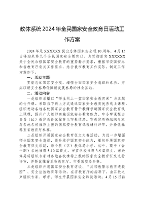 教体系统2024年全民国家安全教育日活动工作方案2024年是XXXXXX提出总体国家安全观10周年,4月15日将迎来第九个全民国家安全教育日。为贯彻落实XXXXXX关于全民加强国家安全教育的重要指示要求,根据市委国安办和省教育厅有关工作要求,结合我市教育工作实际,制定工作方案如下。一、活动主题贯彻总体国家安全观,增强全面国家安全意识和素养,夯实以新安全格局保障新发展格局的社会基础。二、活动内容一是组织录播以师生同上一堂国家安全教育课为主题的公开课。采取自下而上方式遴选国家安全教育优秀线上课程,组织发动各地各校国家安全教育骨干教师录制国家安全教育线上课程,提升广大教师实施国家安全教育能力。中小学课程由各县(区)教体局择优推荐至市教体局。市教体局将组织专家对各地各校推荐上报的国家安全教育课程进行评审,并择优推荐至省教育厅参赛。二是组织开展国家安全教育征文大赛活动。为进一步增强师生国家安全意识,提升维护国家安全能力,组织开展国家安全教育征文活动,每个县(区)教体局小学、初中、高中(含中职)各地推荐5-10篇征文,市直学校推荐3-5篇征文。市教体局将组织专家对各地各校推荐上报的国家安全教育征文进行评审,并择优推荐至省教育厅、市委国安办参赛。三是组织开展国家安全教育访谈、反邪教警示教育进校园、安全法治教育等活动。在省教育厅的指导下,由江教之声组织专家、学者、师生开展国家安全访谈活动;4月15日前后,各地各校可登录中国反邪教网观看警示教育宣传片,引导师生关注中国反邪教微信公众号,积极参与线上警示教育项目,提高师生防范邪教意识和能力。各地各校要广泛开展国家安全法、反分裂国家法、国防法、反恐怖主义法、数据安全法、生物安全法、网络安全法、反间谍法、反有组织犯罪法等涉国家安全法律法规的宣传教育,引导师生进一步增强安全意识和法治观念,自觉守法护法。同时,加强保密法规宣传教育,因地制宜开展密码安全宣传教育活动,提升师生保密意识。四是集中开展国家安全教育宣传推送活动。组织创作国家安全教育短视频、音频、图解、微动漫等新媒体产品,在微博、微信、公众号、工作群等平台加大推送宣传,扩大活动覆盖面和影响力,营造浓厚氛围。五是组织开展新时代新国安短视频征集比赛。围绕党的XX大对国家安全作出的重大战略部署,聚焦新时代国家安全取得的重大成就,反映人民群众不断增强的获得感幸福感安全感,以新时代新国安为主题,在全市范围内开展短视频征集比赛。各地各校要高度重视,认真组织,把好政治关、内容关,确保参赛作品体现党中央部署要求,具有较强的政治效益、社会效益。作品须以总体国家安全观为引领,体现大安全理念,独具创意、构思新颖、富有感染力。参赛作品须为原创,各地各校择优推荐1-2个参赛作品,作品时长5分钟以内。市委国安办将组织评审,并为获奖者颁发证书,择优推荐参加全省评比。三、活动要求一要加强组织领导。全市教育系统全面国家安全教育日活动在委局统一领导下,由分管领导具体指导开展,相关科室(单位)负责抓好落实。各地各校要增强责任意识,认真研究谋划,细化方案安排,注意密宣结合,精心组织实施。要加强与宣传部门的协调配合,综合提升活动质量和宣传效果,引导好涉国家安全舆论。二要创新方式手段。要认真贯彻落实总体国家安全观,全面规范使用全民国家安全教育日活动标识,创新内容载体,激发媒体融合活力。拓宽活动渠道,增强宣传教育的针对性、实效性。突出群众性,紧贴人民对更有保障的安全感需求,充分调动广大师生积极性,激发参与性,推出打造一批高质量作品,用丰富多彩、喜闻乐见的活动营造全民共筑安全屏障的浓厚氛围。三要加强舆论引导。在活动开展过程中,既要突出主题,注重宣传效果,又要准确把握意识形态工作特点,防范舆情风险,积极稳妥做好国家安全宣传教育工作。