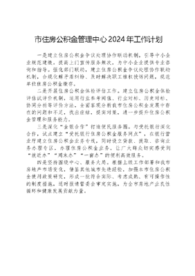 市住房公积金管理中心2024年工作计划一是建立住房公积金争议处理协作联动机制,引导中小企业规范建缴。提高上门宣传服务频次,为中小企业提供专业咨询和指导。强化部门联动,建立住房公积金争议处理协作联动机制,合规化解矛盾纠纷、及时解决职工维权投诉问题,规范单位住房公积金缴存。二是开展住房公积金体检评估工作。建立住房公积金体检评估试评价机制,运用行业参考阈值、行业对标、历史对标、协同分析等评价方法,全面客观分析我市住房公积金发展中存在的问题和不足,找出症结,提实对策,进一步提升住房公积金管理和服务能力。三是深化金银合作打造便民服务圈。与受托银行深化合作,试点建立受托银行住房公积金服务网点,在银行营业厅建立住房公积金业务专线,同时设立贷款、提取、咨询业务办理专区,办理住房公积金业务,让广大群众切实感受到就近办周末办一窗办的便利高效服务。四是坚持围绕中心、服务大局。根据上级工作部署和我市房地产市场变化,借鉴其他城市先进经验,加强本市住房公积金使用政策研究,形成一批符合实际、考虑成熟、有可操作性的制度措施,适时报请管委会审定实施,为全市房地产业良性循环和健康发展贡献力量。