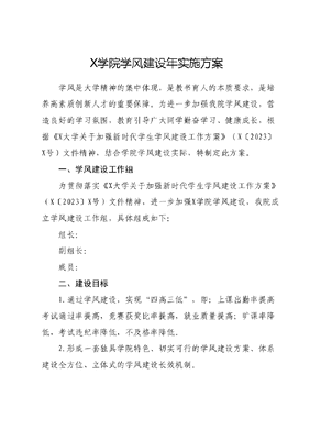 X学院学风建设年实施方案学风是大学精神的集中体现,是教书育人的本质要求,是培养高素质创新人才的重要保障。为进一步加强我院学风建设,营造良好的学习氛围,教育引导广大同学勤奋学习、健康成长,根据《X大学关于加强新时代学生学风建设工作方案》(X〔2023〕X号)文件精神,结合学院学风建设实际,特制定此方案。一、学风建设工作组为贯彻落实《X大学关于加强新时代学生学风建设工作方案》(X〔2023〕X号)文件精神,进一步加强X学院学风建设,我院成立学风建设工作组,具体组成如下:组长:副组长:成员:二、建设目标1.通过学风建设,实现四高三低,即:上课出勤率提高考试通过率提高,竞赛获奖比率提高,就业质量提高;旷课率降低,考试违纪率降低,不及格率降低。2.形成一套独具学院特色、切实可行的学风建设方案、体系建设全方位、立体式的学风建设长效机制。3.学风建设紧紧围绕学院人才培养目标,注重培养具备国际胜任力的新时代国际复合型人才——CCTV人才,即ComprehensiveCompetitiveCompetence综合竞争力、Cross-cultureCommunication跨文化交际能力、Trans-disciplinaryTalents跨学科交叉人才以及VisibleGlobalVision可见全球视野。三、主要措施及工作计划主要措施:(一)全员育人,形成学风建设合力(负责人:院领导、系主任、班主任、教务老师、辅导员、学生骨干)构建学院领导-班主任-教务老师-辅导员-学生骨干五位一体学风建设常态化机制。院领导高度重视,召开学风建设专题工作会议,成立学风建设工作组。院领导带头开展调查研究深入课堂与学生开展谈心谈话、学风调研,利用课间进行学风浸润,推动学风建设走深走实。班主任、辅导员召开学风主题班会座谈会,了解学生学习之困、生活之难,关注学生个体差异,制定针对性的帮扶措施。教务老师要与任课教师、辅导员保持密切沟通,及时反馈学风建设的情况和问题,做好学困生、学业预警学生的反馈提醒机制。学生骨干要发挥示范引领作用,自觉遵守纪律,积极参与课堂,带动周围同学共同进步。通过这种五位一体的学风建设常态化机制,形成齐抓共管、多方联动的工作格局推动学风建设不断向纵深发展。同时,要增强全体学生的主体意识和责任感,使他们在学风建设中既是受益者,也是参与者和推动者。(二)以教促学,以教风引领学风(系主任、任课教师)任课教师在学风建设中起着主导作用。任课教师要以身作则自觉遵守教学纪律,严于律己,做到不迟到、不早退,认真组织课堂教育教学活动,以渊博的知识浇灌学生,以独特的人格魅力吸引学生,以良好的教风影响学生,努力营造积极向上、健康和谐的课堂教学氛围。教学是第一课堂,要充分发挥第一课堂在学风建设中的作用,任课教师要明确课堂纪律,完善考勤制度,掌握学生的出勤率,对无故旷课的学生高度重视及时处理。对于多次无故旷课(单门课旷课三次及以上)的学生,任课教师要主动联系辅导员,说明情况,并采取适当的措施进行教育和管理。任课教师要着眼学生发展,因材施教,结合课程特点形成多元化的考核评价体系,以过程性考核为引领,加强对学生学习过程和进步程度的关注。通过定期的课堂测验、作业检查和阶段性评估,及时发现学生在学习中的问题,并提供有针对性的指导和帮助。任课教师要充分利用班委的力量,形成教学与学生自治的有机结合,借助班委的力量开展学风建设活动。各系要高度重视学风建设,系主任牵头召开专题会议传达学院学风建设年实施方案,结合学院文件要求布置本系学风建设工作,要求各任课老师自觉做好学风建设相关工作。(三)学以致用,以实践强学风(院领导、系主任、辅导员班主任、学生党员、团学骨干)立足专业特色,开展外语+志愿服务。依托院团委薜荔志愿者队伍多队并行的框架,充分利用我院外语专业资源,以正式党员、预备党员、发展对象、入党积极分子为主力,立足荔园面向社会,开展薜荔支教、优格小课堂(包含党史+英语课英语口语课、英语绘本课、英语配音课、西班牙语入门课等)、大学英语四六级助力课、学院大类平台课助教志愿服务项目、小语种入门课、校内大学英语视听说助教志愿服务项目等。鼓励学生发挥专业特长,参与外语外事、国际赛事、国际会议等国际化志愿实践,提高跨文化交流能力。与X市国际交流合作基金会等开展深度合作,打造更多国际化志愿服务项目,为我院学生提供更多外语+志愿服务的实践平台,促进学生在学中用,在用中学。着眼专业发展,开展专业实践。为提高学生的专业认同感,加深对专业发展前景、职业发展方向的了解,学院通过走出去请进来相结合的方式,广泛联系用人单位,开展专业实习实践、访企拓岗、交流访学等系列活动。不断探索就业育人新模式,我院与人力资源机构、用人单位合作,开展就业供需育人对接项目,建立产教融合实训基地,合