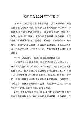 公司工会2024年工作要点2024年,公司工会工作总体要求是:以XXX新时代中国特色社会主义思想为指引,深入学习宣传贯彻党的XXX精神,深刻领悟两个确立的决定性意义,增强四个意识,坚定四个自信,做到两个维护,大力弘扬劳模精神、劳动精神、工匠精神,不断增强政治性、先进性、群众性,在公司成立60周年之际,引领广大职工凝聚干事创业的磅礴力量,以更高远的目标、更昂扬的斗志、更坚定的步伐,在新征程中奋力谱写铁军新篇章。一、强化政治建设,团结引领职工听党话跟党走1.发挥政治建设统领作用。坚持把提高政治能力摆在首位,将学习贯彻党的XXX精神及XXXXXX关于工人阶级和工会工作的重要论述,作为各级工会组织理论学习的重中之重,引导职工深刻领会党的XXX提出的新思想、新观点、新论断、新要求,坚持不懈用党的创新理论最新成果武装头脑、指导实践、推动工作,确保工会组织的政治性、先进性和群众性,不断提升政治判断力、政治领悟力、政治执行力。2.突出先进典型选树宣传。开展中国梦.劳动美主题劳模工匠座谈会和宣讲活动,在公司内弘扬劳模精神、劳动精神、工匠精神,培树职工身边看得见、摸得着、学得上的先进典型,把榜样力量转化为职工群众的生动实践。通过广泛宣传劳模工匠的先进事迹和崇高品格,积极开展劳模等先进人物选树评选工作,提升先进典型的影响力和美誉度,发挥劳模先进人物的示范作用和影响力,努力营造精益求精的敬业风气,增强职工对企业的认同感、归属感及忠诚度。3.创新多样开展群众教育。以公司成立60周年为契机,将主题宣传教育与党史学习教育结合起来,深化工运史宣传教育,把为群众办实事、解难题贯穿始终,充分运用多种学习平台,广泛开展以奋进六十载、阔步新征程为主题的群众性迎庆活动,致力于培养昂扬进取、积极向上的企业文化,增强广大职工听党话、跟党走的思想认同和政治认同。二、坚持以人为本,持续构建和谐劳动关系4.规范落实民主管理制度。贯彻落实《中华全国总工会关于推行企业集团职工代表大会制度的意见》以及《中国石化直属单位职工代表大会实施办法》,规范执行《公司职工代表大会制度》依法履行职代会职权,规范职代会民主程序;按照职工代表提案审理流程,充分发挥新一届职工代表提案审查委员会的组织协调作用,牵头组织相关部门对职工代表提案进行立案处理、分类答复、督促落实,完善职工代表提案闭环管理机文可居文库——海量学习资料,手机电脑均可下载www.wenkeju.com制,切实提高职工提案的办结率,引导职工代表有序参与公司治理,实现职工代表提案落实率、反馈率100%。5.坚持做好职工代表培训工作。为提升新一届职工代表综合素质,履行好民主参与、民主监督、民主管理职责,年内开展职工代表的权力义务、企业民主管理规定、劳动法规、劳动安全卫生规章制度等专题培训,并进行《集体合同》宣贯,增强职工代表参与度和责任意识,明确角色定位,提高履职能力,积极发挥播种机、宣传队作用,更好地维护职工合法权益,推动企业和谐发展。8.抓好集体合同履约检查。各级工会组织要坚持深入一线,积极做好劳动法律监督和法律服务,围绕劳动报酬、工作时间、休息休假、劳动安全卫生、职业培训、保险福利等事项,组织开展集体合同履约情况的监督和检查;深化走基层、访万家长效机制,组织两级工会下沉到基层一线开展职工思想动态调研和慰问活动,建立走访有报告,职工有评价的调研体系,听取职工心声,响应职工诉求,解决职工现实问题,凝聚共识、化解矛盾,推动公司高质量发展与维护职工权益相统一。三、开展劳动竞赛,融入企业中心工作文可居文库——海量学习资料,手机电脑均可下载www.wenkeju.com9.加强组织保障。建立健全各级劳动竞赛领导小组,形成党委领导、行政支持、工会运作、部门配合、职工参与的竞赛格局;聚焦企业转型升级和提质增效,搭建劳动竞赛平台,坚持目标和问题导向,强化引领、优化机制、加强管控,积极营造向劳动竞赛要效益、要效率的良好氛围。10.创新竞赛形式。强化竞赛顶层设计和选题立项,优化立项结构,避免形式主义。在重点项目、重大工程广泛开展主题劳动竞赛,加强与业主方的联建共建;在公司与相关业务系统、部门联动,围绕生产经营工作重点和难点,开展专项劳动竞赛。将五比一创与安康杯、工人先锋号及开展合理化建议等活动相结合,将竞赛指标分层次量化,细化到岗组、延伸到个人,做到精准施策。11.强化效果评估。发挥好绩效考核指挥棒作用,劳动竞赛与员工绩效及组织绩效考核挂钩,抓好过程管控,突出正向激励,激励职工创新记录、刷新指标,不撒胡椒面、不搞大锅饭,指标完成好的重奖,没完成的不奖。12.加大宣传力度。通过各种媒体进行广泛宣传和发动,使广大职工深刻认识劳动竞赛的意义和作用,提高参与竞赛积极性,对在劳动竞赛过程涌现出来