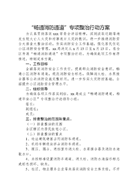 畅通消防通道专项整治行动方案为认真贯彻落实xxx常委会讲话精神,深刻汲取近期等地发生较大亡人火灾和村寨连片火灾的教训,进一步推进消防安全大排查大整治活动,夯实消防安全工作基础,强化居民住宅小区消防安全管理,xx局决定从x月15日至x月15日,在全区开展畅通消防通道专项整治行动。为确保此项工作有序推进,特制定本方案。一、工作目标全面落实消防安全工作责任,提高群众消防安全意识,畅通小区消防车通道,规范消防安全标志,保障消火栓、水泵接合器等公共消防设施完整好用,进一步夯实火灾防控基础,全面提升小区消防安全管理水平。二、组织领导为确保各项工作落实到位,xx局成立畅通消防通道,构建平安小区专项整治行动领导小组:组长:副组长:成员:三、排查整治的范围和重点。(一)排查整治的范围全区辖区内居民住宅小区。(二)排查整治的重点1、违法建筑堵塞占用消防车通道。2、机动车辆违法挤占消防车通道。3、埋压、圈占、遮挡室外消火栓、水泵接合器及消防水池取水口。4、未按标准设置消防车通道、消火栓、消防水池指示标志或标志损坏、缺失。5、社区、物业服务企业等未落实消防安全主体责任,不开展检查、巡查导致小区消防管理混乱。四、整治措施(一)依法拆除占用、堵塞消防车通道的违法建筑。(二)临时建筑、机动车辆违法挤占消防车通道,依法责令改正,拒不改正的依法处罚,并公布相关消防安全不良行为。(三)室外消火栓、水泵接合器及消防水池取水口被埋压圈占、遮挡的,一律恢复原状并从重处罚相关单位和个人。(四)未按标准设置消防车通道、消火栓、消防水池指示标志或标准损坏、缺失的责令立即整改,并处罚相关责任单位或责任人。(五)小区物业服务企业不落实消防安全责任的,责令整改,拒不整改的依法从重处罚并公布其不良消防安全行为。五、工作步骤(一)动员部署(8月20日前)。各级机构向属地政府及公安机关汇报活动安排,积极争取支持,全面部署此次活动,并结合辖区实际,制定工作方案,成立组织机构,明确工作职责,建立工作机制,迅速开展排查整治。(二)全面排查整治(8月21日至9月31日)。各级公机构联合公安派出所、社区、物业服务企业,对所辖小区按照标准全面进行排查整治,对检查的小区逐一登记造册、建立台帐,如实记载检查人员的姓名、检查时间、检查发现的问题和提出的整改意见。(三)检查验收(9月31日至10月15日)。各市机构按照专项整治标准组织检查验收。验收人员要按照谁验收、谁负责的原则,对验收抽查单位全部填写验收意见并签字存档。对验收发现排查不彻底、整治不到位的,应责令重新组织排查整治,验收合格后上报xx局,xx局适时组织对各地进行验收。六、工作要求(一)坚持政府主导,实行联勤联动。畅通消防通道,构建平安小区专项整治行动是消防安全大排查大整治活动的文可居文库——海量学习资料,手机电脑均可下载www.wenkeju.com一项重要内容。各级机构要在政府统一部署下,充分发挥公安派出所和社区作用,精心谋划,周密部署,严密组织。各地要成立专项整治指挥部,并提请公安机关分管领导为指挥长,指挥调度专项整治。(二)落实监管责任,严格高压执法。各级机构及公安派出所要明确工作任务,落实监管责任,依法查处火灾隐患和消防违法行为。对排查出的火灾隐患和消防安全违法行为按照全覆盖、零容忍、严执法、重实效的要求逐项整改。能立即改正的,要责令单位立即改正;不能立即改正的,要督促相关单位落实整改方案、整改责任、整改措施、整改时间和整改资金,采取有效措施,确保隐患彻底整改。各市支队要加强对基层消防大队、公安派出所的检查督导,制订并落实奖惩措施,确保工作实效。(三)明确主体责任,实行群防群治。各级机构要按照本方案要求,督促住宅小区及物业服务企业开展自查自纠。街道、社区要实行网格化排查整治,发动综治办、安监办、居委会、治安巡防队、消防协管队伍等基层力量,对辖区内居民住宅小区进行全面排查整治。(四)加大宣传力度,营造浓厚氛围。各地要结合火灾隐患现场拍和生命通道体验活动,深入辖区住宅小区开展针对性的消防宣传教育,引导广大群众了解、参与畅通消防通道,构建平安小区专项整治行动,同时利用96119火灾隐患举报投诉热线和各级媒体,发动群众举报投诉火灾隐患,加大对排查发现的火灾隐患和违法行为进行统一曝光,强化公众监督视野和深度,保持专项整治活动的强大声势和浓厚的舆论氛围。(五)做好灭火救援准备,提升应急救援能力。各级机构要立足实战,针对居民住宅小区火灾特点,制订完善灭火救援预案,加强熟悉演练,组织干部群众深入小区开展消防通道和消防水源普查及实地演练,强化装备器材保养维护,落实各项文可居文库——海量学习资料,手机电脑均可下载www.wenkeju.com执勤备战措施。文可居文库——海量学习资料,手机
