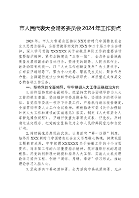 市人民代表大会常务委员会2024年工作要点2024年,市人大常委会坚持以XXX新时代中国特色社会主义思想为指导,全面贯彻落实党的XXX和二十届二中全会精神,深入学习贯彻XXXXXX关于安徽及阜阳工作的重要讲话重要指示精神,紧扣加快建设五市一城,全力争当县域高质量发展领跑者的目标任务,坚持党的领导、人民当家作主、依法治国有机统一,以人大工作创新发展年为主要抓手,在市委正确领导下,聚力中心大局、聚焦民生关切、聚合代表力量,全面履行宪法法律赋予的各项职责,高质量完成市委交办的各项工作任务。一、坚持党的全面领导,牢牢把握人大工作正确政治方向1.始终坚持党的全面领导。把坚持党的全面领导作为人大工作的根本遵循,坚决维护市委总揽全局、协调各方的领导地位,自觉在市委统一领导下开展工作,严格执行请示报告制度,全面贯彻市委人大工作会议精神,积极推进市委《关于加强新时代人大工作和建设的实施意见》落实,制定《人大常委会人事任免操作规程》,正确行使重大事项决定权、任免权,及时通过法定程序,把党的主张转化为全市人民的共同意志和自觉行动。2.持续强化思想理论武装。认真落实第一议题制度,始终用XXX新时代中国特色社会主义思想凝心铸魂,持续巩固主题教育成果,牢牢把握XXXXXX关于安徽工作的十个方面要求、对阜阳工作的六项重要指示精神,筑牢履职行权的思想根基。用党的创新理论统揽和指导人大工作,实施人大机关理论学习提升工程,创新周学、月研、季评学习形式,推动理论学习入脑入心。3.坚决落实市委决策部署。全力落实市委决策部署,充分发挥常委会党组领导作用,使人大工作与市委中心工作同频共振、同向同行。紧盯五市一城建设,开展专题助力活动。印发《2024年度乡镇民生实事项目人大代表票决制工作指导方案》,持续推进票决制工作。认真履行常委会班子成员链长制林长制和联系乡镇等包保责任,确保市委人大工作会议提出的目标任务一贯到底。二、坚持正确监督有效监督依法监督,着力推动经济社会高质量发展4.聚焦经济高质量发展加强监督。紧扣全市经济发展大局,定期听取审议计划、预算、国资管理、审计及整改工作整体报告,专项听取产业链发展、财政内控制度落实、重点工程项目审计、金融企业国资管理报告。紧扣打造一流营商环境,对行政审批服务标准体系建设进行调研,专题视察园区基础设施建设、创新平台共建、少数民族聚居区产业发展等工作。紧扣消费扩容提质,对体育产业发展进行综合调研,助力形成新型体育产业集群。5.聚焦法治建设加强监督。持续开展国家宪法日江淮普法行等活动,促进加强法治宣传教育。听取审议年度法治政府建设、规范性文件备案审查工作报告,促进法治能力水平提升。对《中华人民共和国道路交通安全法》,省、阜阳市优化营商环境条例开展执法检查,调研《中华人民共和国家庭教育促进法》《安徽省宗教事务条例》执行情况,促进相关法律法规在我市正确规范有效实施。听取审议法院执行工作报告、检察院民事检察工作报告,持续深化公安系统执法规范化建设联动监督,促进司法行政改革。6.聚焦城乡治理加强监督。持续关注城市功能品质提升工作,听取审议优化城市空间布局工作报告,调研旧城更新、老旧小区改造、引江济淮工程等工作,对解决城区停车难解决城区供排水问题等审议意见办理情况进行回头看。持续关注城市生命线安全工程建设,听取审议应急体系建设工文可居文库——海量学习资料,手机电脑均可下载www.wenkeju.com作报告,视察电梯安全管理、消防安全管理等工作。持续关注粮头食尾农头工尾畜头肉尾增值工作,听取审议巩固拓展脱贫攻坚成果同乡村振兴有效衔接报告,对绿色食品产业园建设进行视察。持续关注粮食安全工作,听取审议基本农田保护情况报告。7.聚焦民生福祉加强监督。强化对重点民生工程的监督,继续开展十件民生实事专题问政,视察小街巷治理等工作进展情况。强化对教育卫生工作的监督,听取审议义务教育优质均衡发展工作报告,视察中医药保护和传承等工作。强化对生态环境保护工作的监督,听取审议年度环境保护状况和环境保护目标完成情况报告,对黑臭水体治理工作开展市乡人大联合监督。强化对民生保障工作的监督,对社会救助体系建设进行调研,视察就业促进、老年助餐等工作。三、坚持代表主体地位,支持保障代表依法履职8.构建代表履职矩阵。提档升级代表活动室,探索设立企业家代表经济联系点、观察点,进一步健全代表家室站点建管用机制。加强与上级智慧人大对接,推广码上见代表便民程序。充分发挥人大英才汇聚、专业小组深度调研等专业优势,激发代表活力。督促法院、检察院健全联系代表制度,规范邀请人大代表参与听证、旁听,进一步形成良性互动的工作格局。9.丰富代表活动载体。扎实做好进选区、访选民关注民生提建议,五级代表在行动等工