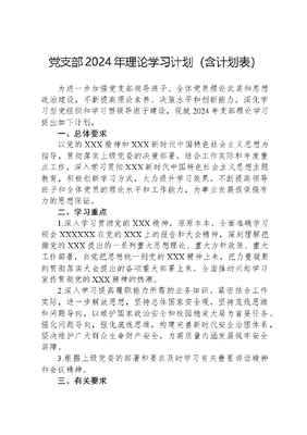 党支部2024年理论学习计划(含计划表)为进一步加强党支部领导班子、全体党员理论武装和思想政治建设,不断提高理论素养、决策水平和创新能力,深化学习型党组织和学习型领导班子建设,现就2024年支部理论学习提出如下计划。一、总体要求以党的XXX精神和XXX新时代中国特色社会主义思想为指导,贯彻落实上级党委的决策部署,结合工作实际和年度重点工作,深入学习贯彻XXX新时代中国特色社会主义思想主题教育,积极创新学习方式,大力提升学习效果,不断提高领导班子和全体党员的理论水平和工作能力,为事业发展提供强有力的思想保证。二、学习重点1.深入学习贯彻党的XXX精神,原原本本、全面准确学习领会XXXXXX在党的XXX上的报告和大会精神,深刻理解把握党的XXX提出的一系列重大思想理论、重大方针政策、重大工作部署,自觉把思想统一到党的XXX精神上来,把力量凝聚到贯彻落实大会提出的各项重大部署上来,全面推动兴起学习宣传贯彻党的XXX精神的热潮。2.深入学习提高履职能力所需的业务知识。紧密结合工作实际,进一步解放思想,坚持总体国家安全观,坚持底线思维和问题导向,以维护国家政治安全和校园稳定大局为首要任务。强化问题导向,强化底线思维,构建完善新时代安全治理体系,坚决维护广大群众生命财产安全,为高质量内涵发展筑牢安全屏障。3.根据上级党委的部署和要求及时学习有关重要讲话精神和会议精神。三、有关要求(一)高度重视。充分认识理论学习的重要意义,切实增强学习的自觉性和主动性。把理论学习与领导干部素质提升工程结合起来,努力提高政治思想觉悟、思想道德水平和整体素质,切实发挥表率作用。(二)严格制度。支部每月单数周周四组织理论学习,全体党员年度参加集中学习的出席率不得低于80%,特殊情况未能参加的,要事先向支部书记请假,事后通过自学补课,切实将理论学习落到实处。(三)增强实效。改进学习方法,把集中学习和专题研讨、撰写心得等有机结合起来,坚持学习理论与指导实践相结合,与专题研讨相结合,与研究解决具体问题相结合,切实推进学习成果转化。附件:党支部2024年理论学习计划表附件党支部2024年理论学习计划表序号学习时间学习内容形式12024年1月学习党的XXX报告自主学习22024年2月学习解放思想大讨论相关内容学习研讨32024年3月学习2024年中央1号文件集中学习4第十四届全国人民代表大会第二次会议《政府工作报告》学习研讨52024年4月学习XXXXXX关于国家安全的重要讲话精神集中学习6学习《XXX谈治国理政》第四卷学习研讨文可居文库——海量学习资料,手机电脑均可下载www.wenkeju.com72024年5月学习XXXXXX五一劳动节、五四青年节重要讲话精神集中学习8《XXX谈治国理政》(第四卷)集中学习92024年6月学习XXXXXX关于安全生产工作重要论述集中学习10《XXX关于全面从严治党论述摘编》学习研讨112024年7月学习XXXXXX关于党的历史及伟大建党精神的重要论述自主学习122024年8月学习XXXXXX关于党的历史及伟大建党精神的重要论述自主学习132024年9月学习XXXXXX关于抗战精神的重要论述集中学习14《XXX新时代中国特色社会主义思想学习纲要》学习研讨152024年10月学习XXXXXX在建国75周年的重要讲话集中学习16《XXX谈治国理政》(第四卷)集中学习172024年11月《XXX关于全面从严治党论述摘编》集中学习18《XXX新时代中国特色社会主义思想学习纲要》集中学习192024年12月学习XXXXXX关于交通安全的重要指示批示精神学习研讨20《XXX谈治国理政》(第四卷)集中学习注:以上学习内容可根据实际情况进行调整,根据上级党文可居文库——海量学习资料,手机电脑均可下载www.wenkeju.com委的部署和要求及时学习有关重要讲话精神和会议精神。文可居文库——海量学习资料,手机电脑均可下载www.wenkeju.com