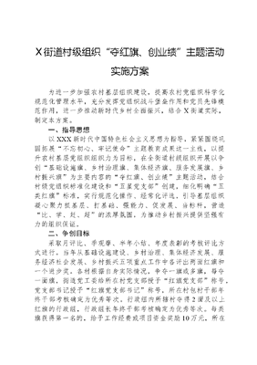 X街道村级组织夺红旗、创业绩主题活动实施方案为进一步加强农村基层组织建设,提高农村党组织科学化规范化管理水平,充分发挥党组织战斗堡垒作用和党员先锋模范作用,进一步推动新时代乡村全面振兴,结合X街道实际,制定本方案。一、指导思想以XXX新时代中国特色社会主义思想为指导,紧紧围绕巩固拓展不忘初心、牢记使命主题教育成果这一主线,以提升农村基层党组织组织力为目标,在全街道村级组织开展以争创基础设施旗、乡村治理旗、集体经济旗、服务发展旗、乡村振兴旗为主要内容的夺红旗、创业绩主题活动,结合村级党组织标准化建设和五星党支部创建,细化明确五类红旗标准,实行规范化操作、经常化评选,引导基层组织凝心聚力抓基层、打基础、强能力、促发展、当标杆,营造比、学、赶、超的浓厚氛围,为推动乡村振兴提供坚强有力的组织保证。二、争创目标采取月评比、季观摩、半年小结、年度表彰的考核评比方式进行。当年从基础设施建设、乡村治理、集体经济发展、服务经济社会发展、乡村振兴五项重点工作中各评出两面红旗和一个进步奖。各村根据自身实际情况,争夺一旗或多旗,每夺一面旗,街道党工委给所在村党支部授予红旗党支部称号,党支部书记授予红旗党支部书记称号,所在村包村干部年终干部考核确定为优秀等次。行政组内所辖村夺得2面及以上红旗的行政组,行政组长年终干部考核确定为优秀等次。每类旗获得第一名的,给予工作经费或项目资金奖励10万元,所在村党支部书记工作报酬标准每月上调300元,其他村干部上调200元;每类旗获得第二名的,给予工作经费或项目资金奖励5万元,所在村党支部书记工作报酬标准每月上调200元,其他村干部上调100元;每类旗中经综合评定整体工作或位次进步前移力度较大的,颁发进步奖,给予工作经费或项目资金奖励1万元;资金奖励和村干部工作报酬上调数额可累计叠加,同时提高红旗村年内建设项目匹配资金比例。街道党工委将评出的红旗村分类推荐给市委参加全市五星党支部的评选。三、评选标准(一)基础设施旗1、规划布局靓。村主次道路进行硬化、路肩规范整齐,进出畅通;规划合理,村内建有停车场;村口设置村名标识,沿街墙体美化。2、日常生活美。突出党建领航,展示乡土变迁,建有各具特色的村史馆或综合展馆;建设村民大礼堂,方便群众集会、开展活动和红白事操办;建设集食宿、健身、娱乐等功能为一体的养老服务中心;提倡建设垃圾分拣中心,垃圾收集分类整治有序。3、生态环境优。街道河道绿化标准较高,围村林栽植管护科学有力,国土绿化面积达到森林乡村标准,争创国家级、省级森林乡村;积极开展四园建设,充分利用空闲院、空闲地、废弃坑塘建设菜园、果园、花园和游园,利用率达100%。(二)乡村治理旗1、制度落实好。党员联系户、党员积分、红分管理、村民代表提案、小微权力等制度运行规范、落实到位,有台帐、有记录、有展示、有成效。2、文明创建好。建成高标准村级新时代文明实践站,并积极发挥作用。推行一约五会制度,广泛开展好媳妇、好婆婆、文明家庭、星级文明户、文明村等创评活动,定期开文可居文库——海量学习资料,手机电脑均可下载www.wenkeju.com展各具特色的文明创建活动。3、平安建设好。辖区内无刑事治安案件,无黑恶势力违法犯罪、无黄赌毒丑恶现象,无邪教组织及非法宗教活动;安装监控设施,实现村庄出入口、主要路段全覆盖;辖区无越级信访事件,无群体性事件,无公共安全及安全生产事故。4、探索乡村治理自治、法治、德治三治结合新形式,创成省级以上乡村治理示范村。(三)集体经济发展旗1、机构、制度健全。集体经济合作组织规范运营,每年制定目标明确、措施具体的村级集体经济高质量发展规划。2、集体经济发展快。村两委班子重视集体经济发展,按照一村多品、一村一业的发展格局,通过开发集体资源、盘活存量资产、建设经营场所、推行资本运营、发展飞地经济、推进土地流转、开展服务创收、加大招商引资、引导乡村合作等形式,有1个以上村集体经济特色产业示范基地或村集体经济增收产业项目,集体经济项目投入资金(含整合)500万元以上或集体经济经营性收入60万元以上的。(四)服务发展旗1、服务项目能力强。在征地、拆迁及重大项目建设等工作中,能够主动配合工作,积极发挥基层组织战斗堡垒作用,敢啃硬骨头,能够按照党工委、办事处规定的要求和节点完成重点任务,工作成绩突出。2、服务招商能力强。能够利用本村优势,积极主动开展大招商和回归工程,所招商项目质量较高,固定投资额超亿元的或招商项目每年增加税收500万元以上的。(五)乡村振兴旗在基础设施完善、乡村治理科学、产业发展高效、服务发展显著的基础上,形成村庄品牌和集聚效应。利用民俗传统文化、自然风光、历史人文资源、集体未承包地(林地、坑塘等),通过自主开发、村企联建