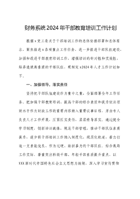 财务系统2024年干部教育培训工作计划根据x党工委关于干部培训工作的总体安排部署和总体要求,聚焦推进x各项重点工作任务,进一步推进干部队伍建设,加强和改进干部教育培训工作,增强培训的针对性和实效性,培养造就高素质的干部队伍,现制定x2024年人才工作计划如下。一、加强领导,落实责任坚持把干部队伍建设作为重中之重,全面部署全年工作任务。把加强干部教育培训、提高干部的综合素质和提升依法理财水平作为财政工作的重要内容纳入重要议事日程,并由专人负责人才工作开展,压紧压实责任,层层传导落实。通过健全学习制度,创新培训载体,规范干部管理,推动干部队伍素质提升,逐步将干部培训工作纳入制度化、规范化轨道,着力打造一支素能优良、作为过硬、敢拼善为的干部队伍。结合我局工作实际,着重突出科级干部、年轻干部素质提升重点,以XXX新时代中国特色社会主义思想为统领,深入学习宣传贯彻党的XXX精神,以改革创新为动力,以提高培训质量为核心,切实抓好2024年干部教育培训相关工作。二、工作重点及具体措施1、注重党员干部思想政治教育健全完善常态化学习机制,分专题学习《XXX谈治国理政(第四卷)》,持续跟进学习XXXXXX重要讲话和重要指示批示精神,在学懂弄通做实XXX新时代中国特色社会主义思想上下功夫,全面贯彻落实从严治党、思想建党、制度治党的要求,坚持围绕思想建党,突出抓好党的最新理论成果教育。组织全局干部学精神、悟原理,掌握核心要义,进一步增强党员干部政治意识、大局意识、核心意识、看齐意识,不断提高党员干部自我净化、自我完善、自我革新、自我提高能力,保持党的先进性和纯洁性。增强思想自觉与行为自觉,抓牢和拧紧思想、行动的总开关,使全局党员干部坚定政治立场方向,筑牢政治理论功底,提高政策运用能力,增强政治敏锐性、鉴别力和洞察力。2、突出抓好党员干部廉政教育文可居文库——海量学习资料,手机电脑均可下载www.wenkeju.com以对党的事业高度负责的态度,切实履行好一岗双责,把党的领导、全面从严治党体现在日常管理监督中,坚持把党风廉政建设与局业务工作一起部署,一起落实。年初局领导与各业务主管人员及二级机构负责人签订党风廉政建设责任书,要求党员干部切实履行一岗双责工作要求,一手抓业务工作,一手抓党风廉政建设,既要对本职工作负责,又要对职责范围内的党风廉政建设负责。通过推行廉政谈话制度,定期组织观看典型案例、违纪违法领导干部忏悔录等教育专题片,进行党纪党规教育和反腐败警示教育活动,深入开展对标活动,用身边人、身边事和正反两方面的经验教训,教育引导全体人员培养健康的生活方式,保持高尚的精神追求,筑牢拒腐防变的思想防线,做到真管真严、敢管敢严、长管长严。加大源头上预防和治理腐败力度,进一步健全廉政风险防控管理机制,建立长效机制,扎牢制度笼子,全面推进反腐倡廉各项工作,切实提高党员干部拒腐防变和抵御风险能力,防止违规、违纪和不廉洁行为,加快形成风清气正、崇廉尚实、干事创业的良好政治生态。文可居文库——海量学习资料,手机电脑均可下载www.wenkeju.com3、着力加强干部职工业务知识培训把加强会计队伍建设、提高财务人员业务素质,提升会计管理质量,作为支持全区人才战略实施的重要工作来抓。围绕建设为民理财、依法行政、廉洁高效的财政干部队伍目标,加强财政干部队伍执政能力建设,采取走出去、请进来,集中学习与个人自学相结合、书本学习与网络学习相结合的方式,按照缺什么、补什么要求,对全体人员进行业务培训,着力加强财政法制建设,提高依法理财水平,全面推进依法行政,不断提高财政干部执政能力。定期组织我局干部职工进行业务知识学习、岗位轮训、技能比赛、岗位比武,坚持优中选优,突出先进典型示范带动作用。派出人员参加上级财政部门举办的培训班,针对财政工作中的新政策、新理论、新知识、新问题适时进行业务培训,从而达到不断优化财政干部知识结构、更新财政干部知识内容,提升干部职工整体素质和业务能力水平的目的。4、注重日常学习,提高创新创优能力文可居文库——海量学习资料,手机电脑均可下载www.wenkeju.com通过健全完善集中理论学习、三会一课、主题党日等制度,制定年度学习计划,加强党员干部学习教育培训。采取专题辅导、座谈交流、业务大讲堂,收看专题片、邀请行业专家教授和上级财政部门业务骨干进行专题讲座、推荐必读书目等灵活多样的形式,组织干部职工集中学习交流。通过坚持规范化、常态化学习,促使干部养成自主自觉学习的良好习惯,在日积月累中不断提升综合素质和业务能力。5、注重提高预算单位财务人员业务素质针对我区部分单位和财务人员法制意识淡薄,财政财务知识匮乏,有些已触及到法律道德底线,为加强财政资金的规范管理带来很大阻力;部