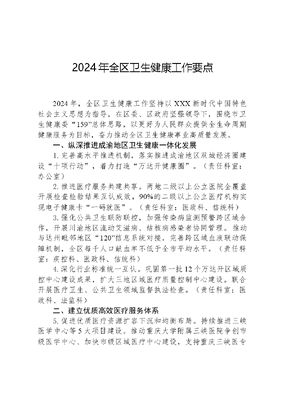 2024年全区卫生健康工作要点2024年,全区卫生健康工作坚持以XXX新时代中国特色社会主义思想为指导,在区委、区政府坚强领导下,围绕市卫生健康委159总体思路,以更好为人民群众提供全生命周期健康服务为目标,奋力推动全区卫生健康事业高质量发展。一、纵深推进成渝地区卫生健康一体化发展1.完善高水平推进机制,落实推进成渝地区双城经济圈建设十项行动,着力打造万达开健康圈。(责任科室:办公室)2.推进医疗服务共建共享。两地二级以上公立医院全覆盖开展检查检验结果互认成效,90%的二级以上公立医疗机构实现电子健康卡一码就医。(责任科室:医政科、信统科)3.强化公共卫生联防联控,加强传染病监测预警跨区域合作,开展川渝地区流动艾滋病、结核病感染者协同管理。推动与达州毗邻地区120信息系统对接,完善跨区域血液联动保障机制,全区每千人口献血率不低于全市平均水平。(责任科室:疾控科、医政科、信统科)4.深化行业标准统一互认。巩固第一批12个万达开区域质控中心建设成果,扩大三地区域医疗质量控制中心建设。联合开展医疗卫生、公共卫生领域监督执法检查。(责任科室:医政科、法监科)二、建立优质高效医疗服务体系5.促进优质医疗资源扩容下沉和均衡布局。持续推进三峡医学中心等5大项目建设。推动重庆大学附属三峡医院争创市级医学中心、加快市级区域医疗中心建设,支持重庆三峡医专附属中医院创建三甲中医医院、区妇幼保健院建设区域妇幼保健中心。(责任科室:规财科、医政科、妇幼科)6.提升专科专病能力。推进2个国家级临床重点专科、2个市级重点专科建设。争创2025年市级重点专科培育项目2个。加快推进基层医疗机构特色专病、专科建设。(责任科室:医政科)7.推进城乡医疗卫生融合发展。建立健全医学检验、医学影像、心电诊断三大远程诊疗中心。(责任科室:医政科)8.实施优质服务基层行活动和社区医院建设三年行动。加快推进分水、龙沙、龙驹3个区县域医疗卫生次中心建设,争创甲级基层医疗卫生机构3家、社区医院1家、五星级村卫生室9家。提升基层儿科、全科和呼吸道感染疾病临床诊疗能力。(责任科室:基层科、医政科、规财科、人事科、信统科)三、提升公共卫生服务能力9.推动疾病预防控制事业高质量发展,启动区域疾控机构建设。新创建公共卫生重点专(学)科2个。争取公共卫生医师处方权试点和疾控监督员试点。(责任科室:疾控科)10.实施遏制艾滋病和结核病专项行动。艾滋病全人群检测率达到40%,老年人群检测比例提高到35%;65岁及以上老年人结核病主动筛查比例达50%。继续为初二年级在校女生提供HPV疫苗免费接种服务。结核病报告发病率40/10万以下。(责任科室:疾控科)11.贯彻落实全市精神卫生体系建设三年行动计划,基层精防人员与患者比例达1:80。对严重精神障碍患者全面实施多部门联合分色管理。在知情自愿基础上推进儿童青少年心理健康筛查,儿童青少年心理健康核心知识知晓率达80%以上。(责任科室:疾控科)12.加强国家战略腹地医疗救援能力建设,制定平急两文可居文库——海量学习资料,手机电脑均可下载www.wenkeju.com用公共基础设施建设实施方案,构建全维健康医疗救治保障体系。(责任科室:规财科、疾控科、医政科)13.提升卫生应急救援能力。制定紧急状况下卫生应急工作方案,推动符合条件的社区卫生服务中心纳入院前急救网络。(责任科室:疾控科)四、深化医药卫生体制改革14.推进紧密型县域医共体建设,探索基层横向紧密型医共体,推动牵头医院人员、技术、服务、管理下沉。(责任科室:办公室、人事科、医政科)15.深化县聘乡用乡聘村用改革。全区按新招录执业医师类人员的80%,下派县聘乡用人员,并逐步延伸到药学类、护理类、医技类人员。完善乡村医生社会保障政策,实施大学生乡村医生计划。(责任科室:人事科、基层科)16.深化公立医院改革。深入开展二三级公立医院绩效考核,落实公立医院高质量发展评价机制。(责任科室:医政科)17.持续推广三明医改经验。促进医保、医疗、医药协同发展和治理。指导医疗机构做好DRG支付方式改革、职工医保门诊共济改革。探索建立全区医疗单位重点设备、高值耗材采购价格共享机制和带量采购。协同推进医疗服务价格改革,试点开展中医优势病种按疗效价值付费改革。规范民营医院发展。(责任科室:办公室、规财科、医政科)18.推进区委三个一批重大改革,完成数字医学影像服务改革推进优质医疗资源靠近老百姓等7项改革,推进健全平急结合医防协同机制健全医养结合服务体系等3项改革。健全重大改革闭环管理工作机制,确保改革取得实效。(责任科室:办公室、医政科、信统科、基层科、家发科、老龄科、疾控科)19.深化药学服务改革。探索建立总药师制度。推进市级临床药学重点专科建